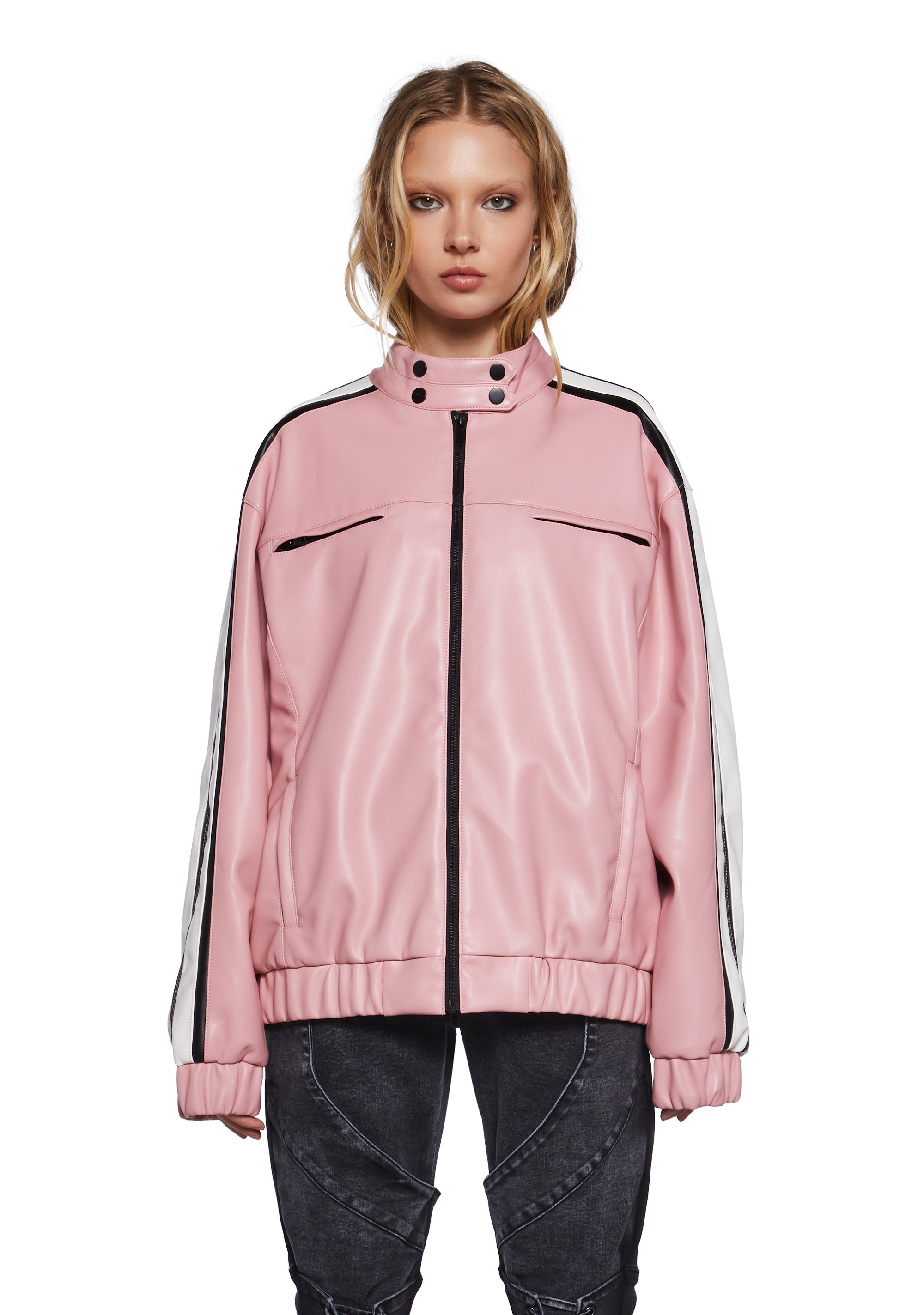This jacket has a vega leather construction, striped sleeves, elasticated cuffs and waist, zippered chest pockets, side pockets, a collared neckline with button closures, and a front zipper closure.