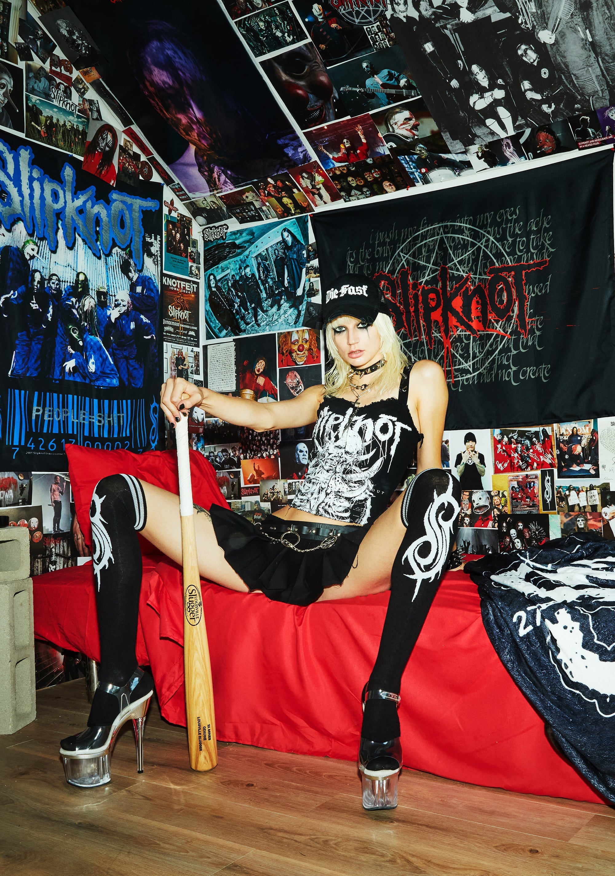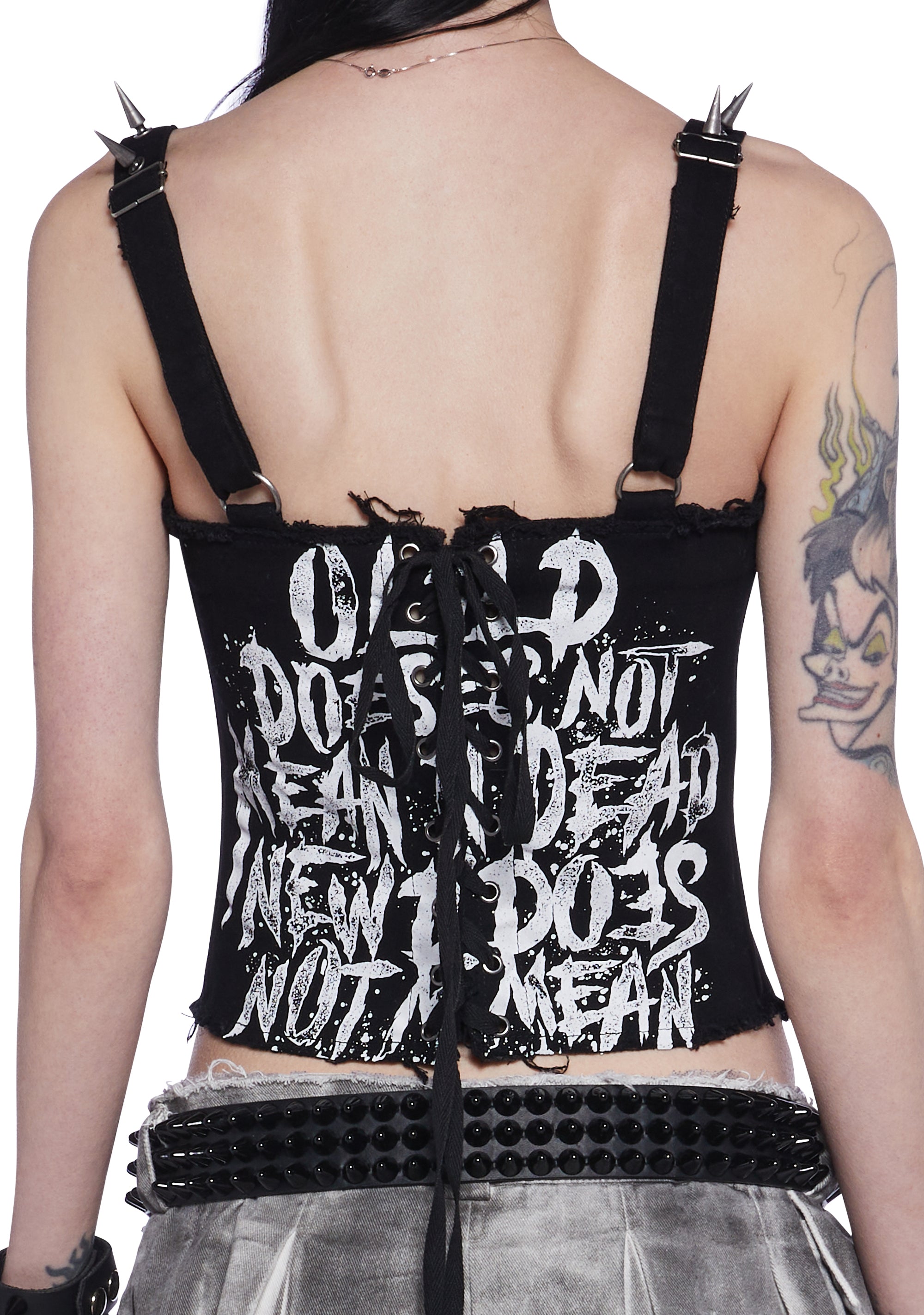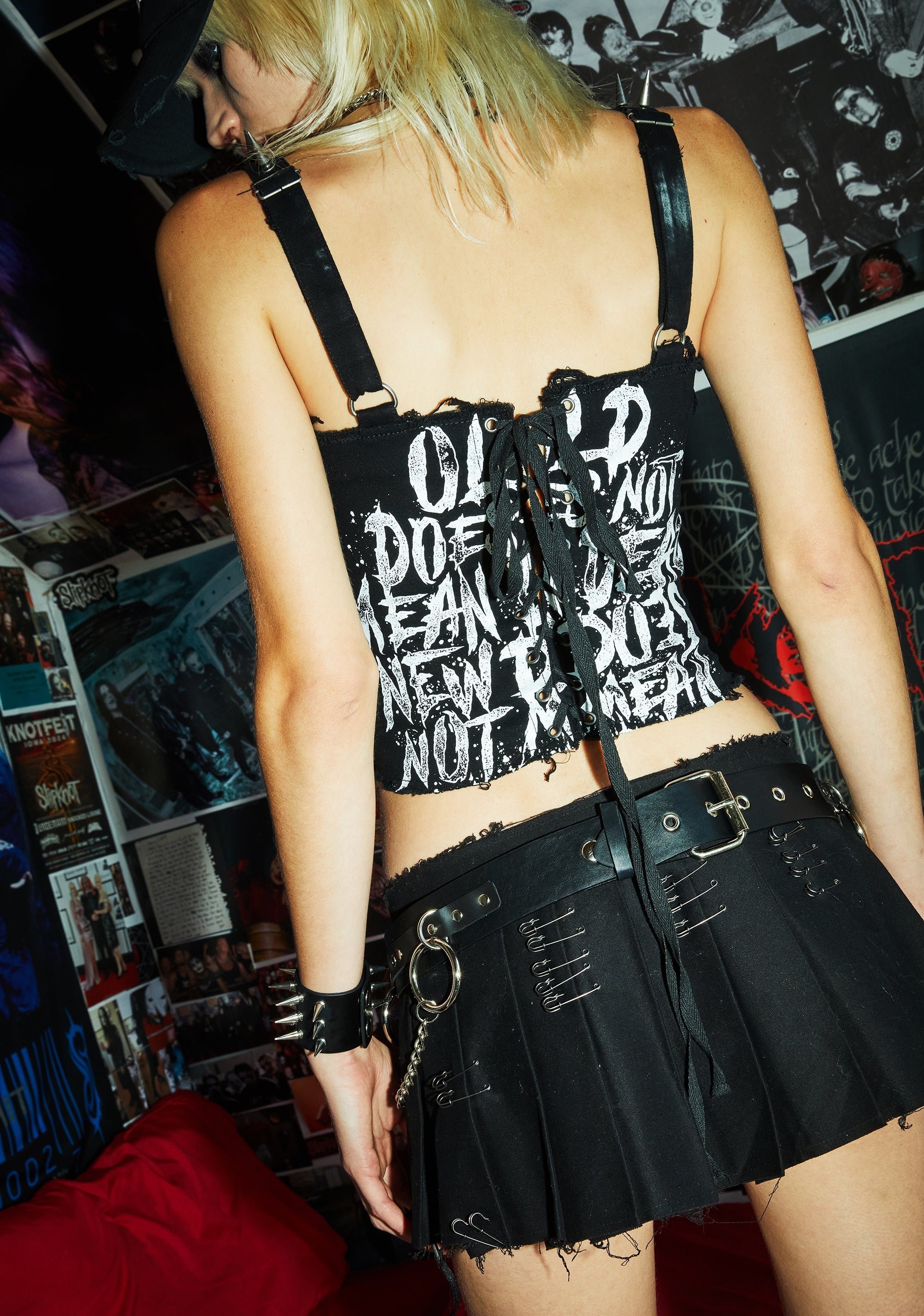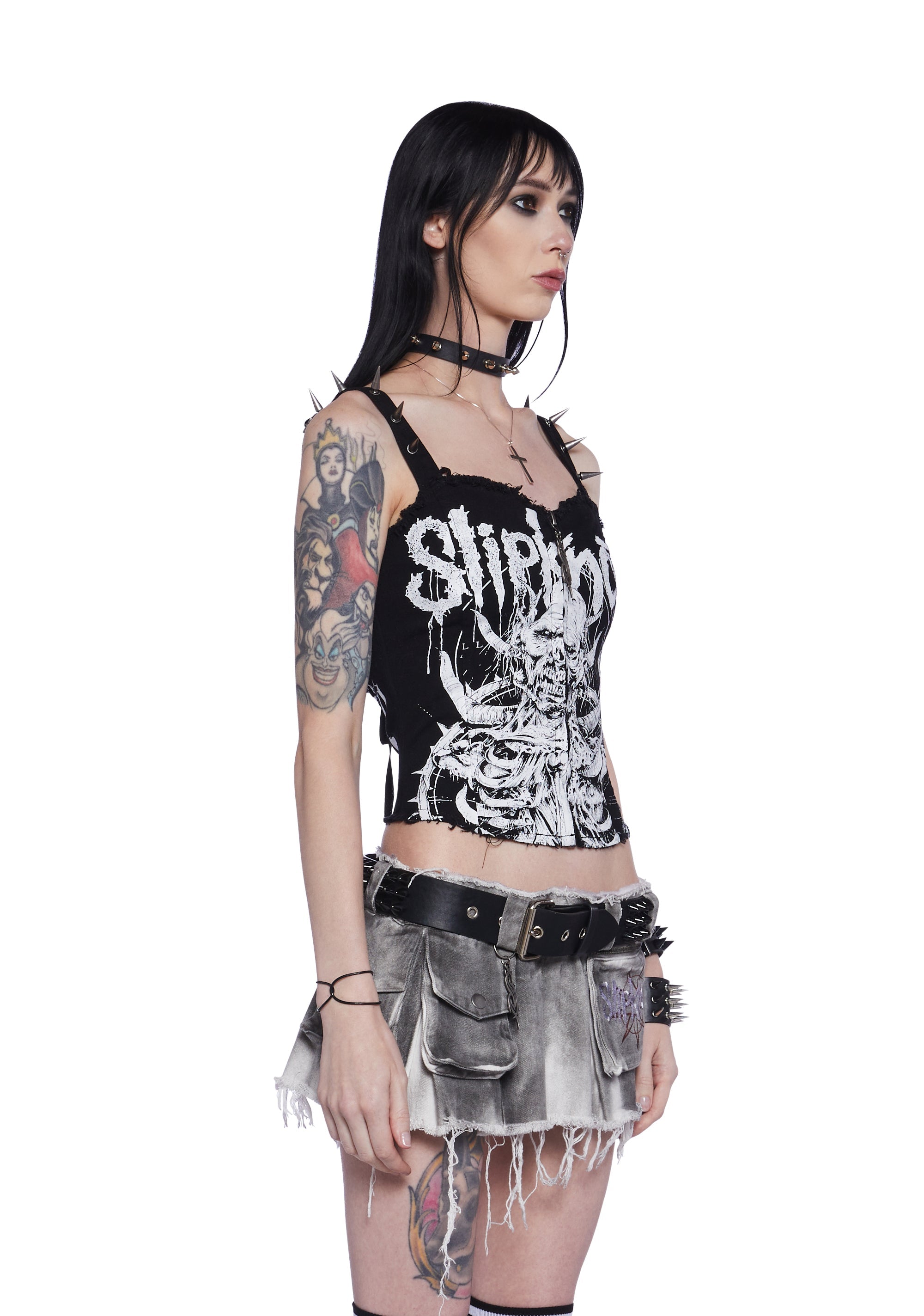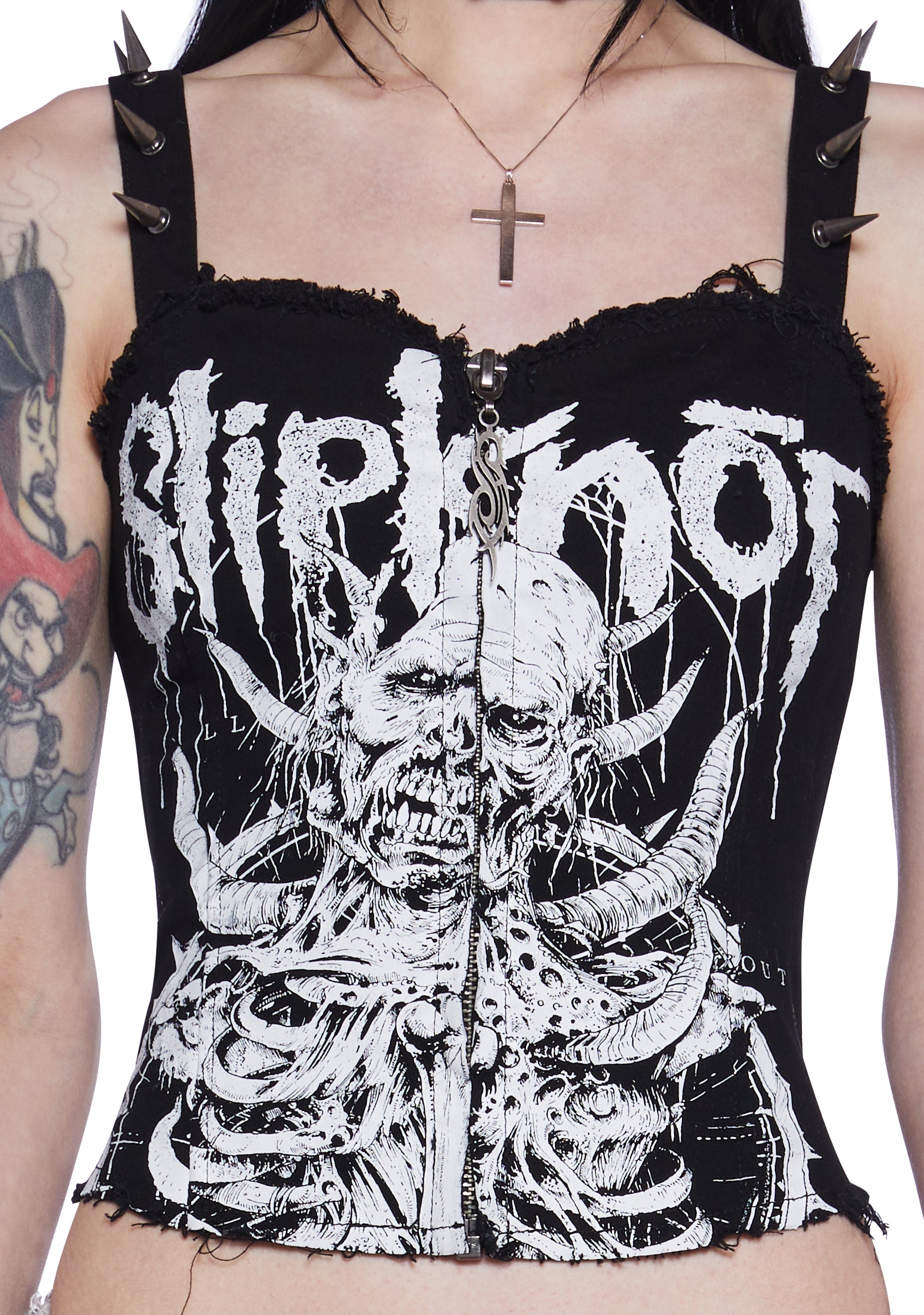 This corset top has a twill construction with structured boning, the Slipknot band logo and monster graphic on the front, spike detailing on the adjustable shoulder straps, song lyrics ‘Old does not mean dead, new does not mean best’ printed on the back, a back lace-up closure, a raw hem, and a front zipper closure with the band logo as the zipper pull.