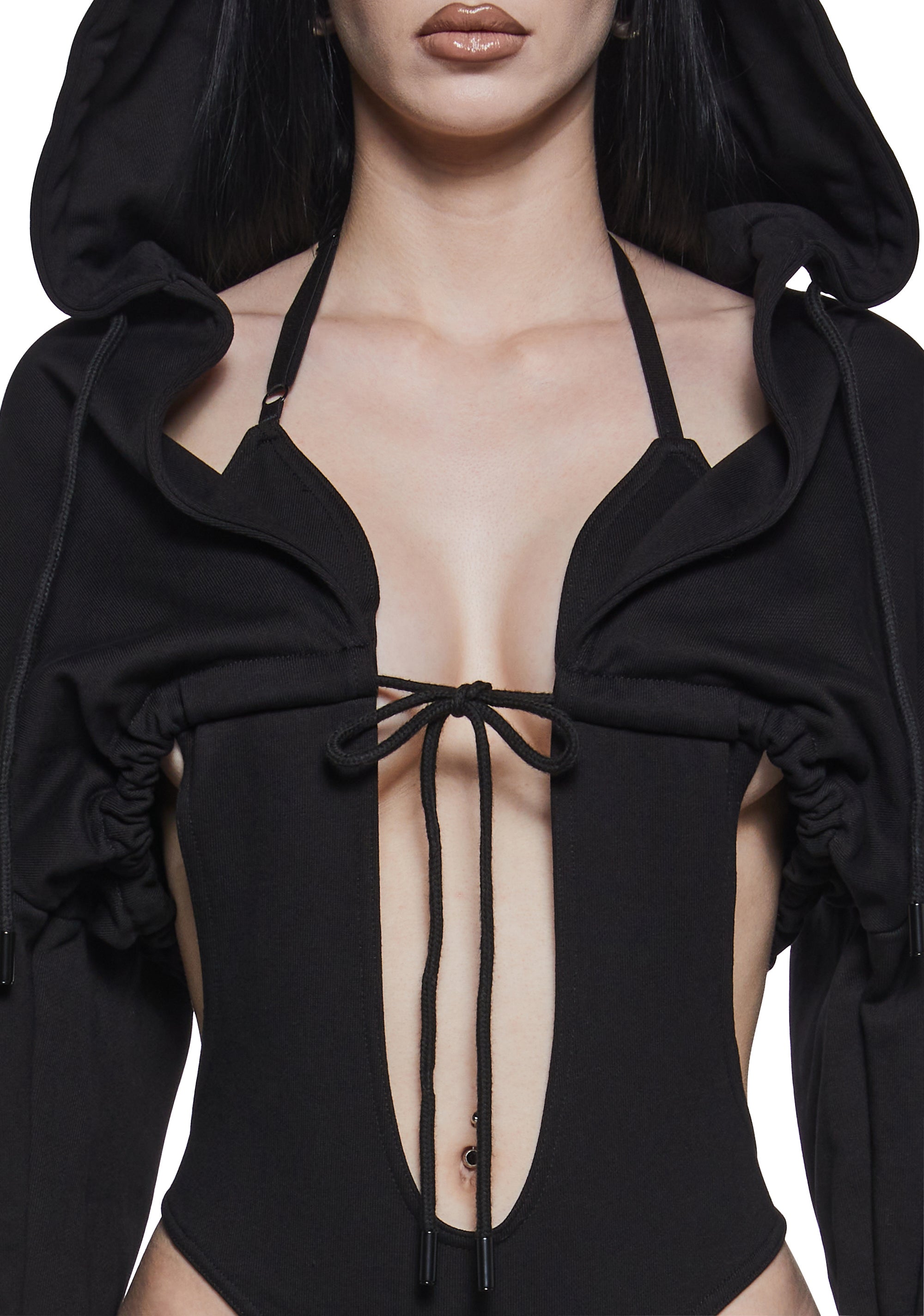 This bodysuit has a heavy cotton construction,front adjustable drawsting closures,drawsting hoods,elasticated cuffs and hem, and an adjustable elastic string back with metal ring.