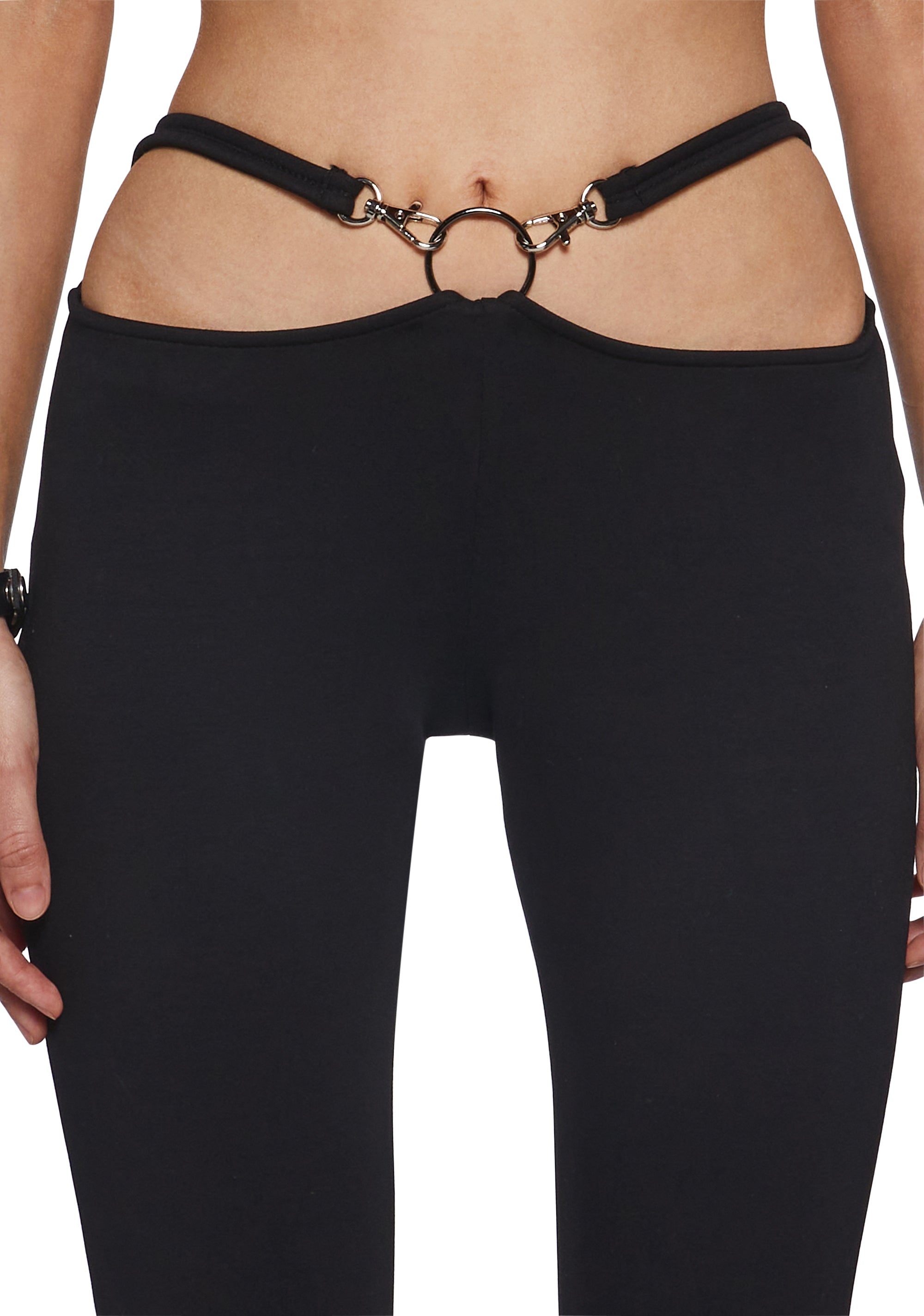 In a stretch cotton construction. With cut-out details, O-ring hardware, and straps with clip-on lobster claw closures.