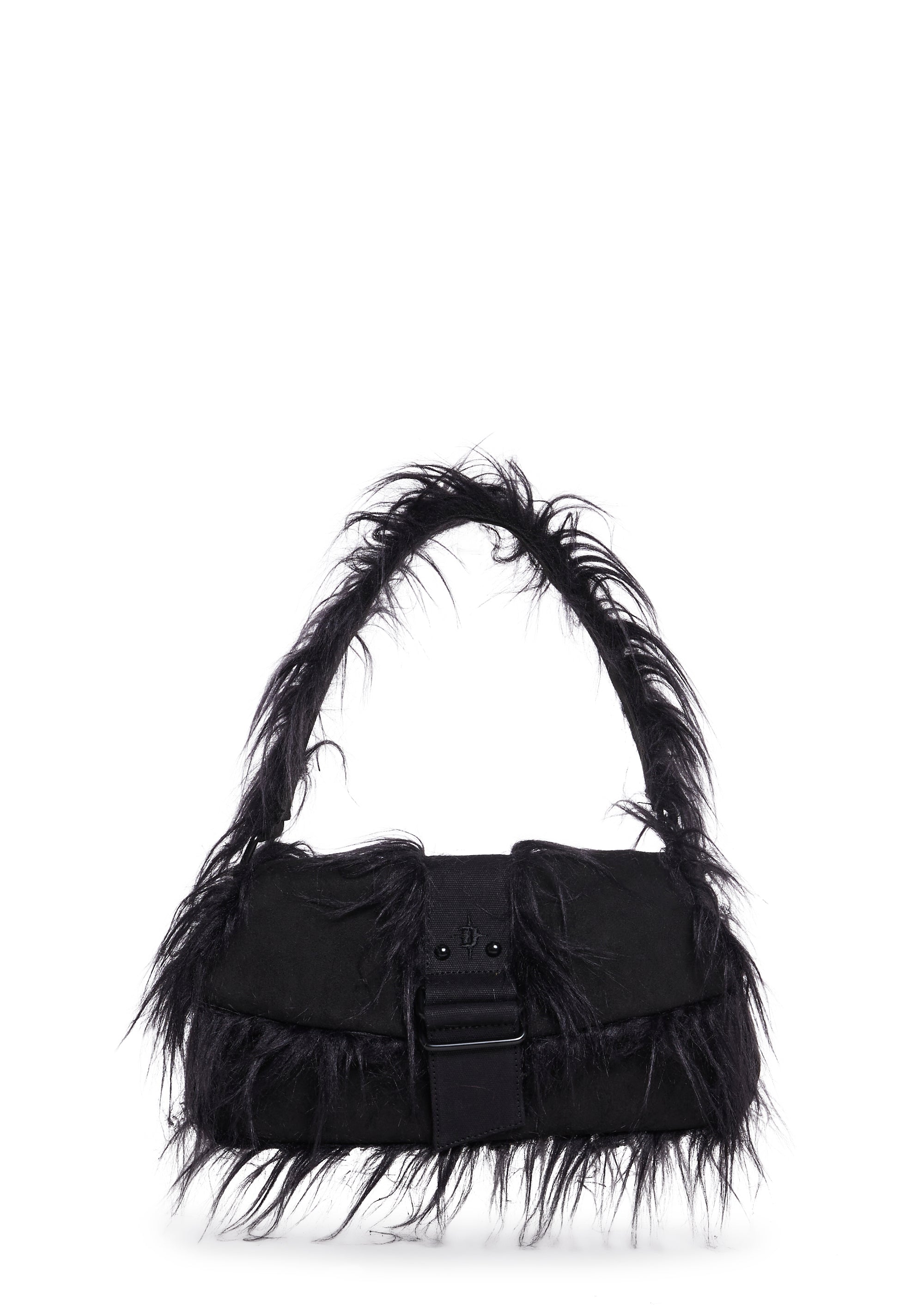 In a faux suede construction.With a faux shaggy hair trim, interior pockets, a flap with a decorative belt, studs, embroidered “D” logo on the front, a shoulder strap,and snap button closures.