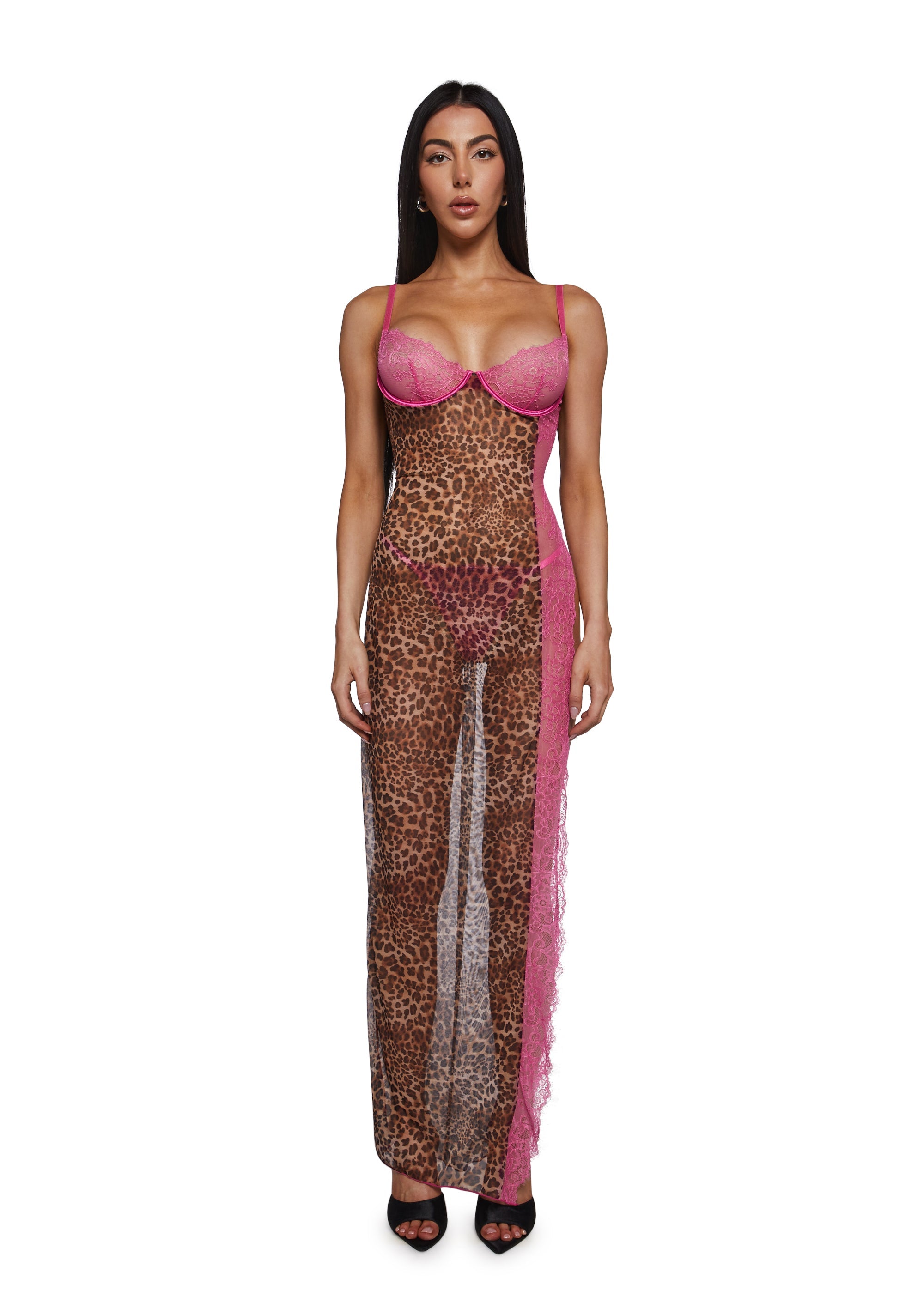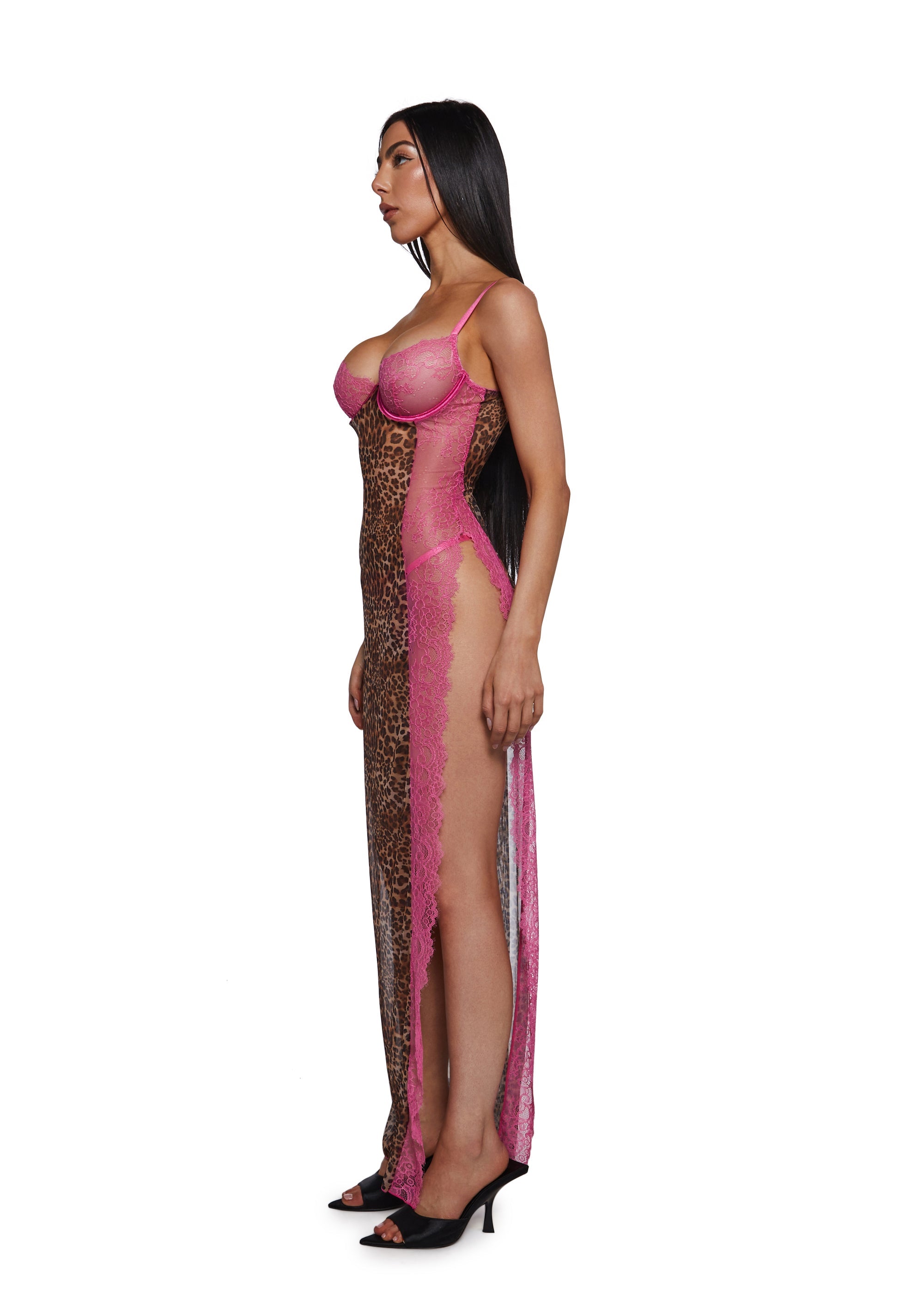 Unleash your inner wild side with this seductive lingerie set, featuring a leopard print sheer mesh gown adorned with a vibrant pink lace trim. The underwire lace bra offers structure and support, while the sultry design hugs the curves for a striking look.