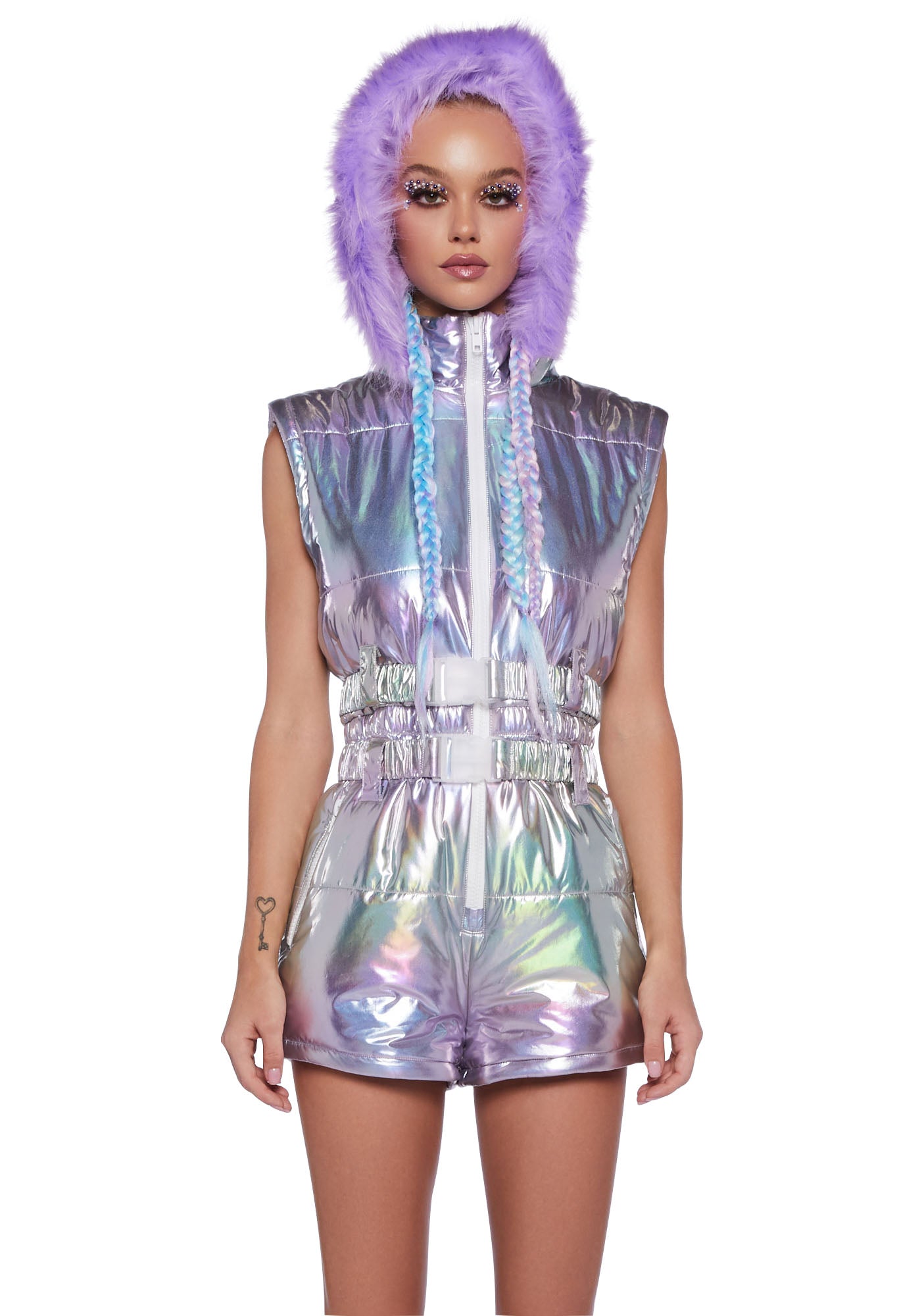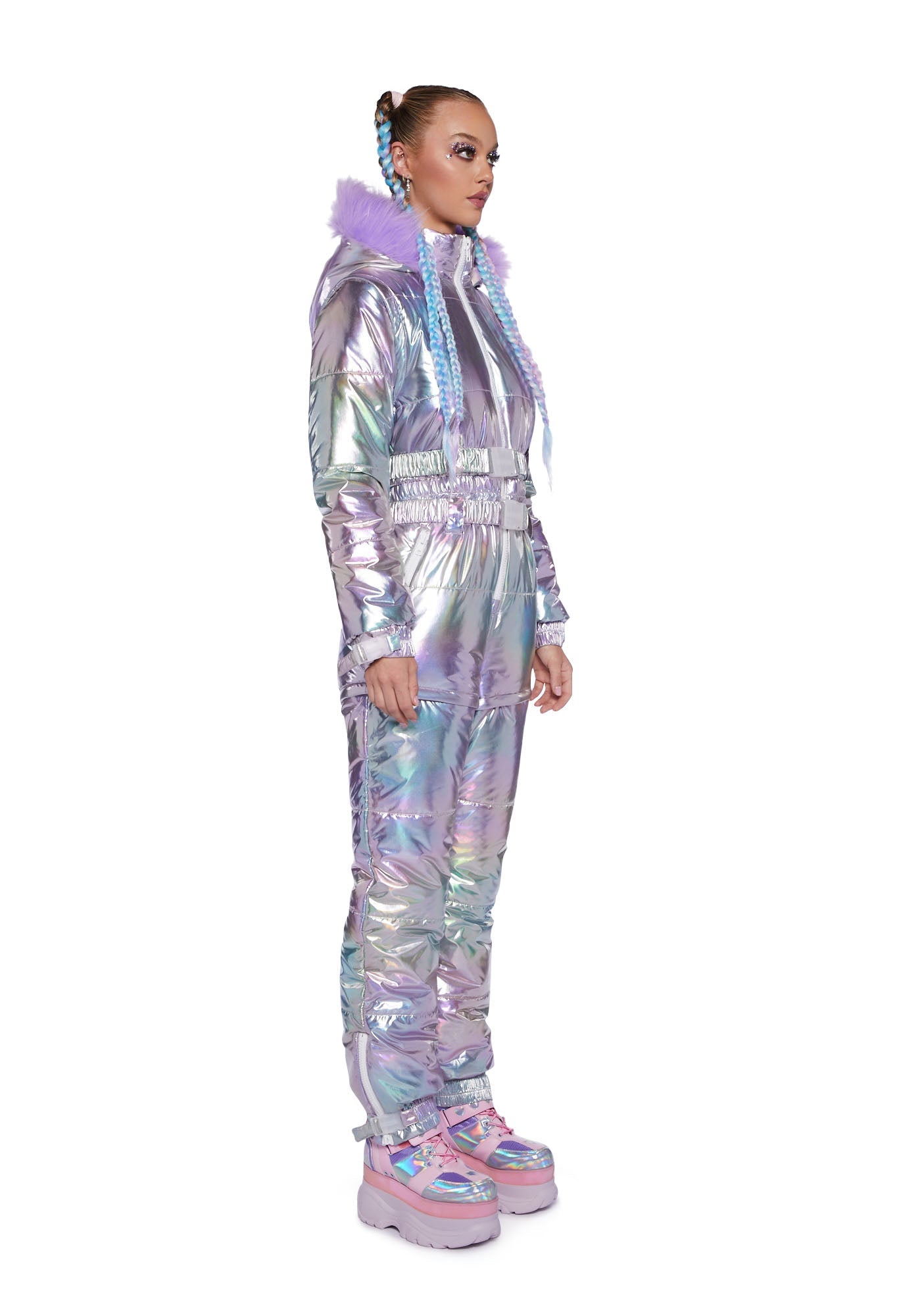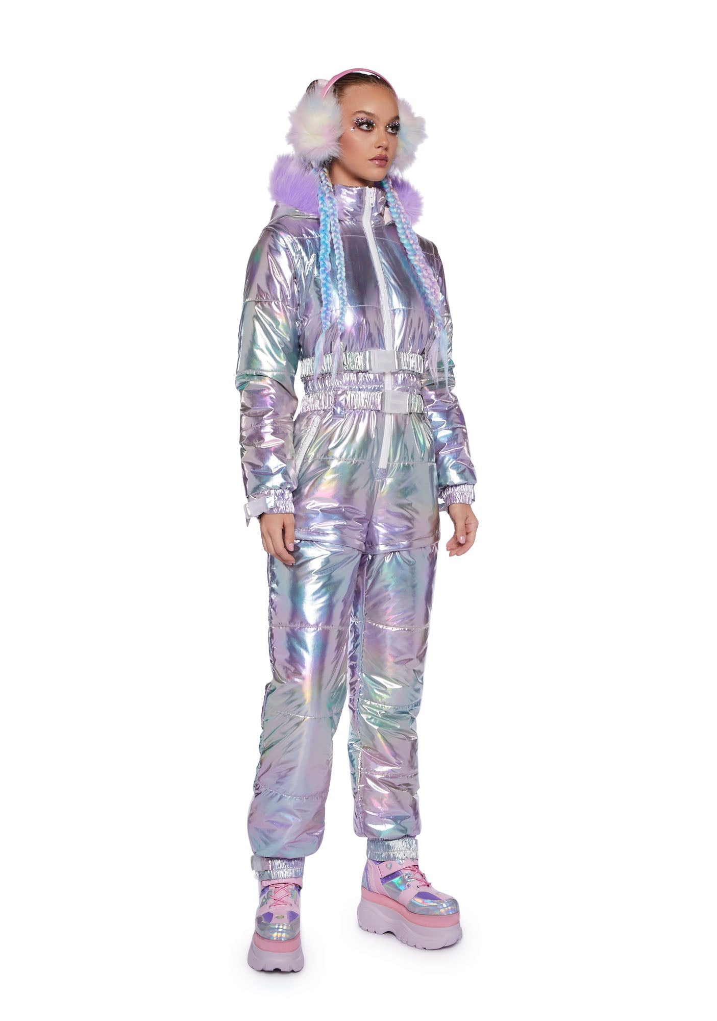 cuz the northern lightz don't shine as bright as you! This snowsuit has a holographic construction, puffy, removable long sleeves with a zipper closure, elasticated ribbed cuffs with translucent buckle closures, zippered side pockets, removable pants with zippered closures, a hoodie with a faux fur trim, an elastic waist with clear buckle closures that are adjustable, pant legs with zipper detailing, elasticated cuffs, clear buckle closures, and a front zipper closure.