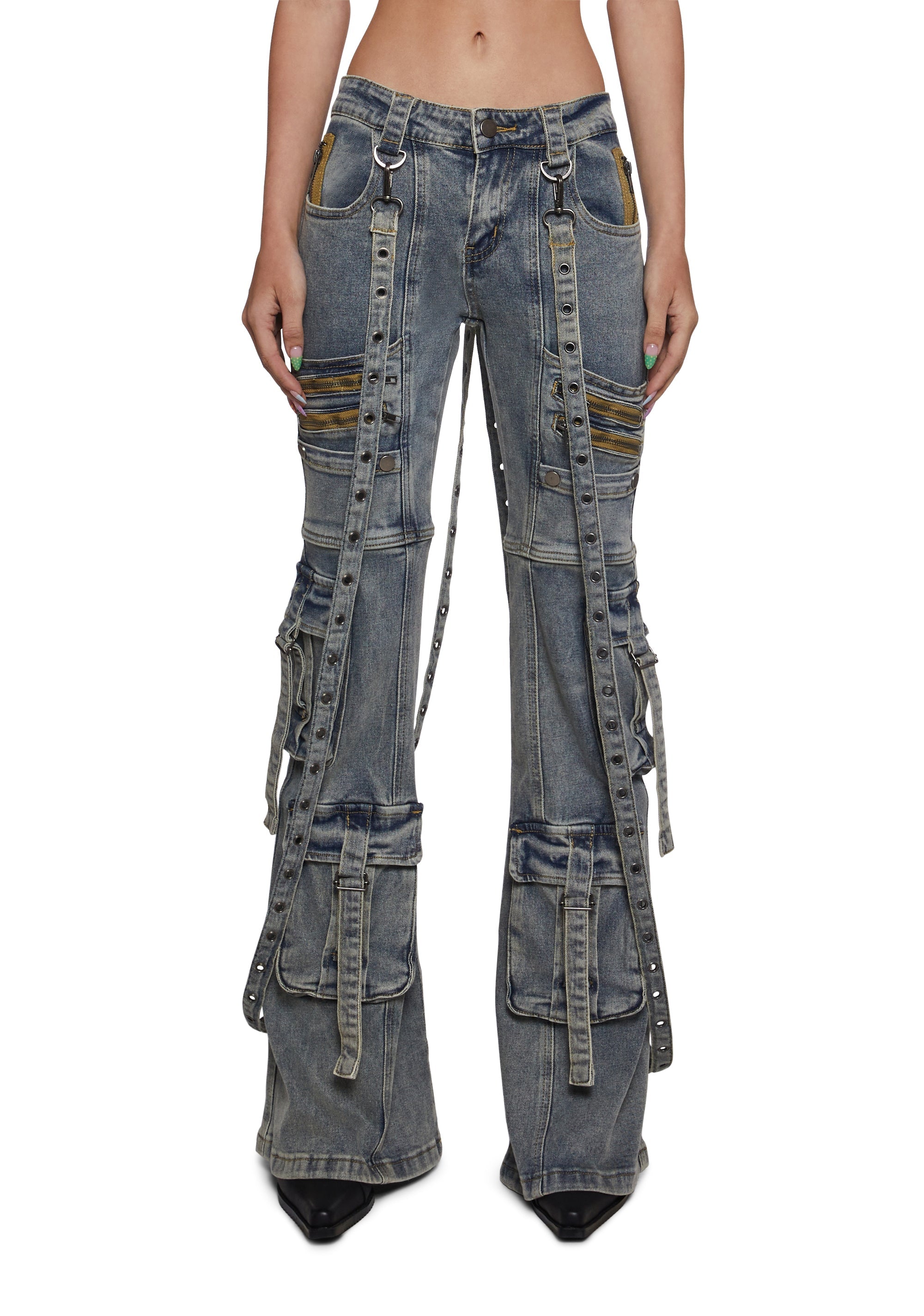 you've got the 'it' girl factor. These low rise cargo pants have a washed denim construction, a skinny fit throughout the hips and thighs, a flared leg silhouette, detachable suspender straps, zipper hardware trim, and pockets on the front and back.