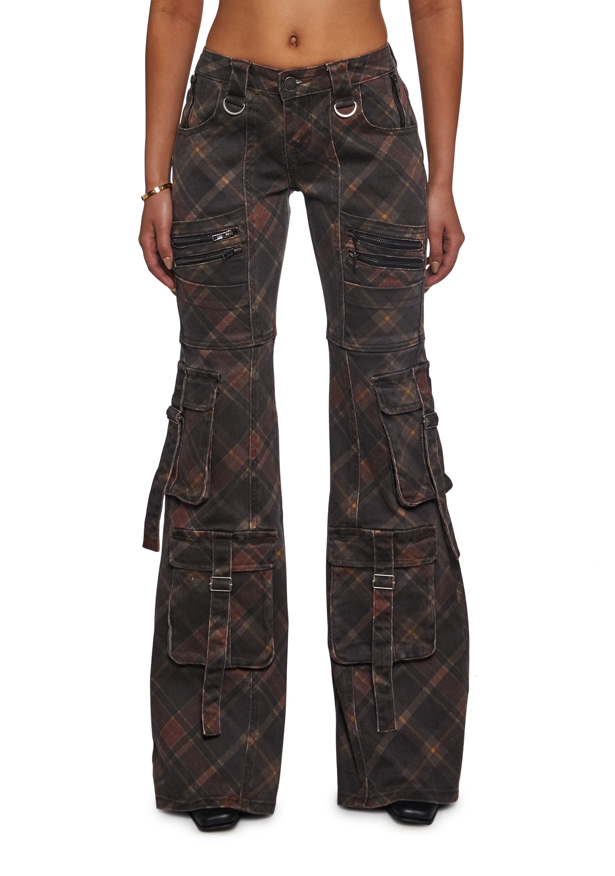 These low rise cargo pants have a stretchy twill construction, a plaid print, a skinny fit throughout the hips and thighs, a flared leg silhouette, D-ring hardware, zipper hardware trim, and cargo pockets on the front and back.