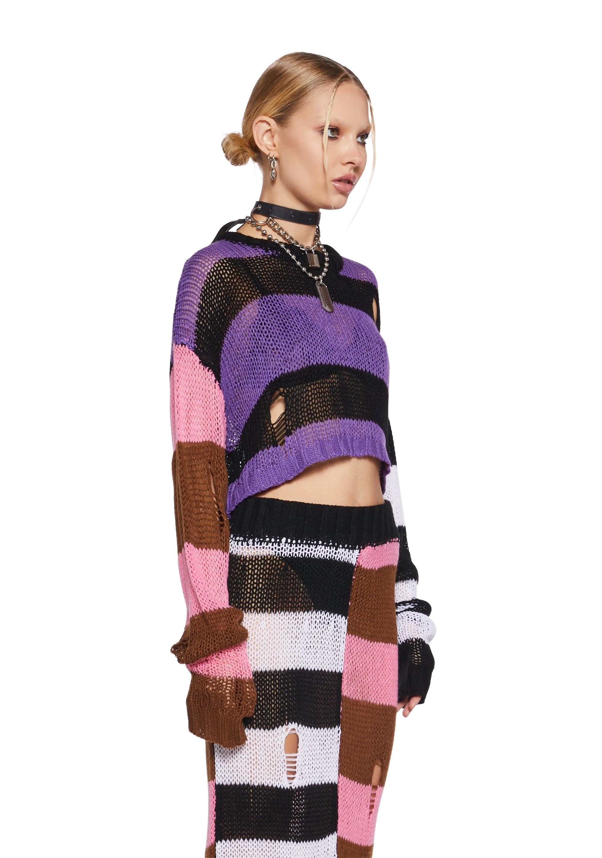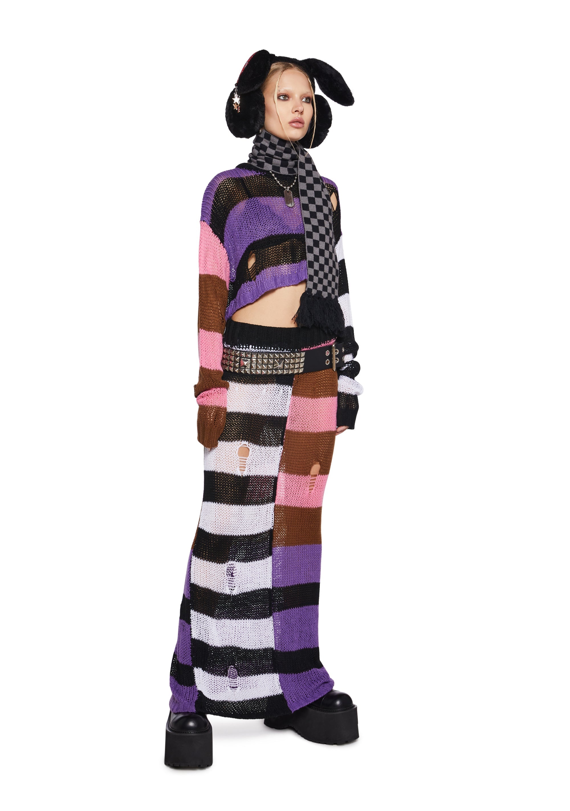 Look stylish with this skirt set that includes a long sleeve top that has a sheer open knit construction, a mixed striped color design, distressed details, a cropped fit, and a matching maxi skirt with an elastic waistband.