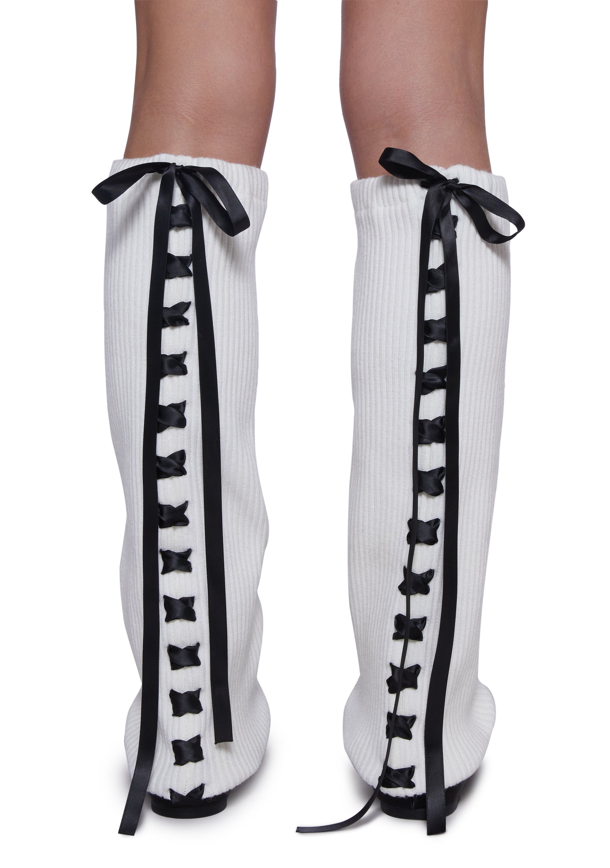 These flats have a satin construction, a decorative bow on the uppers, vegan leather double buckle closures, and removable knit ribbed leg warmers with satin ribbon lace-ups in the back.