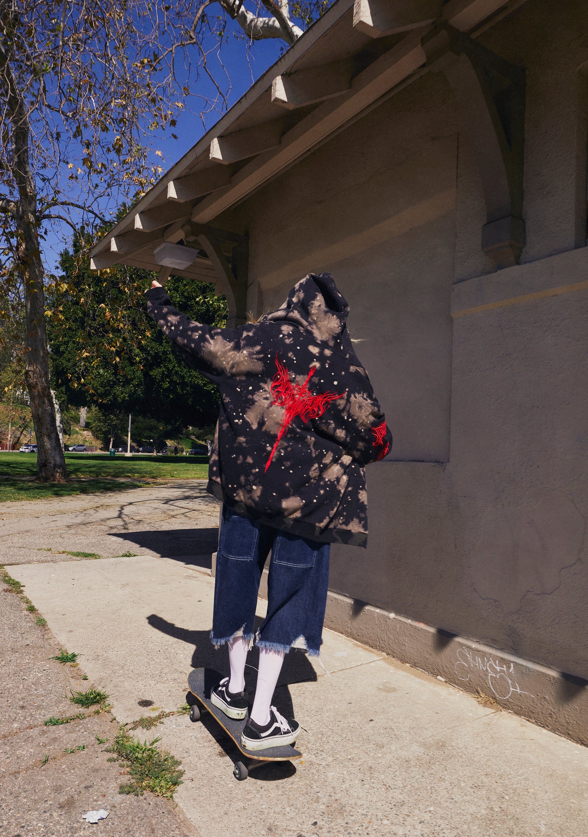 This hoodie has a cotton construction, a washed tie dye finish, kangaroo pockets, adjustable ties, Baphomet graphic on the front, the word “Baphomet” and a sword embroidered on the back, and the word “Demon” embroidered on one sleeve.This product has been pre-washed to create a vintage, worn-in look. Some fabric pilling and sediment may be present in the pocket linings.