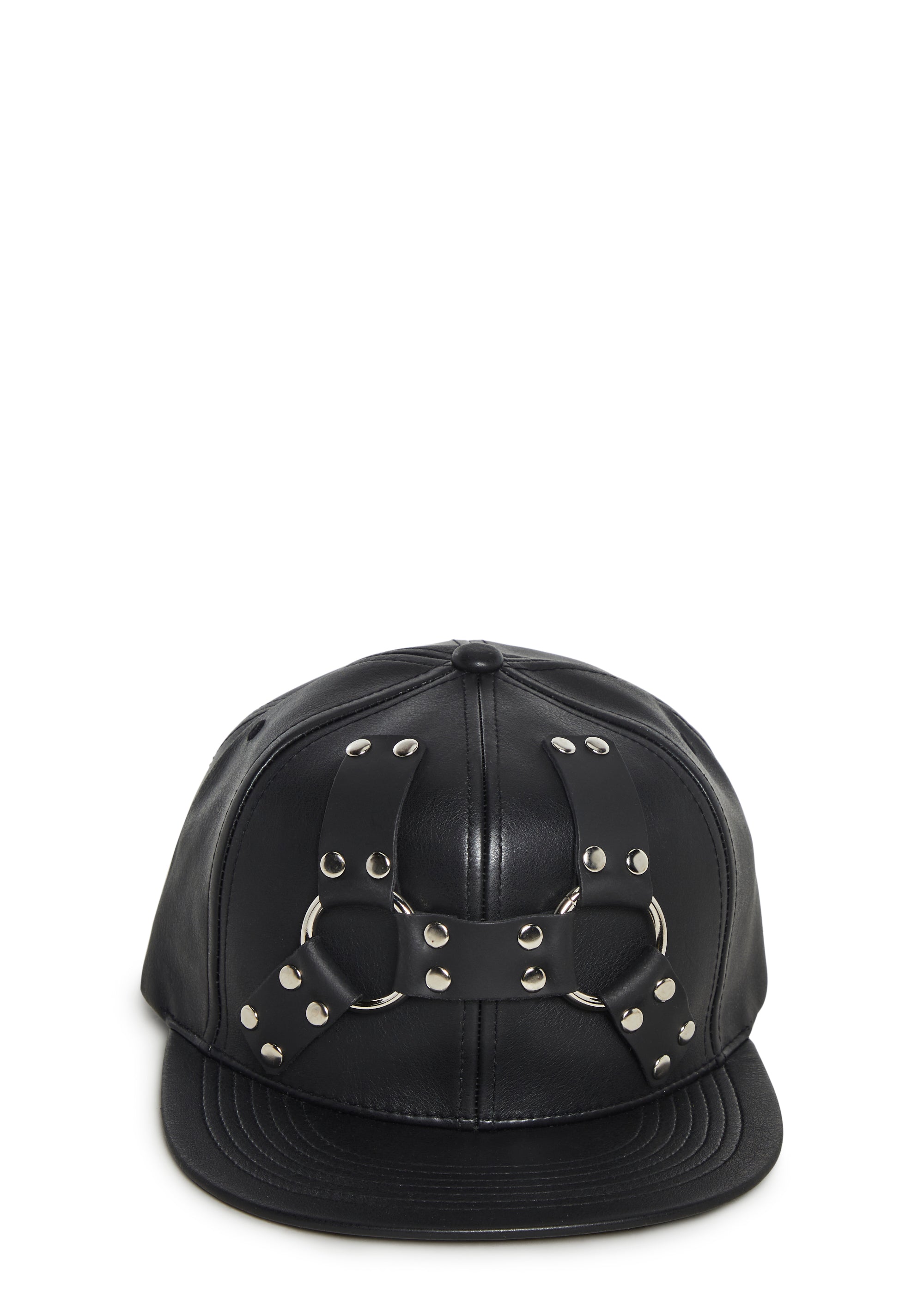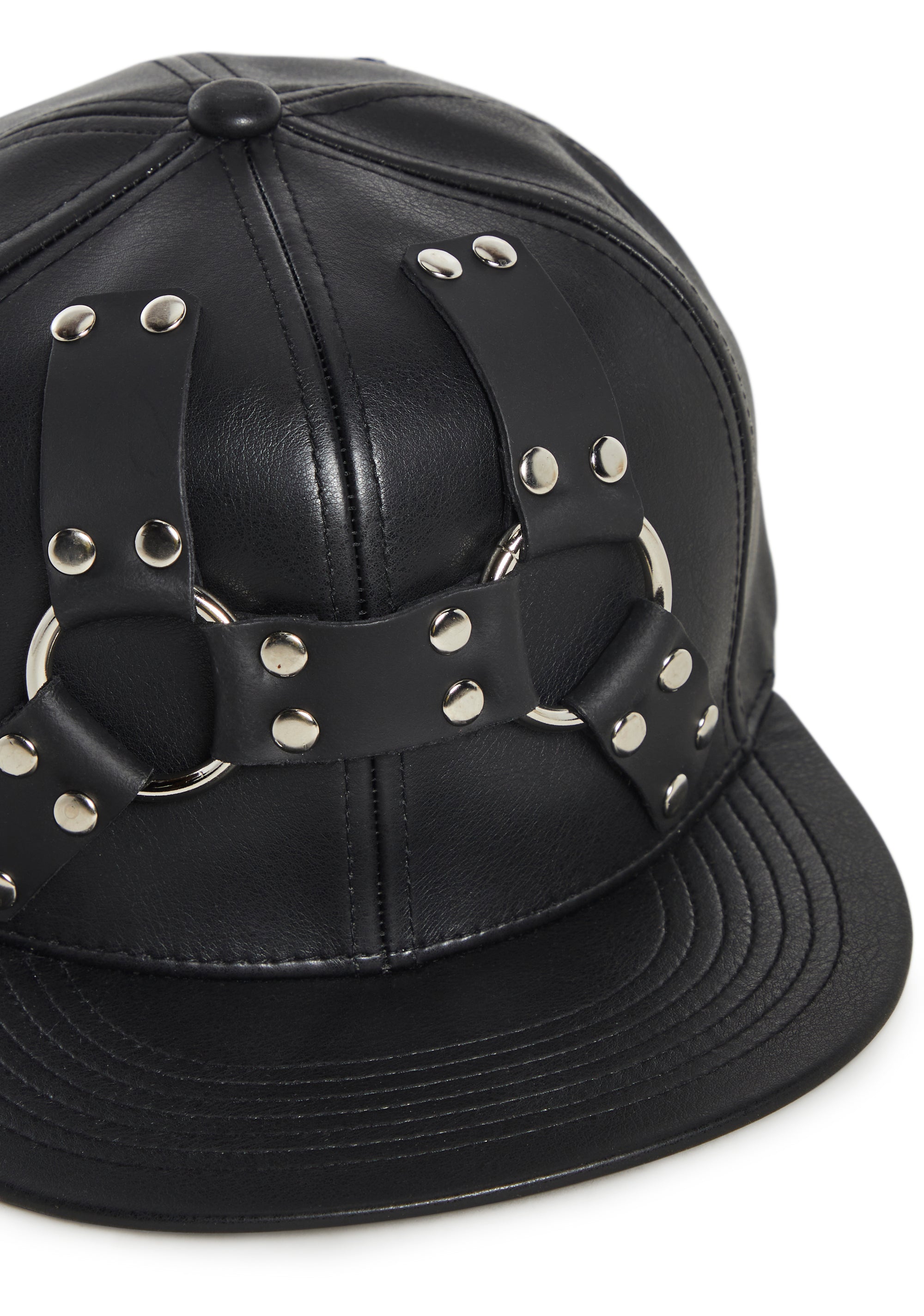 This flat brim baseball hat has a vegan leather construction, O-ring harness hardware on the front, and an adjustable buckle closure on the back.