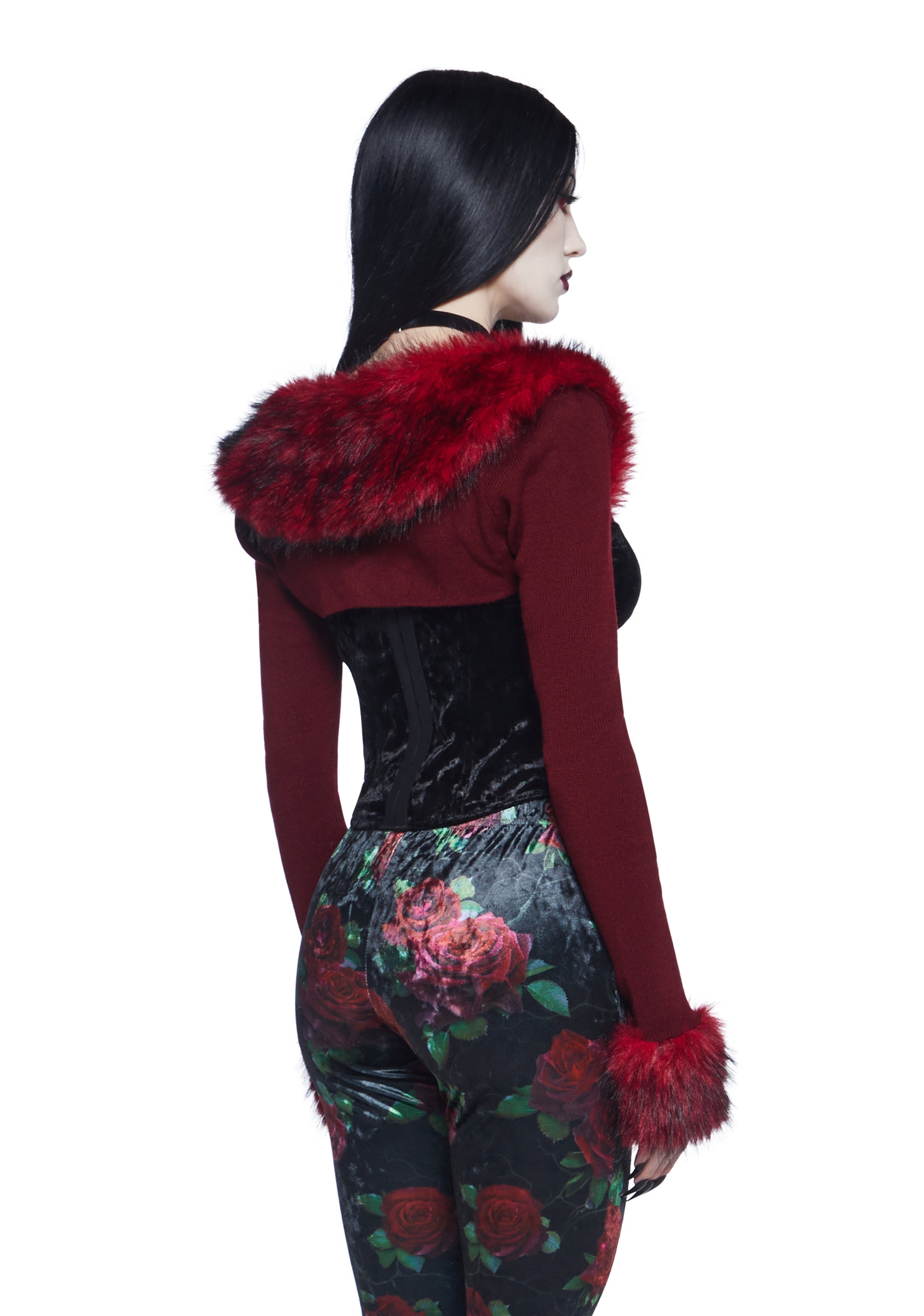 This shrug has a stretchy knit construction with faux fur trim, long sleeves, and an ombre design on the faux fur.