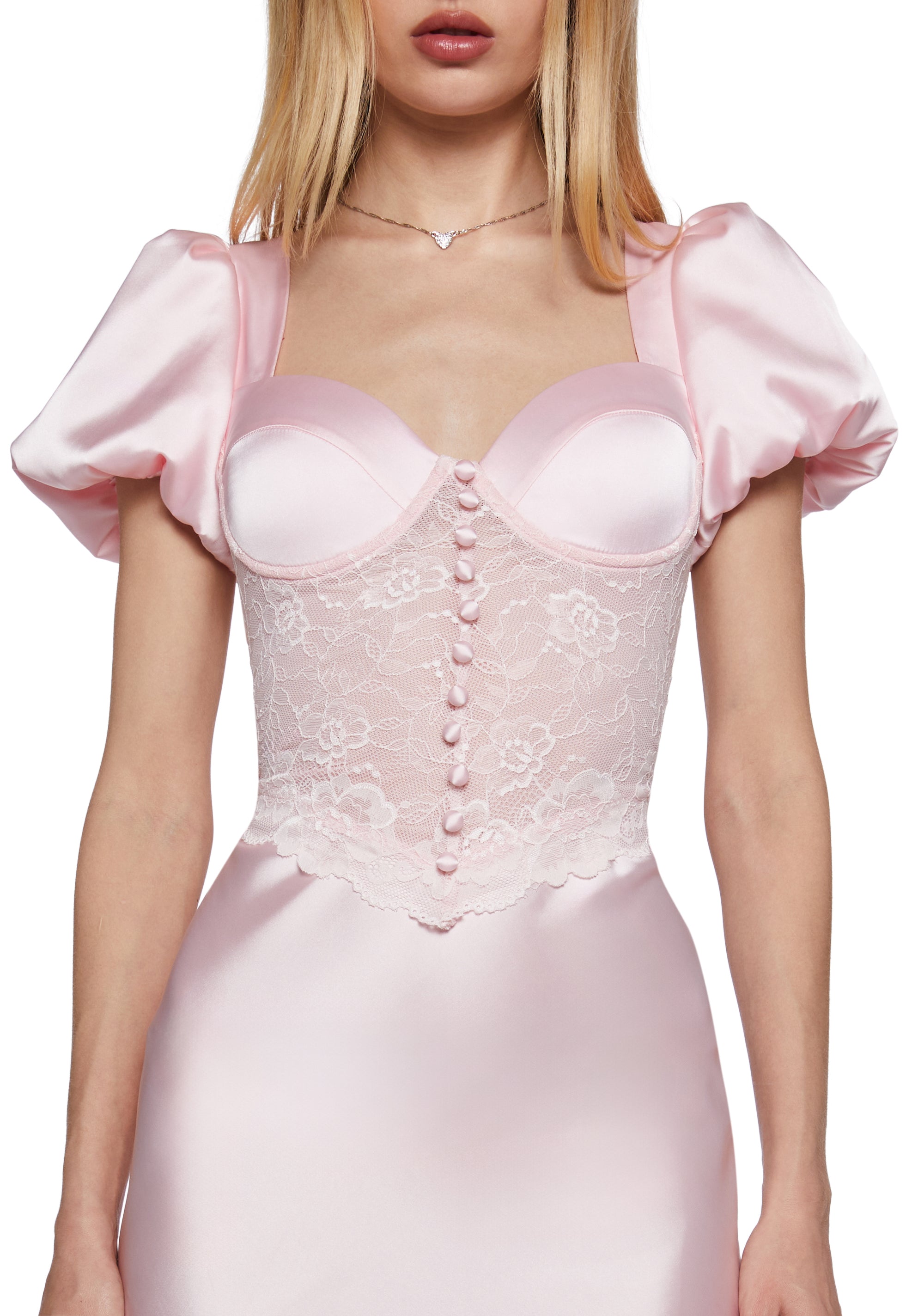 This maxi dress has a charmeuse satin construction, puffy sleeves with elasticated cuffs, a padded underwire bust, a sheer lace bodice with decorative buttons, a sweet heart neckline, an open back with bow tie closures, and a back zipper closure.