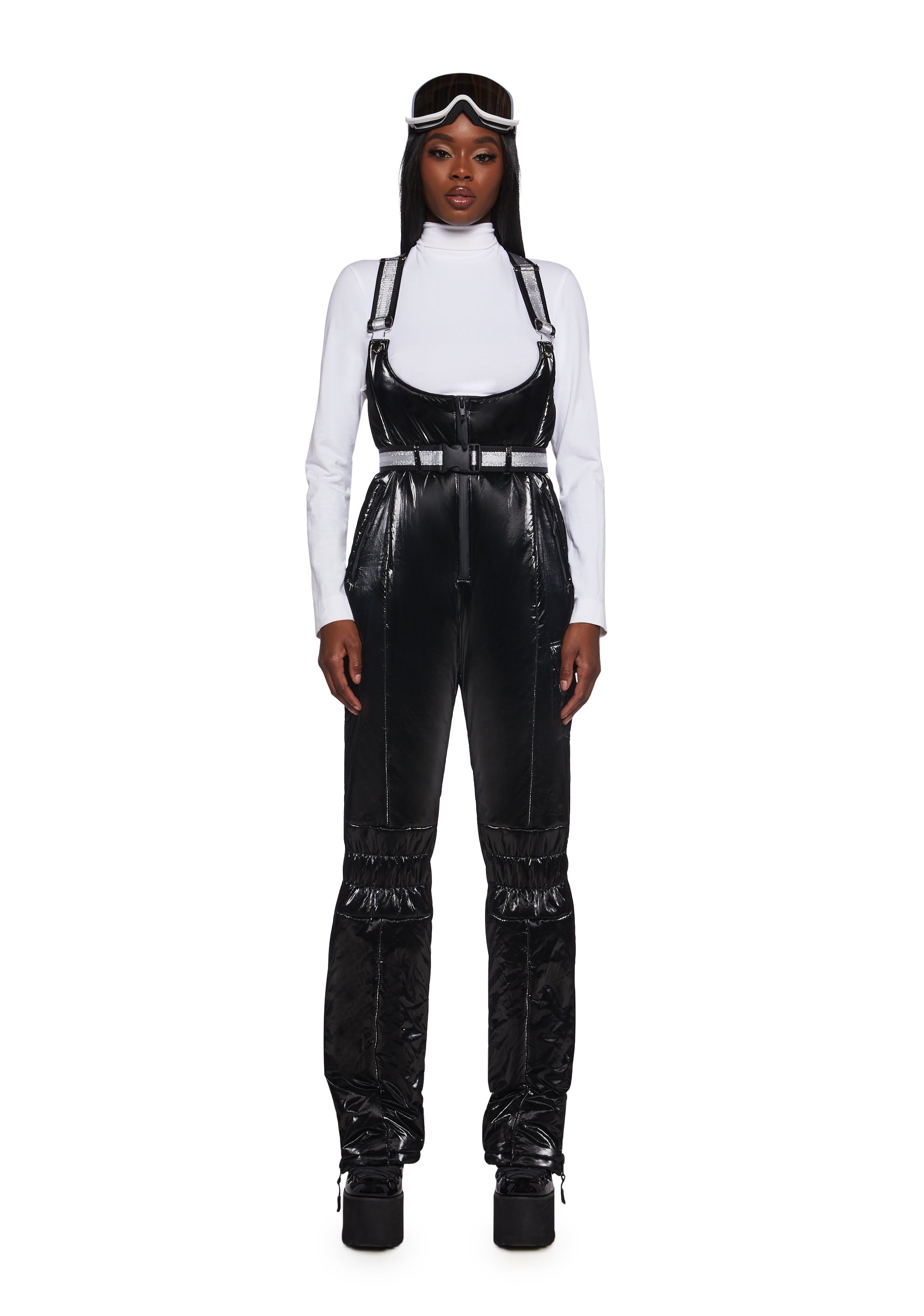 not even a snow storm can slow you down. These snowsuit overalls have a puffy vinyl design with ruching details, a neckline below the bust, a front zip closure, and reflective straps.