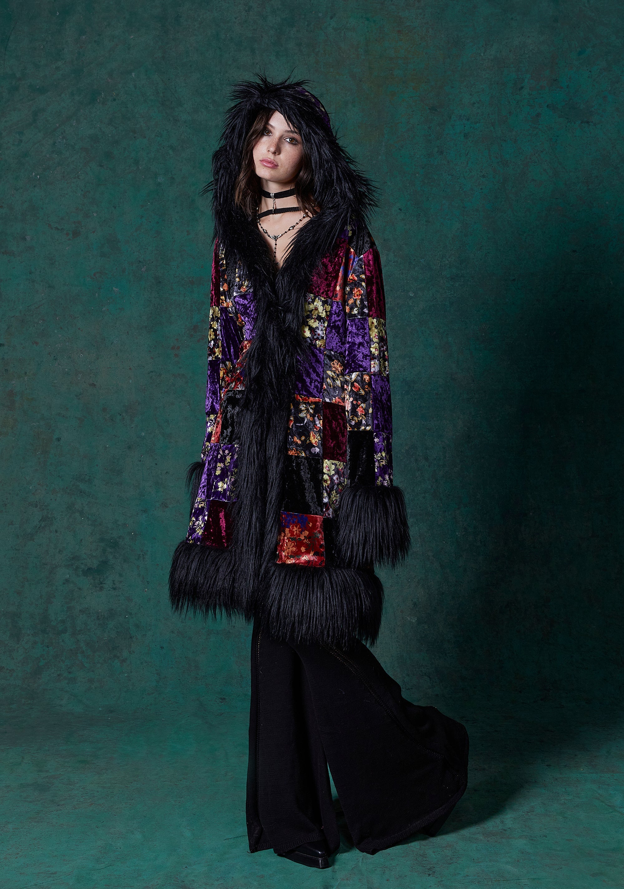 Fall in love with this coat that has a satin lining, a velvet construction, a patchwork design with floral details, long sleeves, a long faux fur trim, and front hook closures.