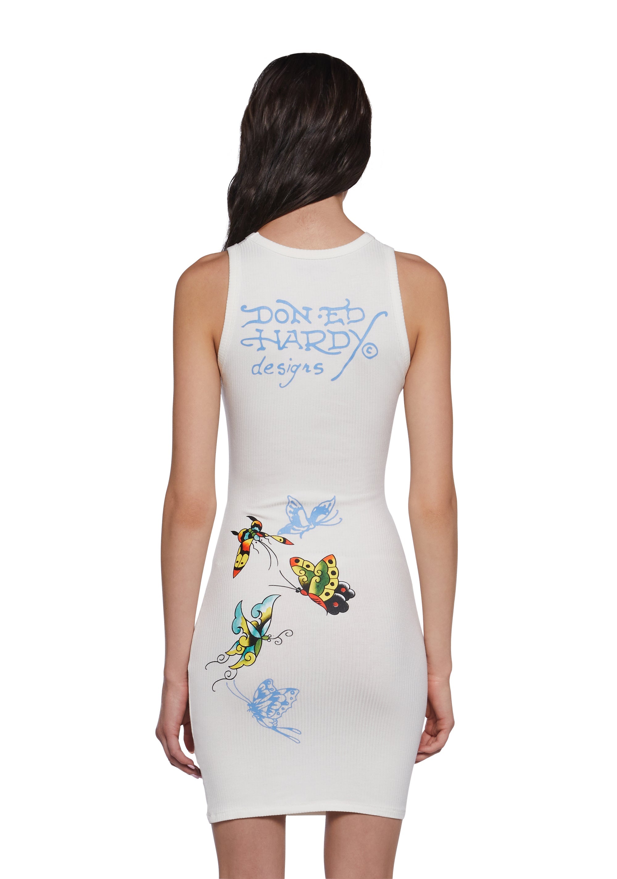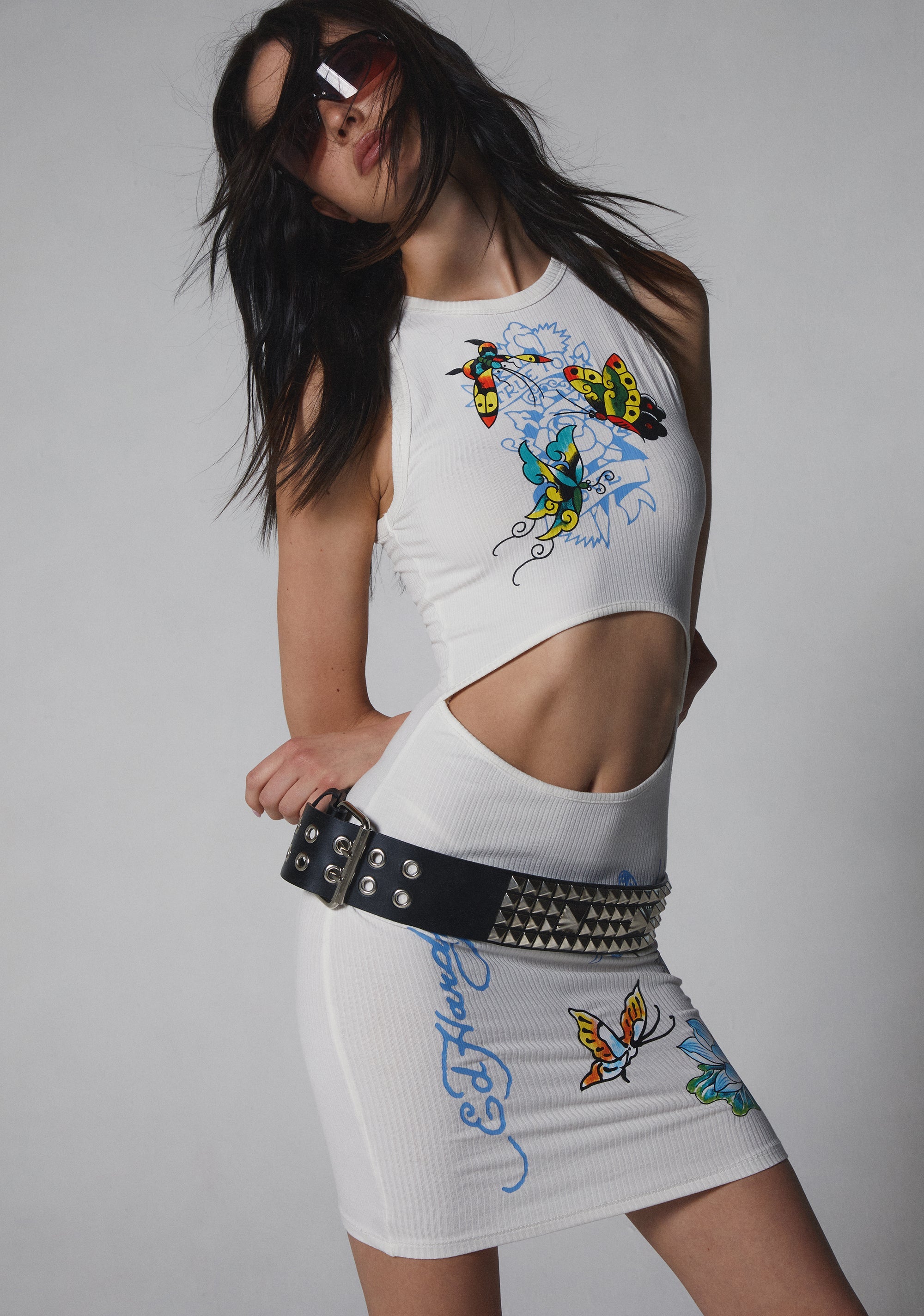 This mini dress has a super soft ribbed construction, a cut out design, and Ed Hardy logo and butterfly designs on the front and back.