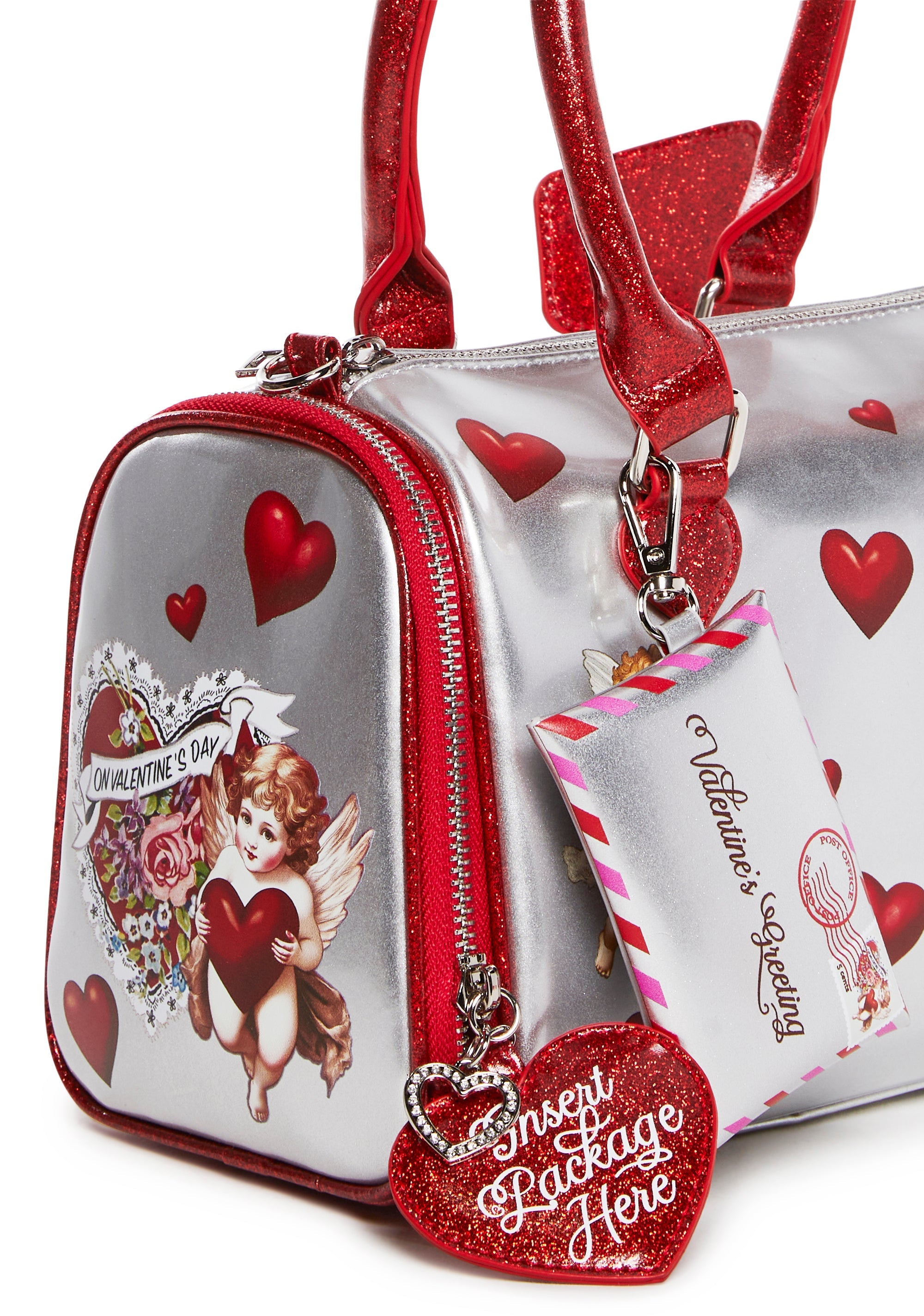 Always be thinking of your sweetheart with this crossbody bag in the shape of a mailbox, a vegan leather construction, a metallic sheen, contrast colored glitter trim, heart and cupid graphics everywhere, top handles, an adjustable removable shoulder strap, side pockets with zipper closures, a removable envelope mini purse with a snap button closure, a heart vinyl charm with a rhinestone heart, and a top zipper closure.