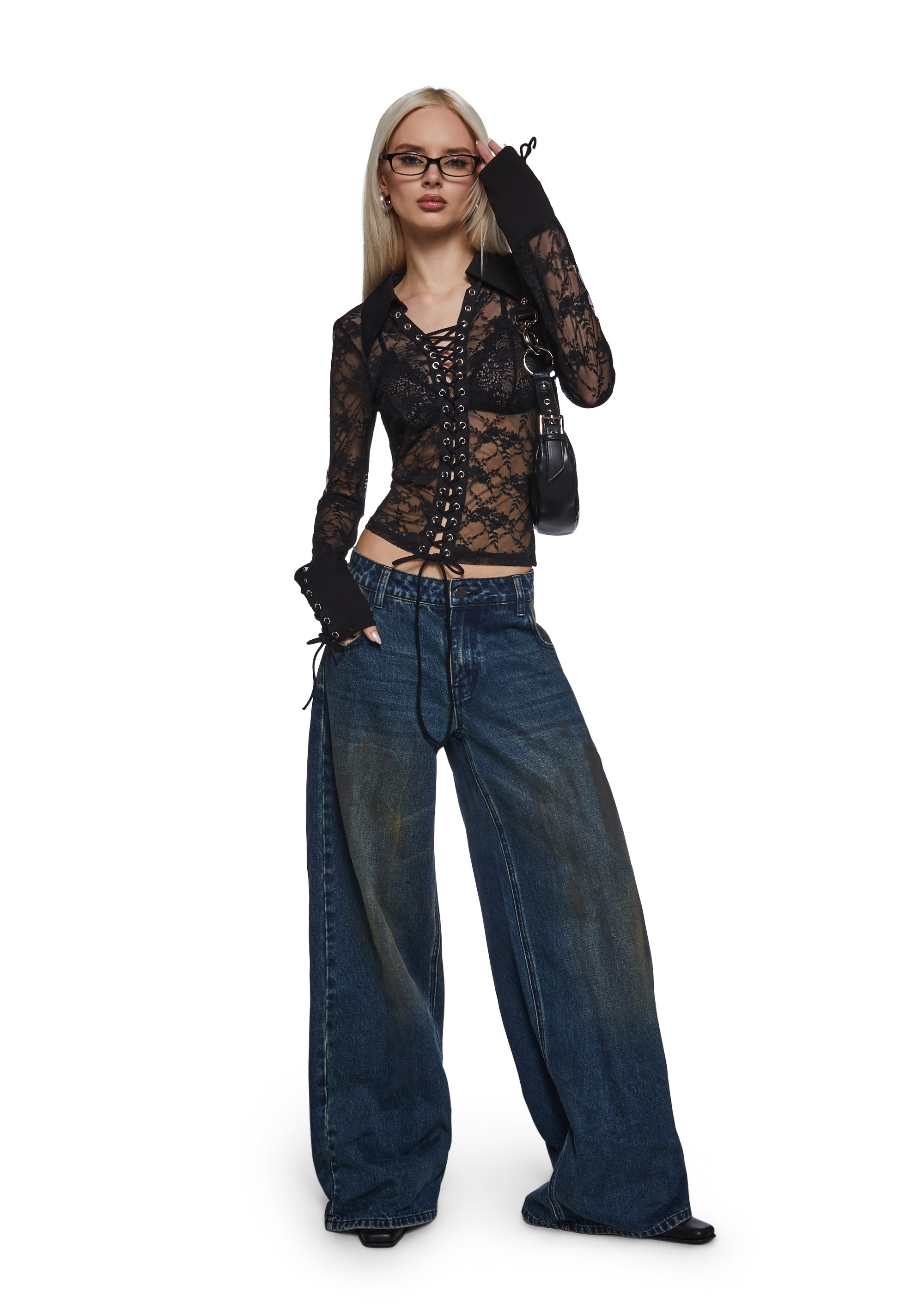 A bold, fashion-forward lace top that blends sensuality with edgy sophistication. Crafted from sheer black floral lace, this fitted silhouette features a striking lace-up front with metal eyelets, creating a corset-inspired effect that enhances the waist. The structured collar adds a sharp, tailored contrast, while elongated sleeves with flared cuffs and lace-up wrist details bring a dramatic, statement finish. Designed to be worn layered or solo for confident styling.