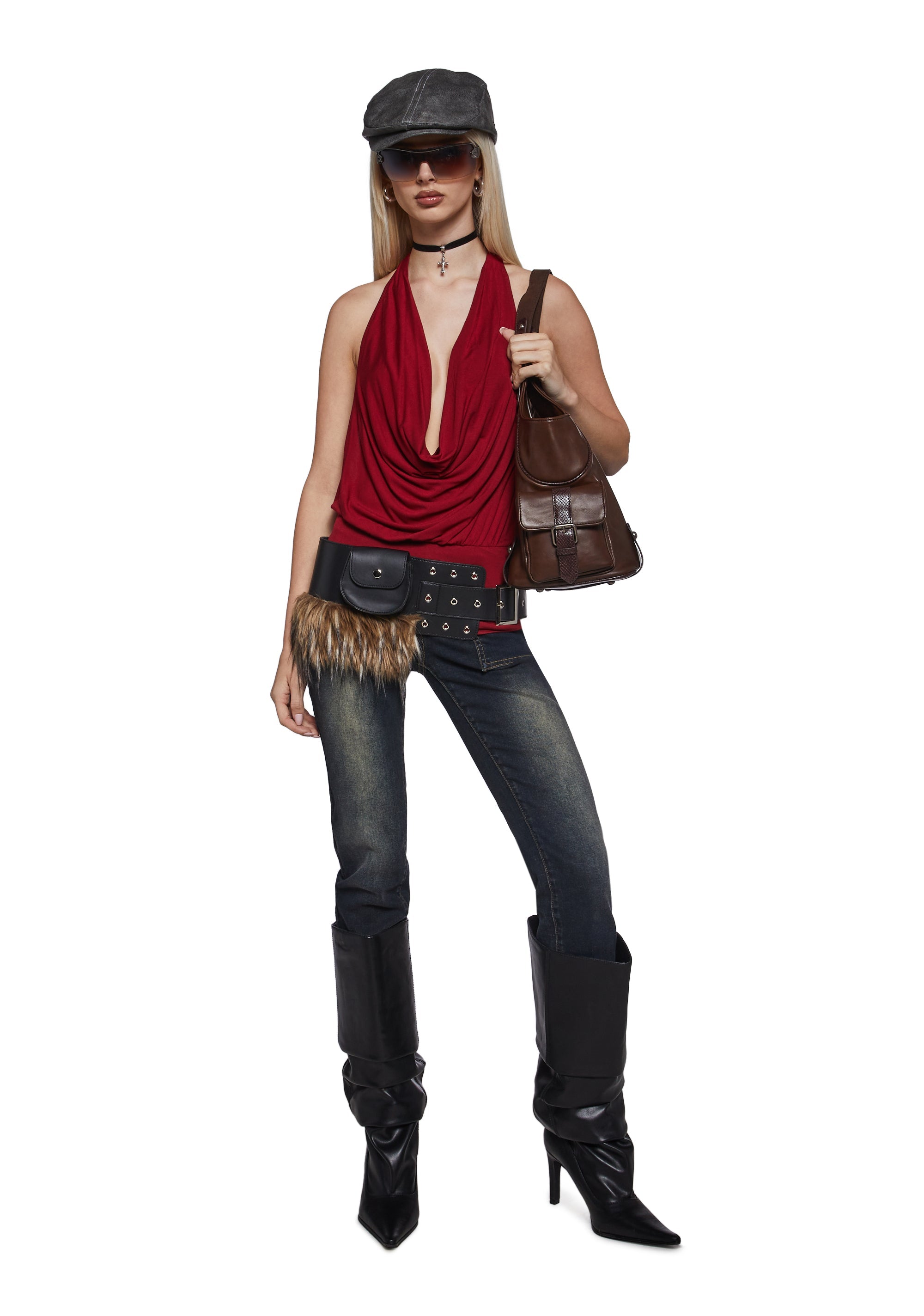 Elevate your essentials with this sleek draped halter top designed to flatter with a deep cowl neckline and smooth, body-skimming fit. Minimal yet striking, it’s a versatile statement piece that transitions effortlessly from day to night.