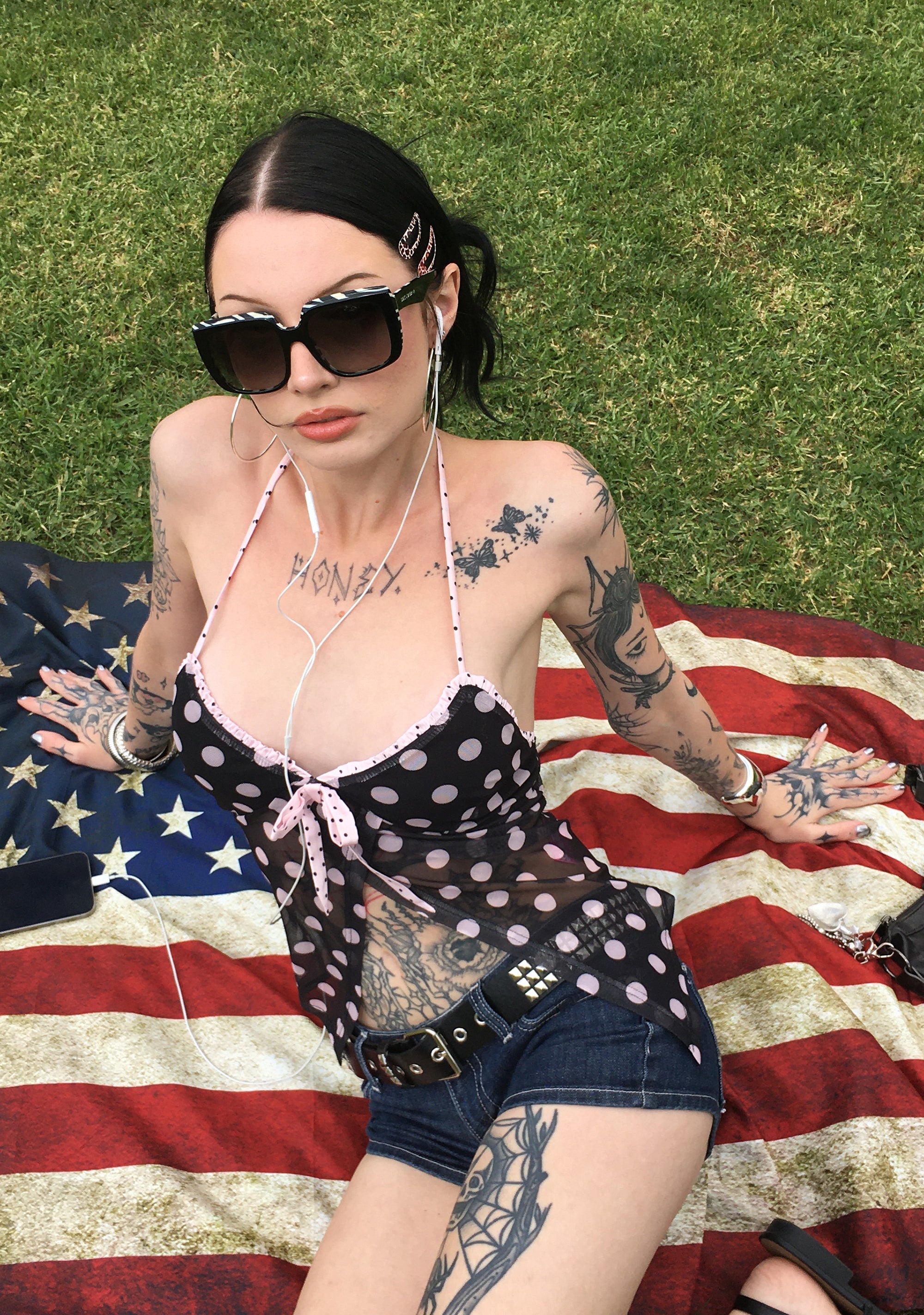This top has a stretchy sheer mesh construction, a fully lined bust, an all over polka dot pattern, a contrast colored bow closure on the front, an asymmetrical slip hem, and an open back with adjustable back tie closures.