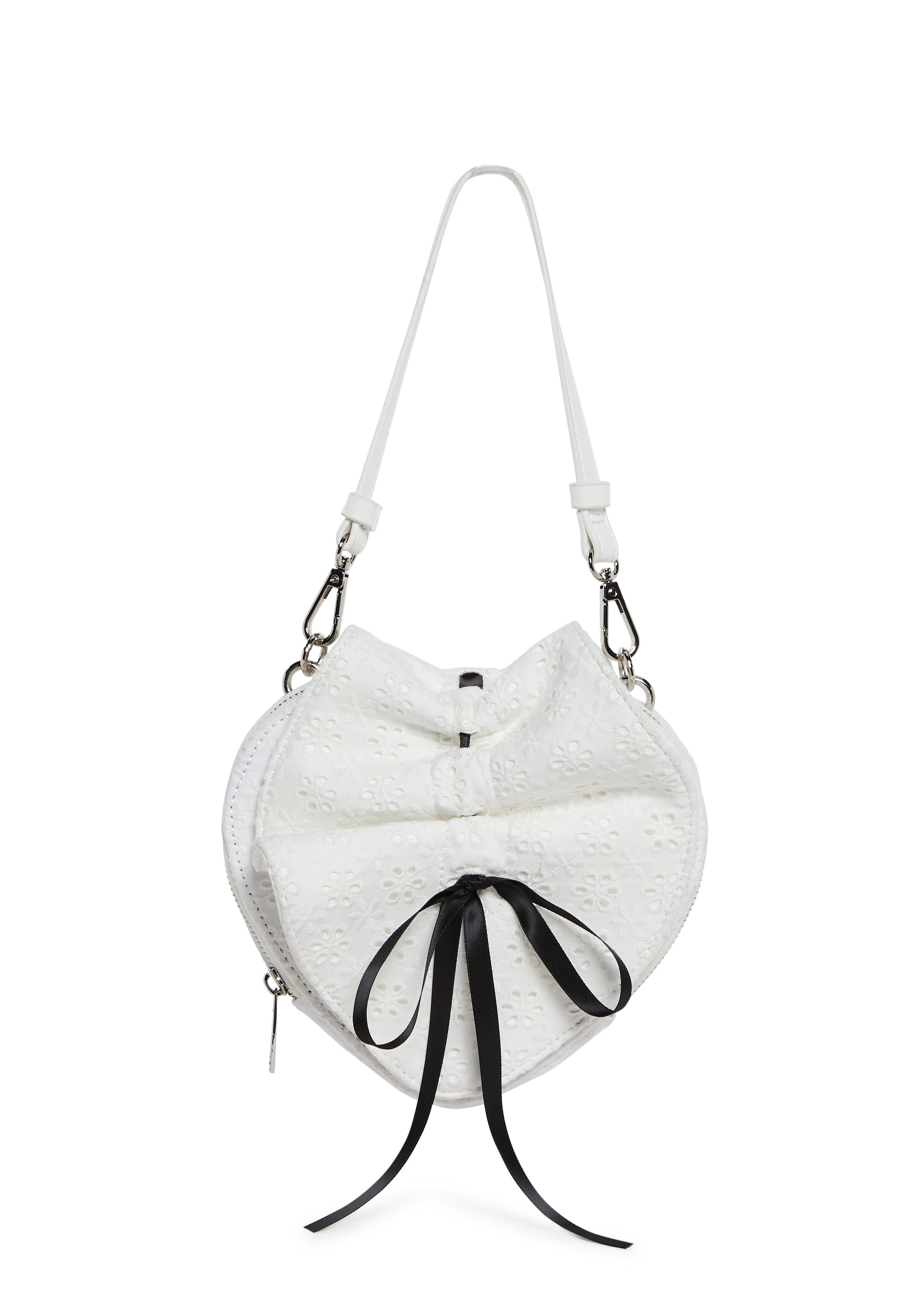 This heart shaped purse has an eyelet fabric construction, ruching on the front with a ribbon bow on the front, inner pockets, removable shoulder strap, and a top zipper closure.