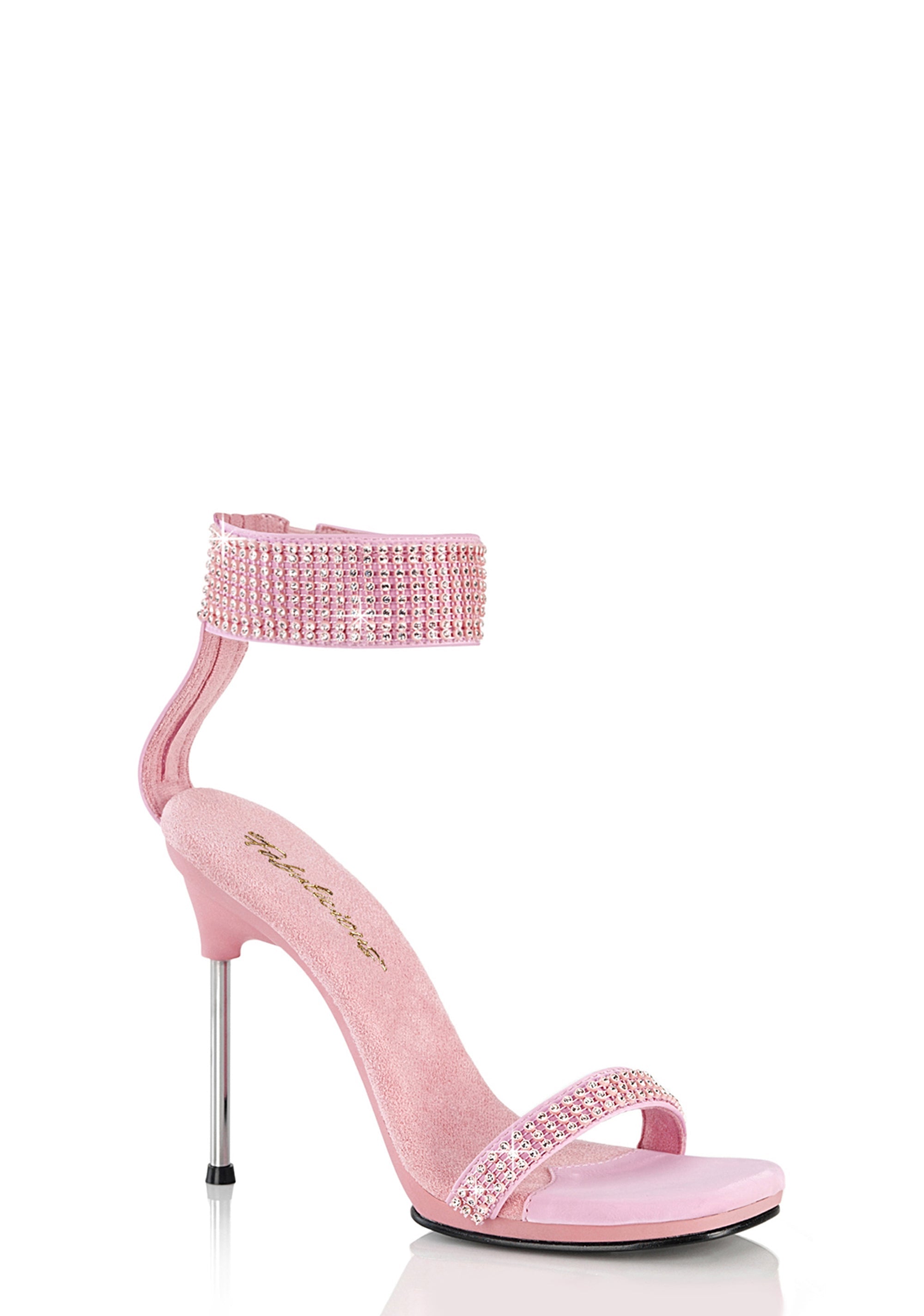 These shoes have rhinestone details, a wide ankle cuff, and a back zipper closure.