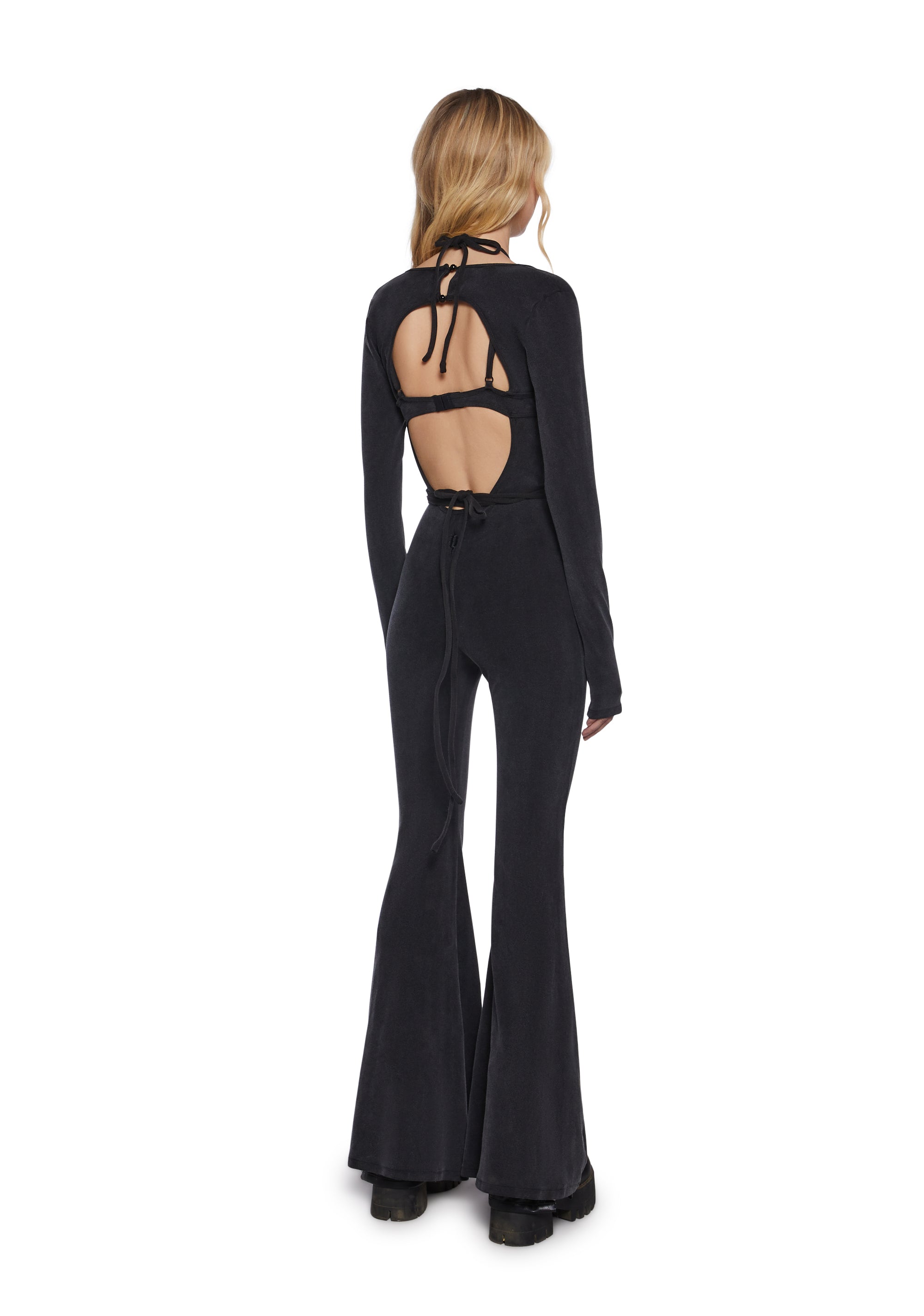 In a stretch washed jersey cotton construction. With a cut out design, straps, O-ring hardware, adjustable shoulder straps, a flared leg silhouette, back button and hook and eye closures, and an embroidered “D” on the back.
