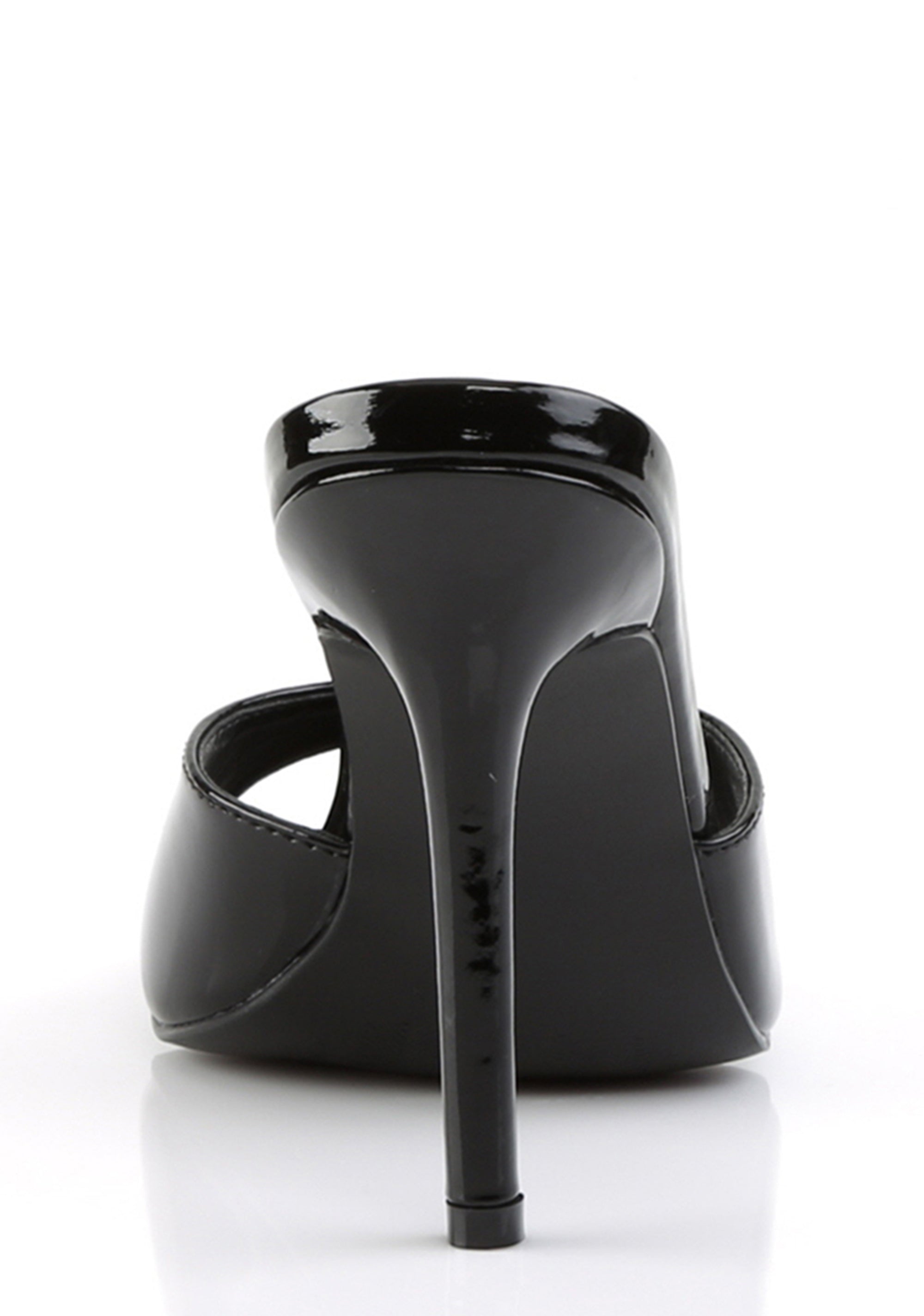 These shoes have vinyl uppers, a peep toe design, stiletto heels, and a slip on fit.