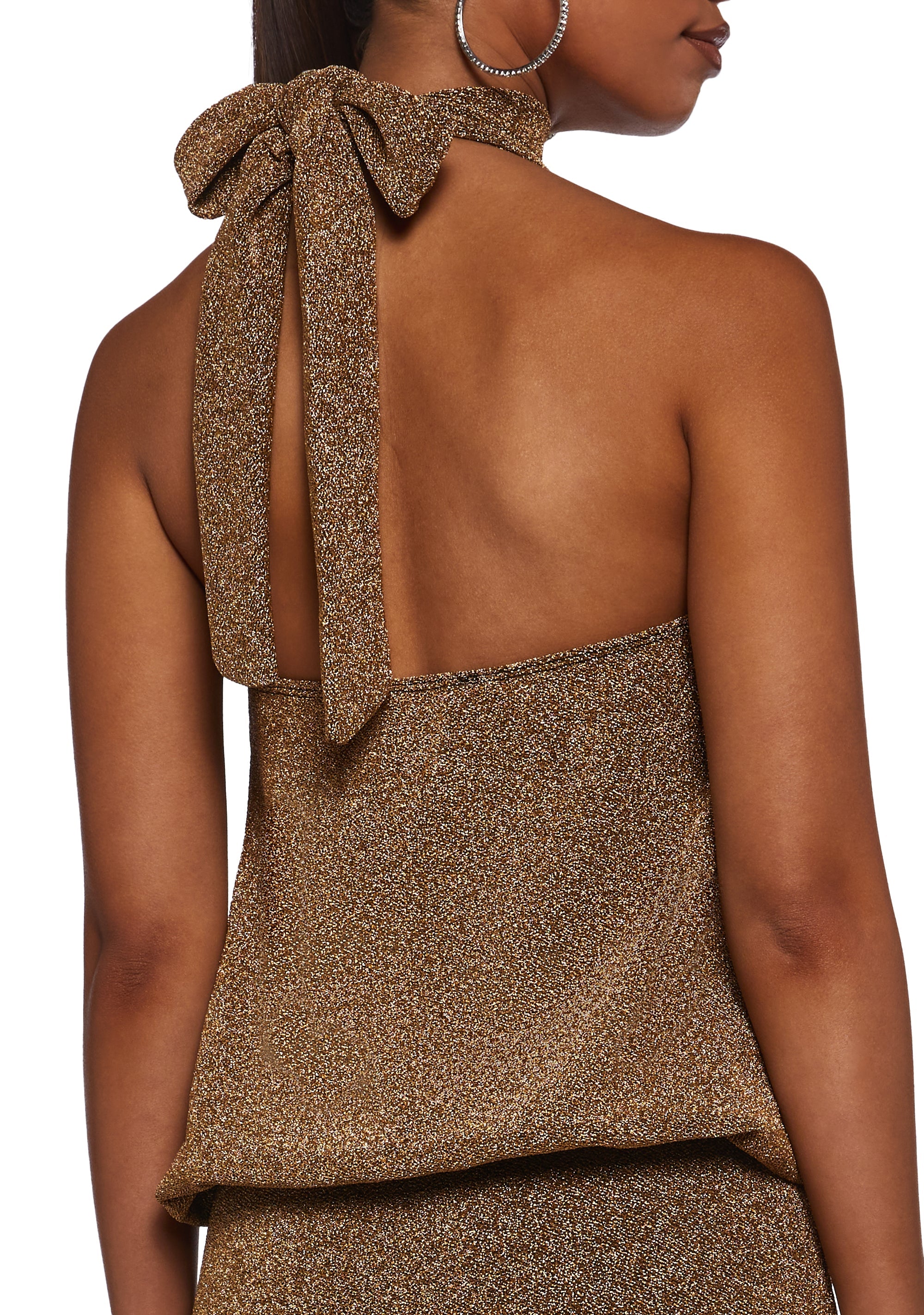 This mini dress has a glitter mesh construction and a high halter neckline with adjustable back tie closures.