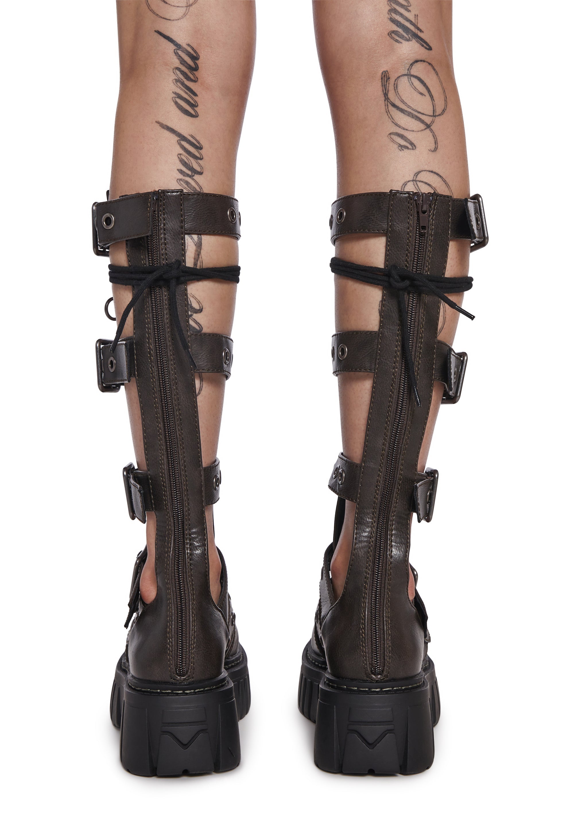These gladiator style knee high sandals have a vegan leather construction, treaded soles, front lace-ups, buckle details, and back zipper closures.