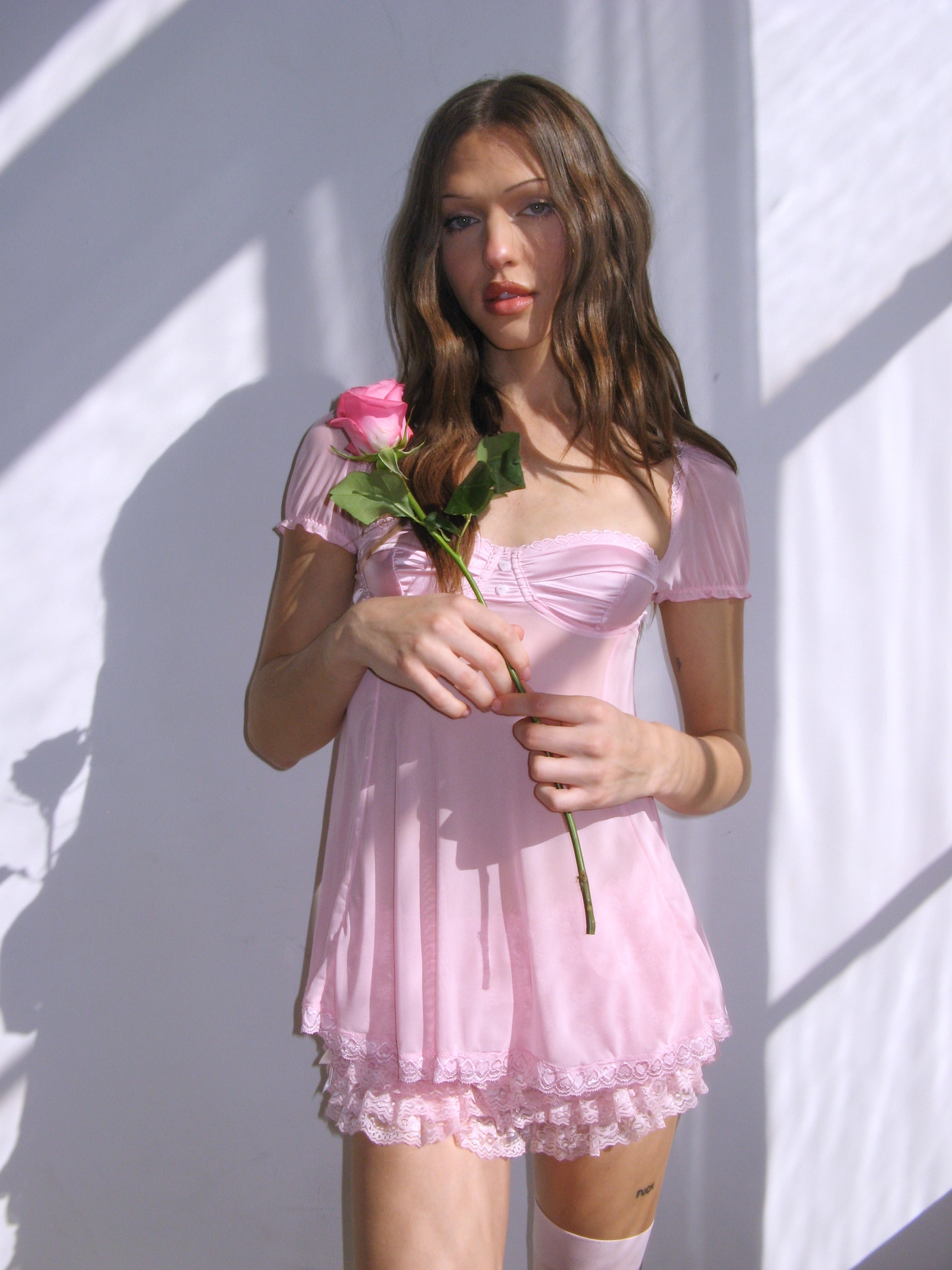 This soft pink sheer mini slip dress blends romance with a delicate, feminine silhouette. Designed with a structured bust and airy mesh body, it drapes effortlessly while highlighting the figure for a dreamy, lingerie-inspired look.