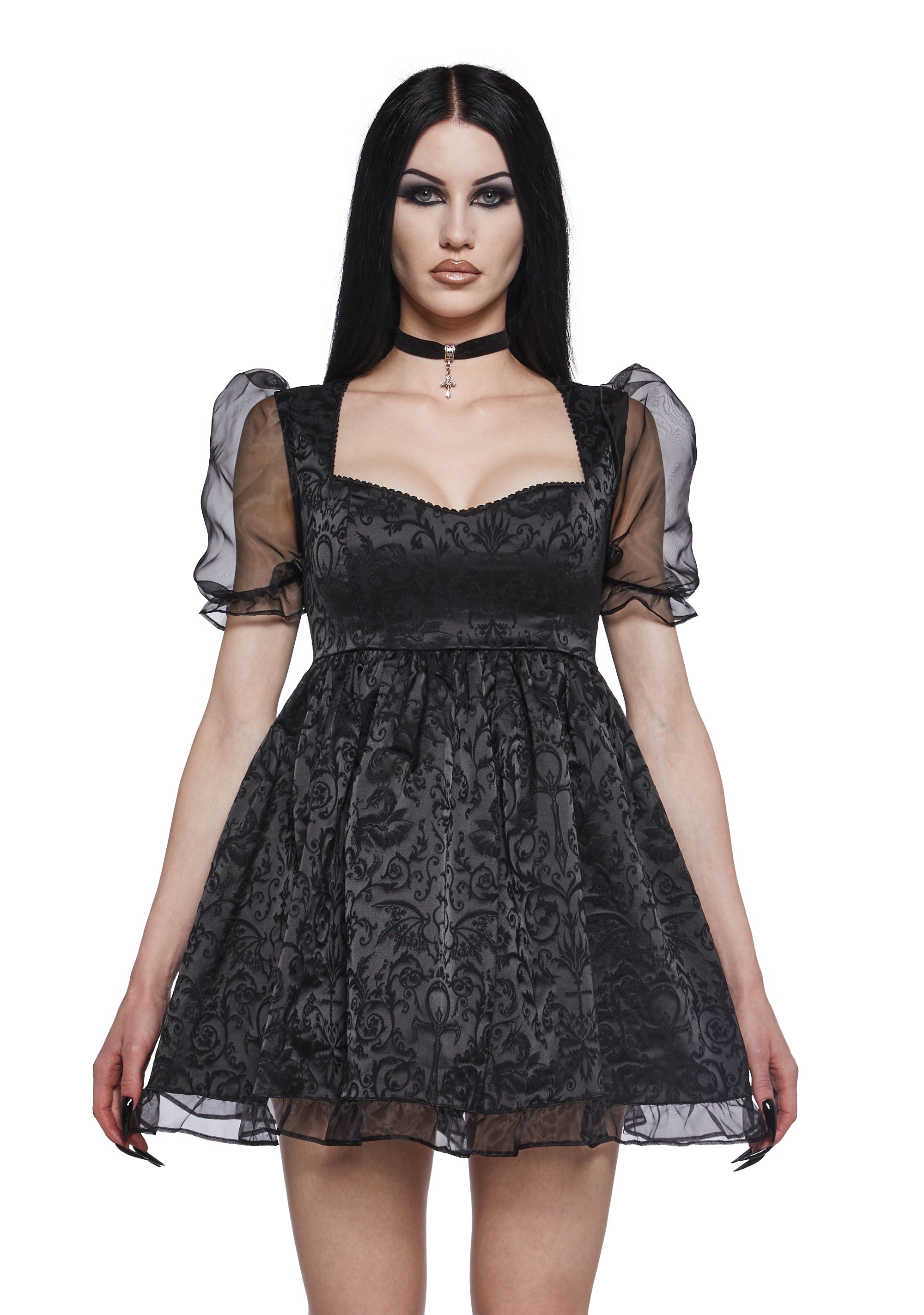 time to carry out your dark master's wishes… This spooktacular babydoll dress has an intricate brocade construction, sheer organza puff sleeves, ruffle trim, a sweetheart neckline, and a back satin bow closure.