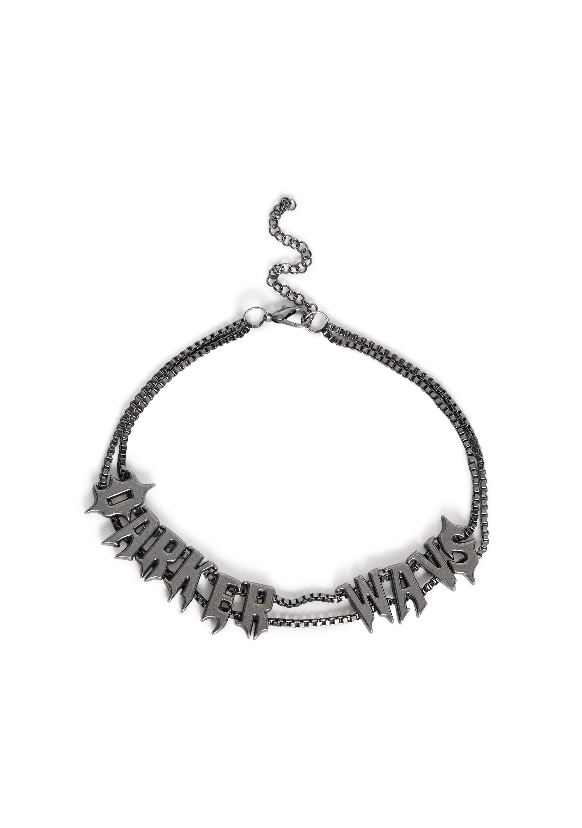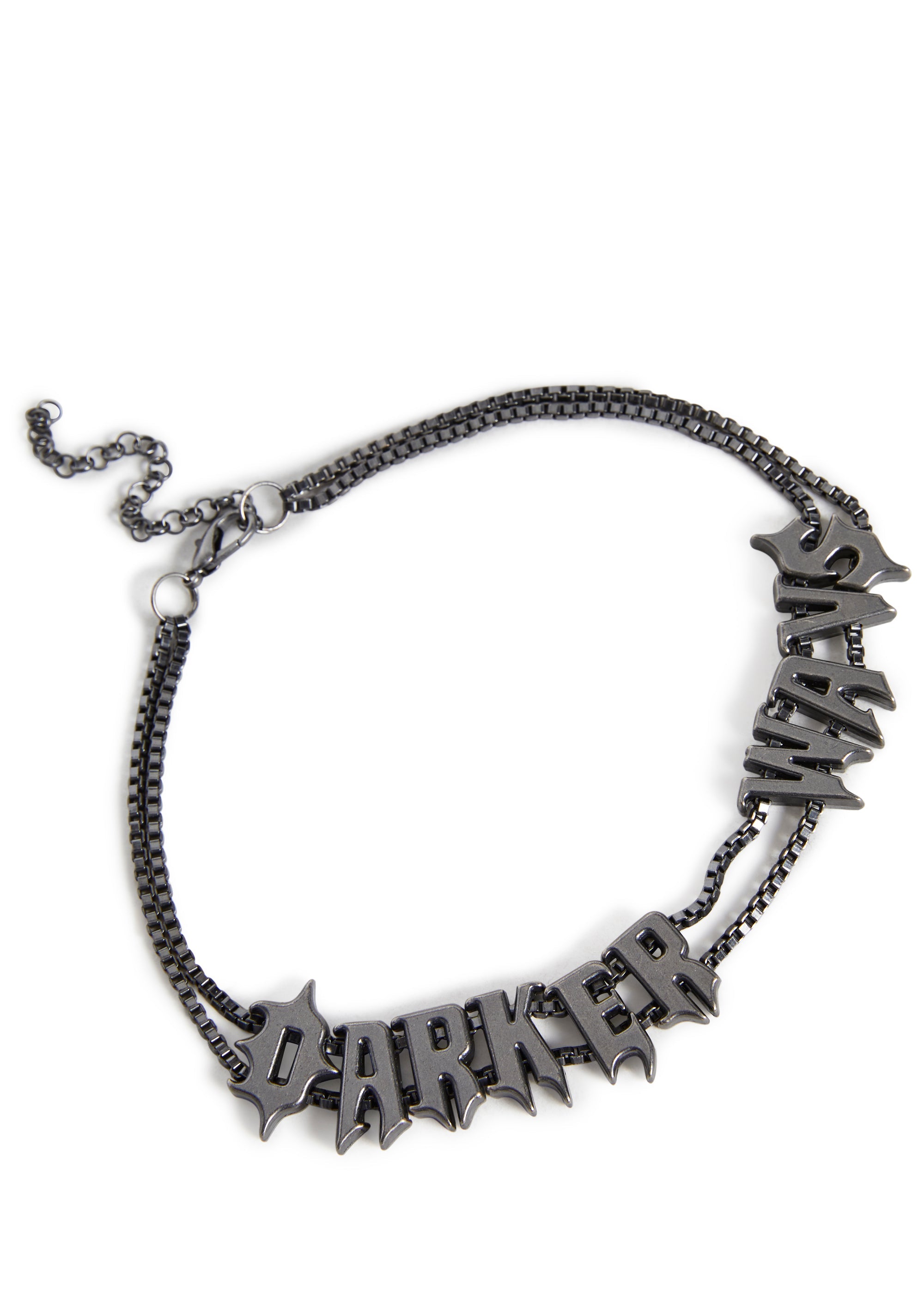 This necklace has a chainlink construction, Darker Wavs logo on the front, and a clasp closure.
