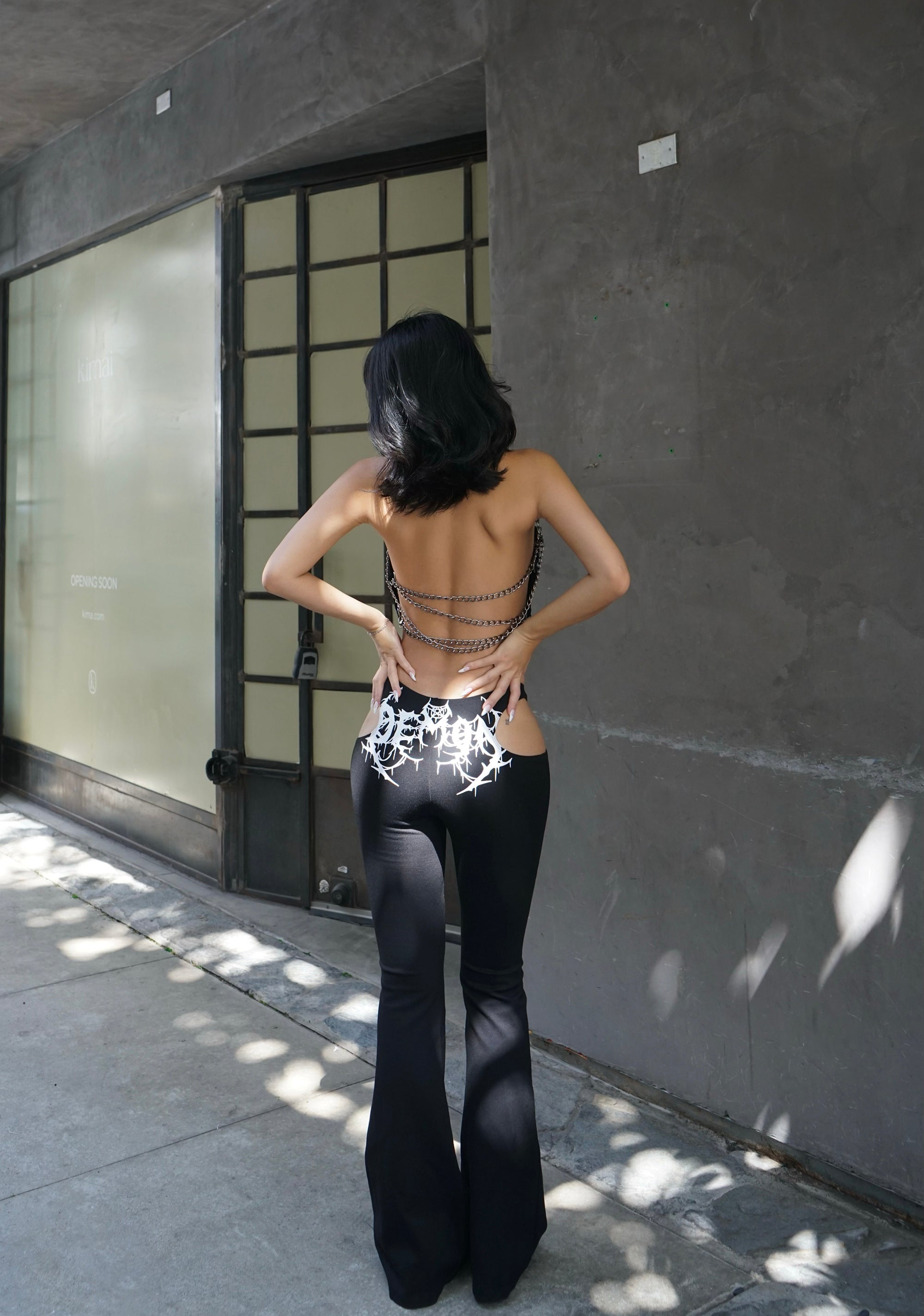 These pants have a stretchy rayon construction, a flared leg silhouette, cut outs on the sides, “Demon” printed on the back, and a front zipper closure with an inverted cross charm.