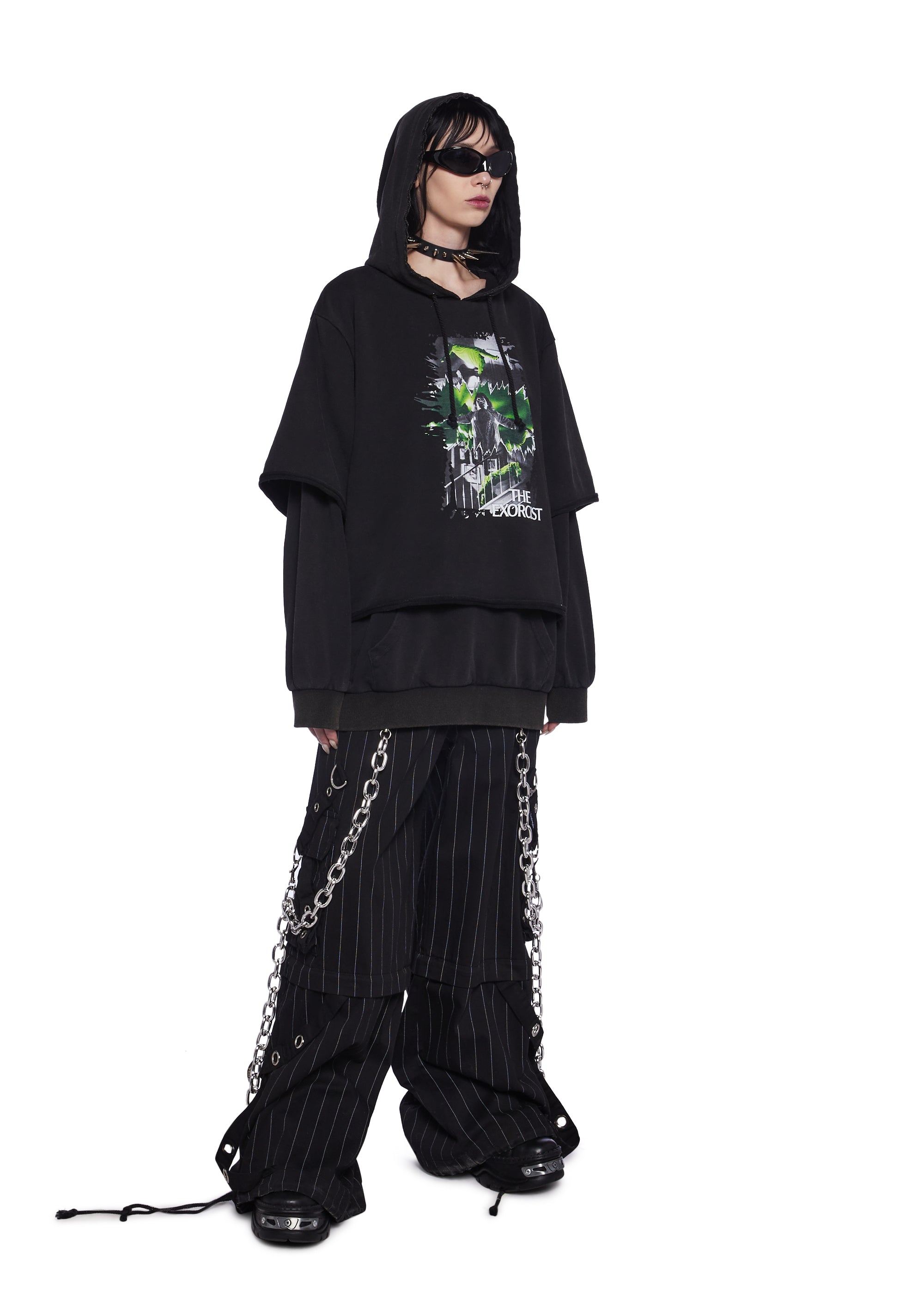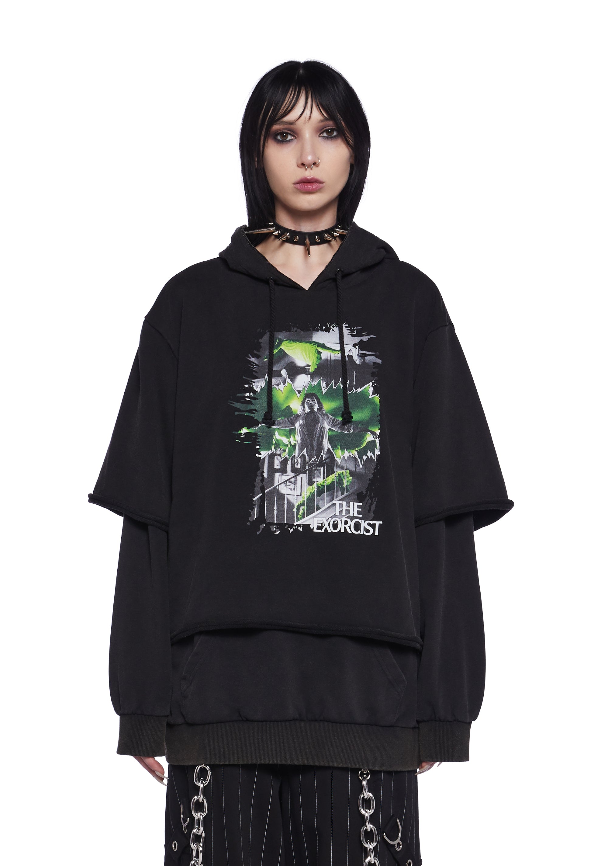 This pullover hoodie has a soft construction with a front graphic print of scenes from The Exorcist, a front kangaroo pocket, and an attached hood with a drawstring closure.