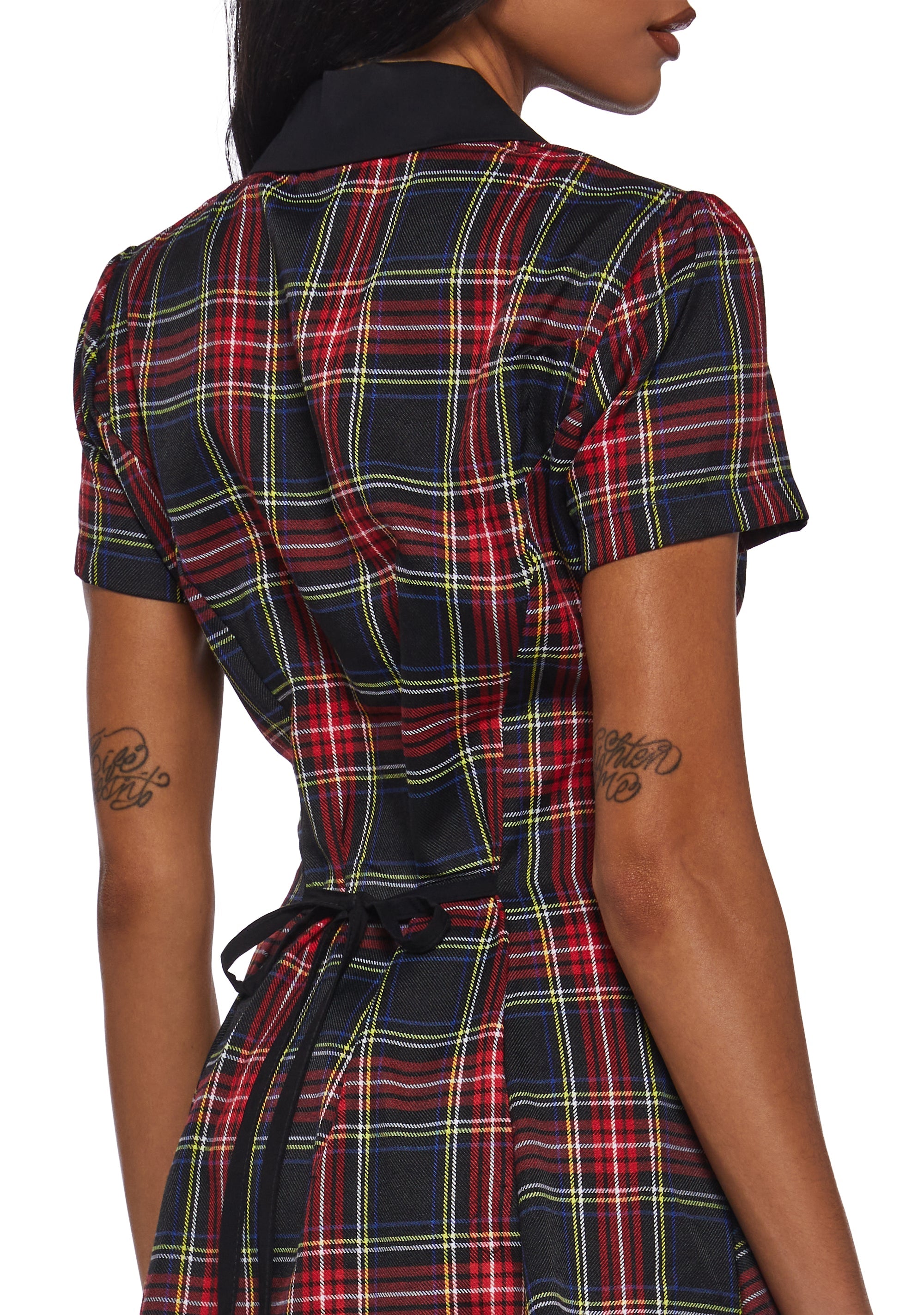 sorry my pedicure ran late. Enter the circle with your corrupt coven in this short sleeve fit & flare dress that has a sinister schoolgirl plaid print all over, contrasting notched lapel, wicked princess seams, and front button closures.