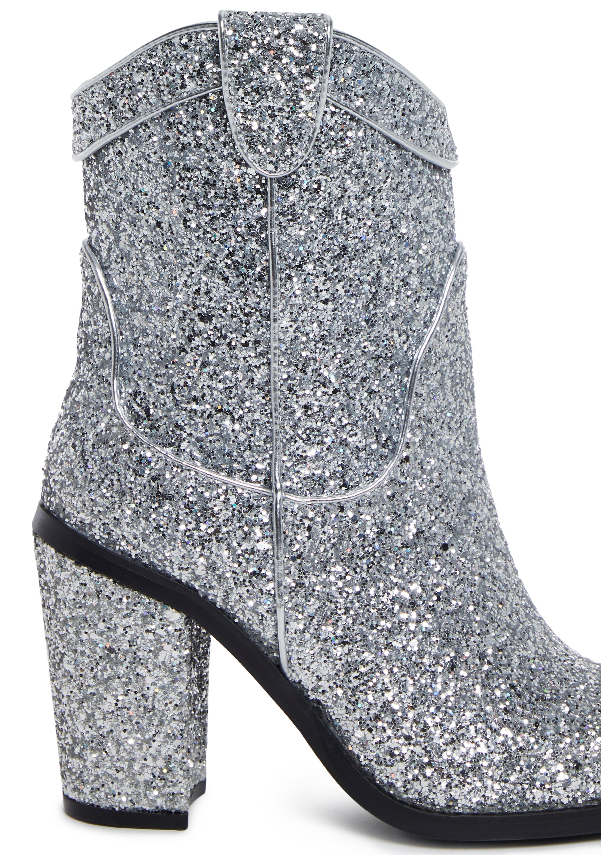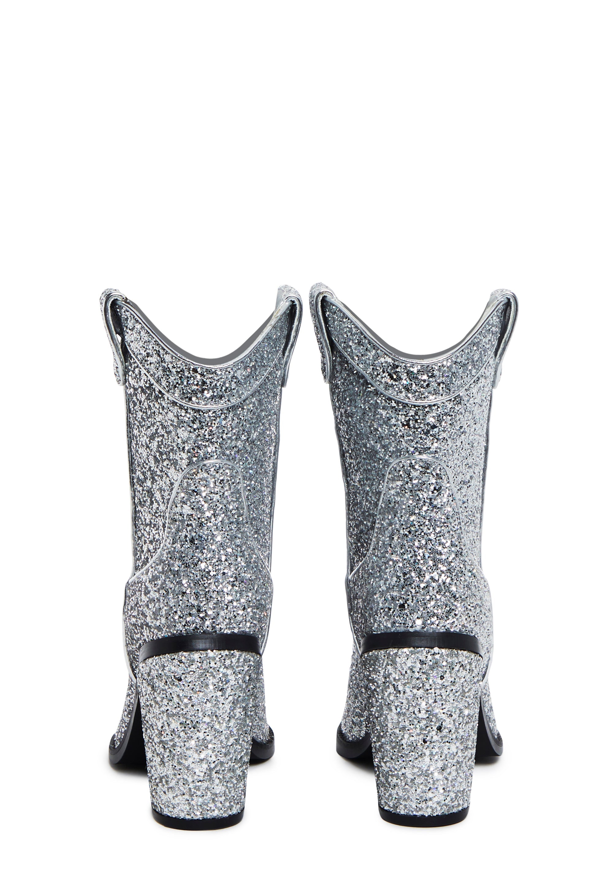 These cowboy boots have an all over glitter construction, a pointed toe design, and a pull-on fit.