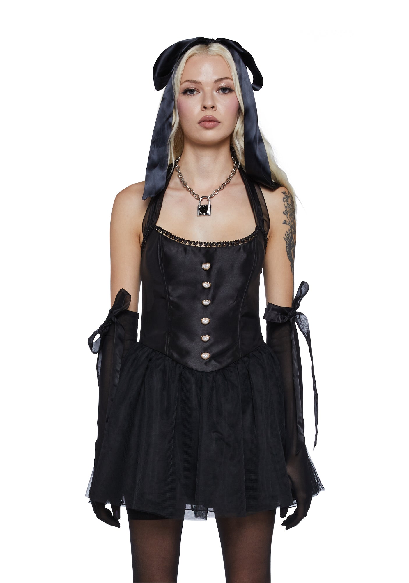 got 'em runnin' through your mind! This mini dress has a satin and mesh construction, adjustable halter ties, heart-shaped lace trim and decorative pearl buttons, adjustable lace-up back ties, a tulle petticoat, and comes with matching sheer gloves with bow appliques.