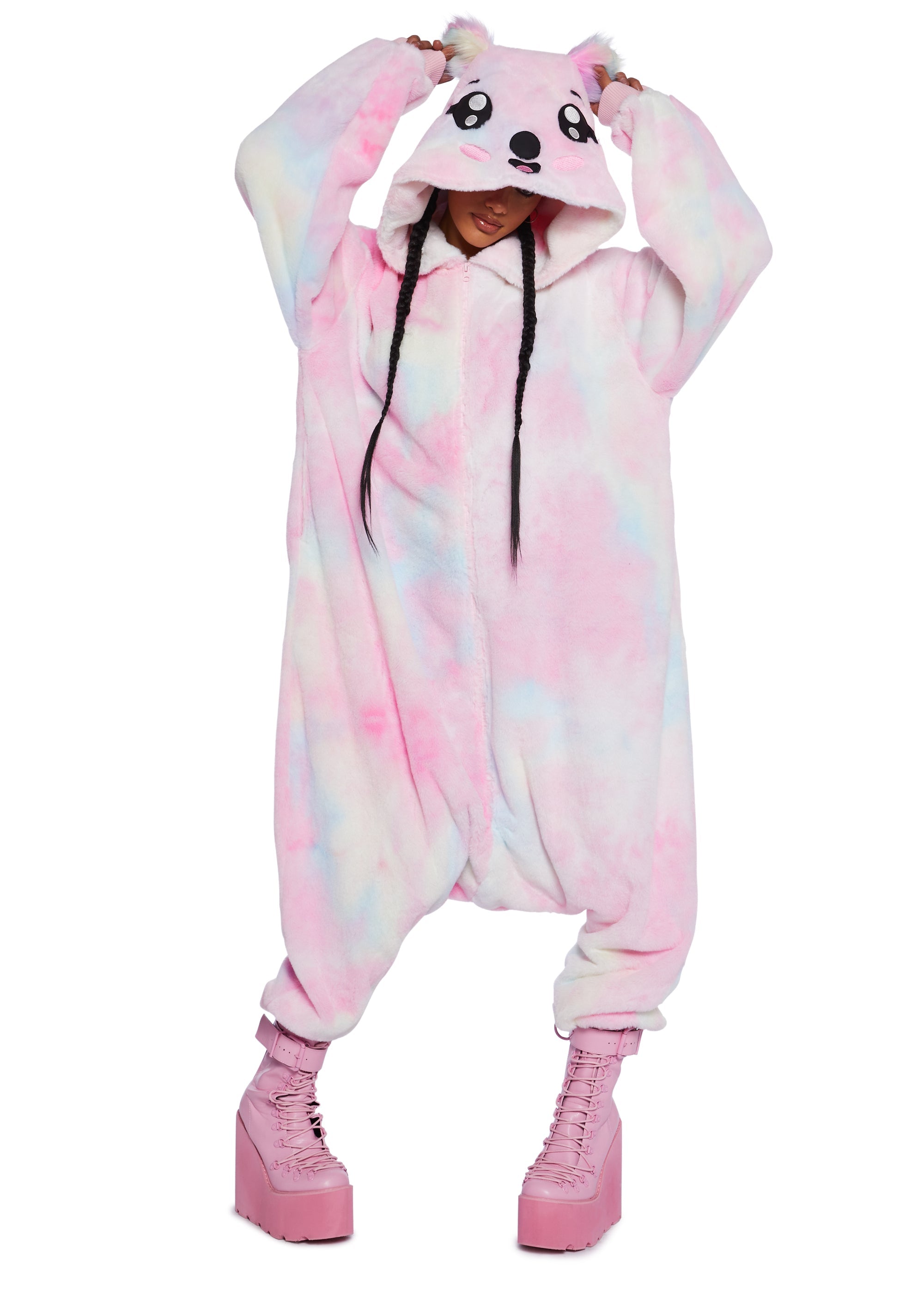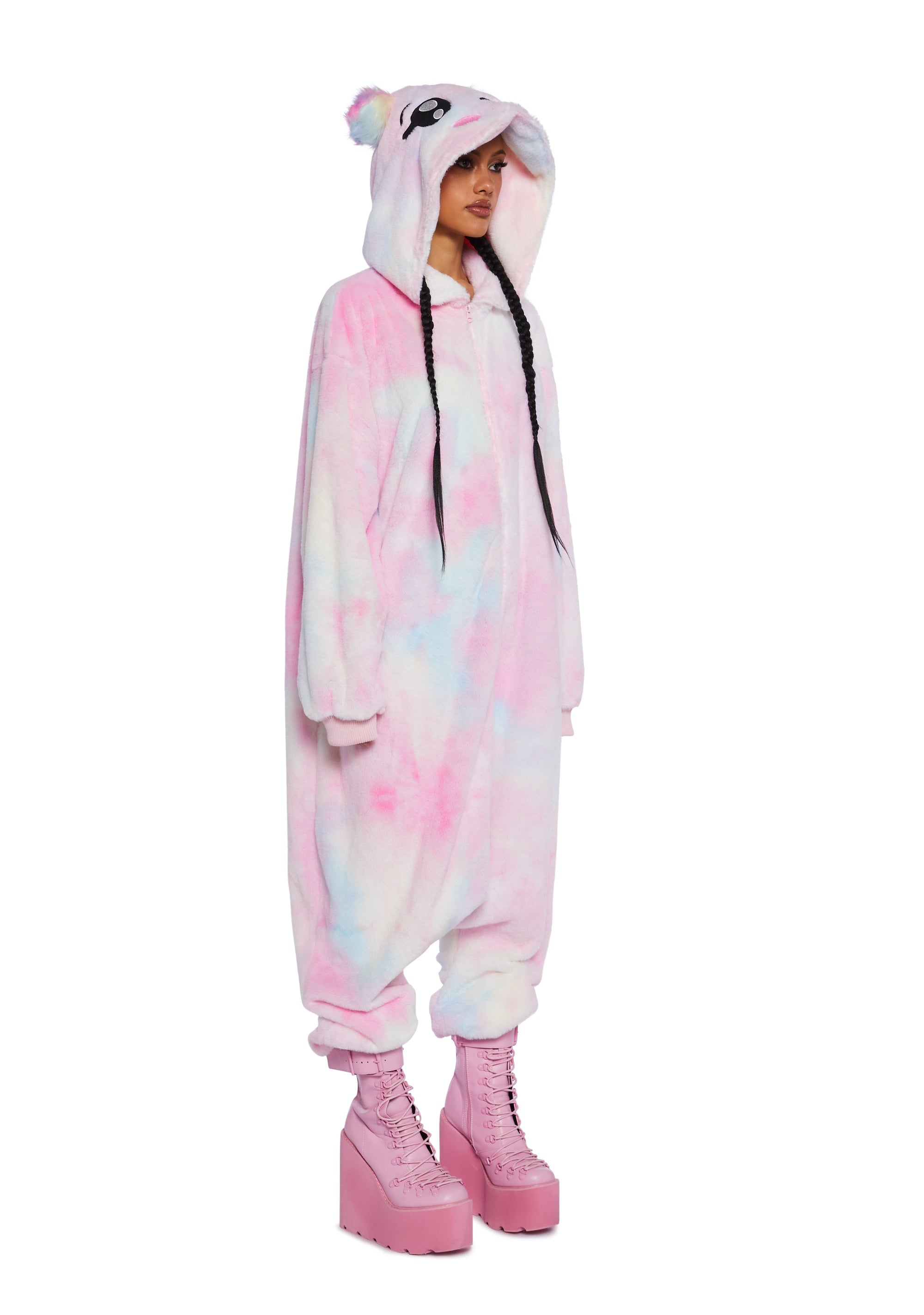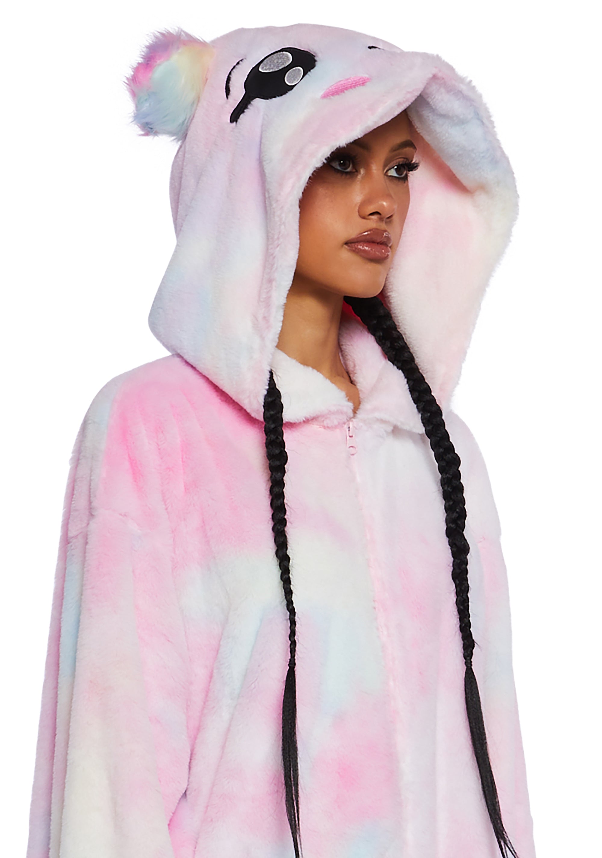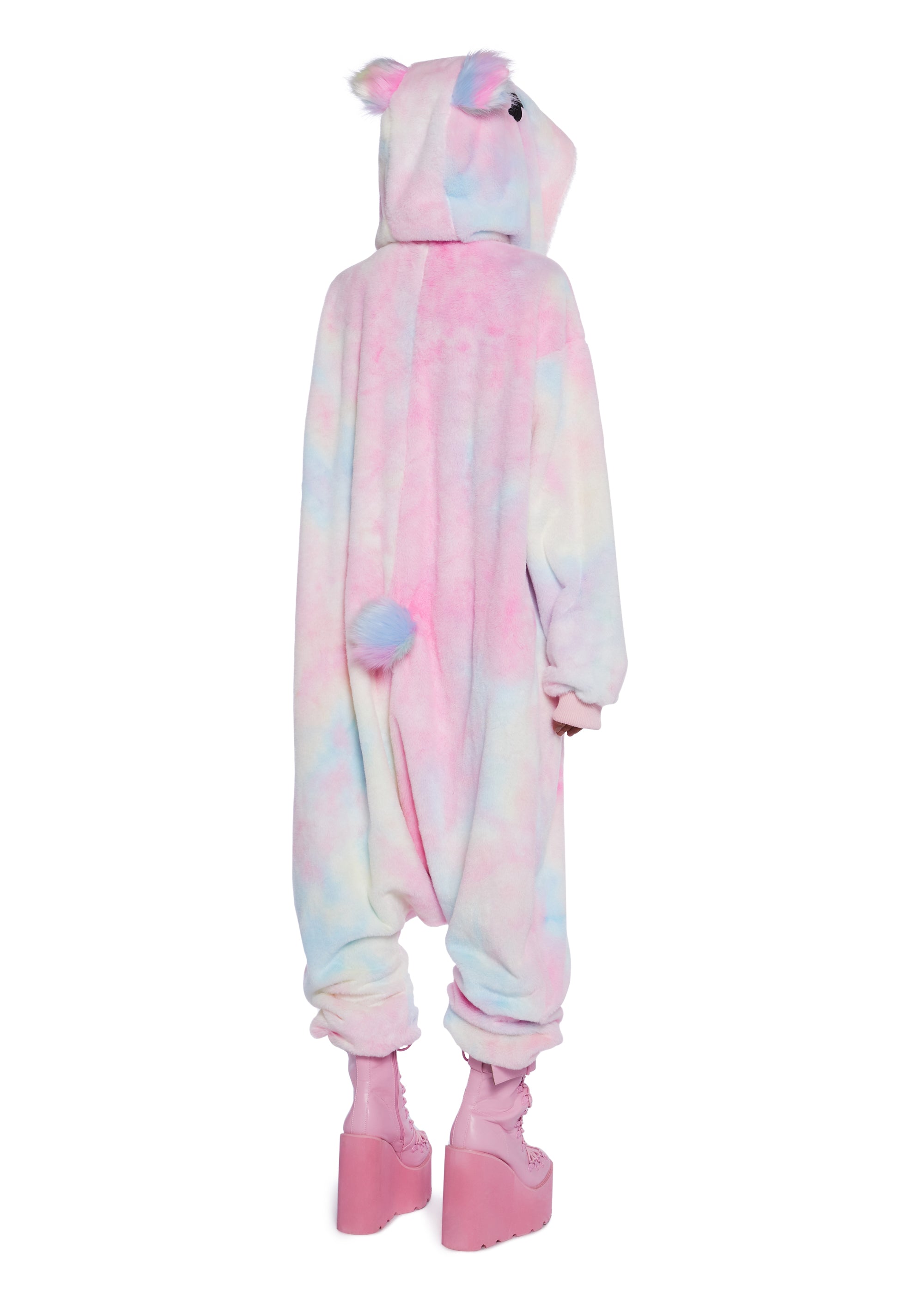 Be your favorite cuddly toy with this onesie that has a plush faux fur construction, an all over ombre rainbow pattern, an attached hoodie with embroidered animal face details, fuzzy ears and tail, side pockets, ribbed cuffs, and a front zipper closure.