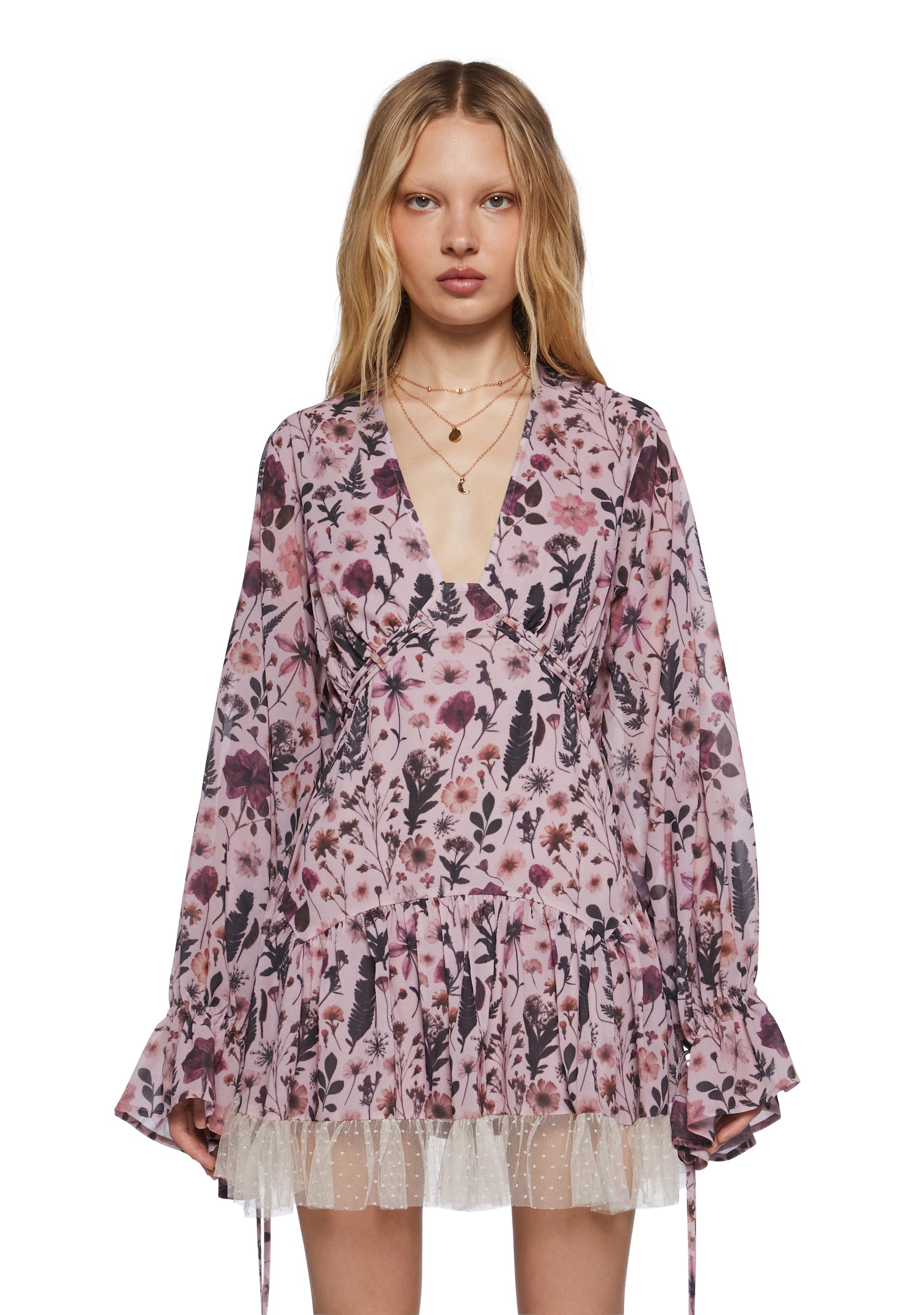 cuz you love the golden hour. This mini dress has a chiffon construction, an all over floral print, flared long sleeves with adjustable ties around the cuffs, a plunging neckline, a contrast colored swiss dot lace hem, an open back with a button loop, adjustable ties around the waistline, and a back zipper closure.