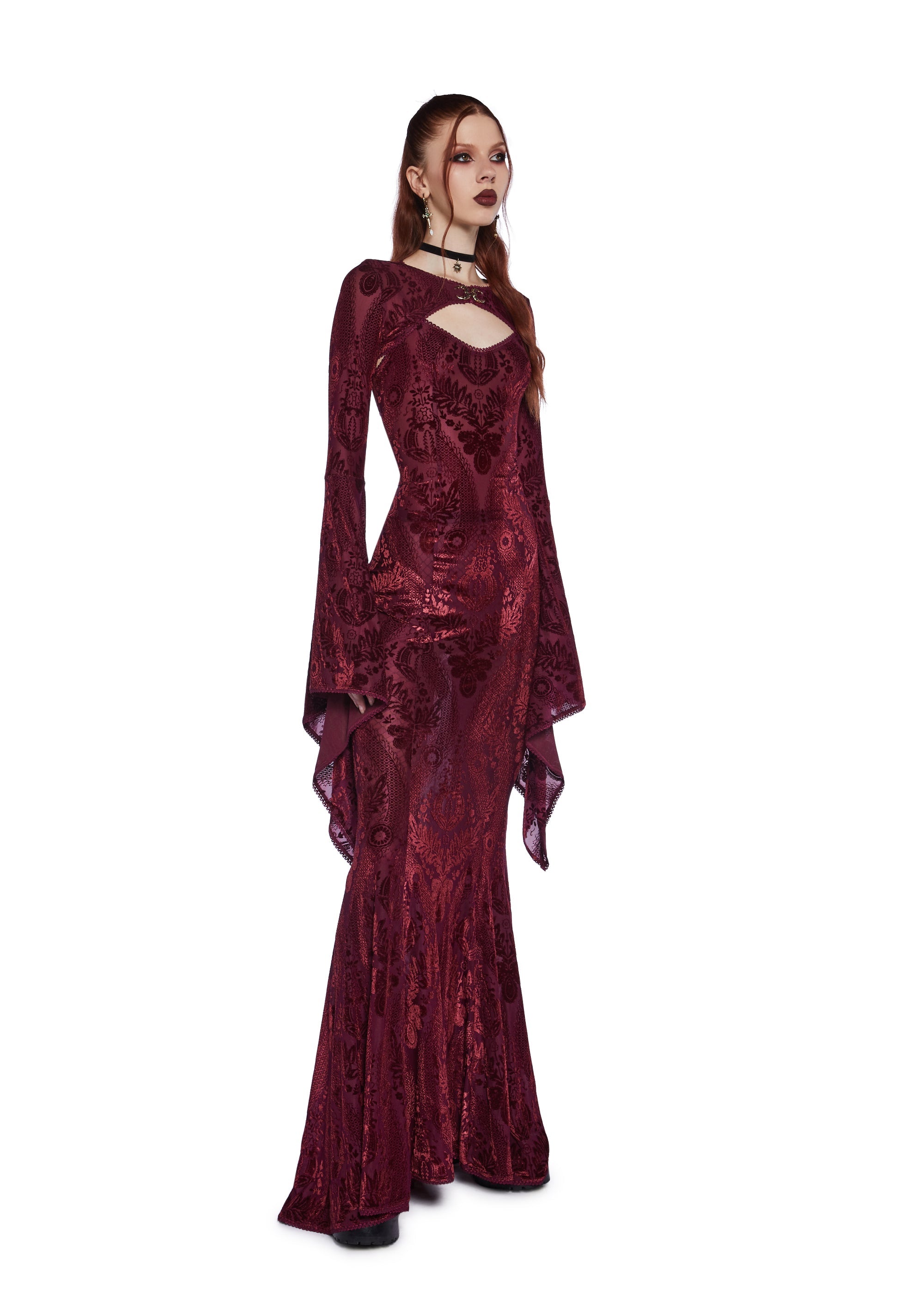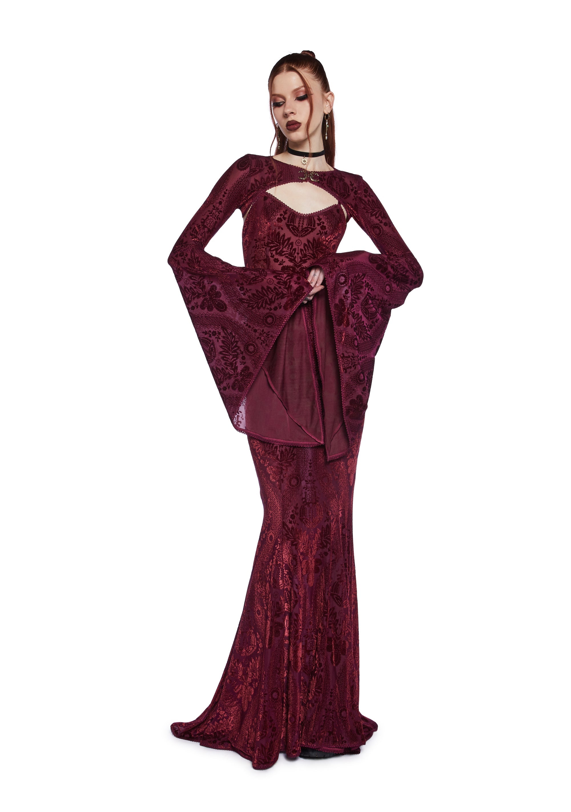 cuz you run this realm. This maxi dress has a semi-sheer stretchy mesh construction, a velvet flocked design, picot trim, adjustable shoulder straps, a back button closure, and a matching long bell sleeve shrug with a moon-shaped charm hook closure.