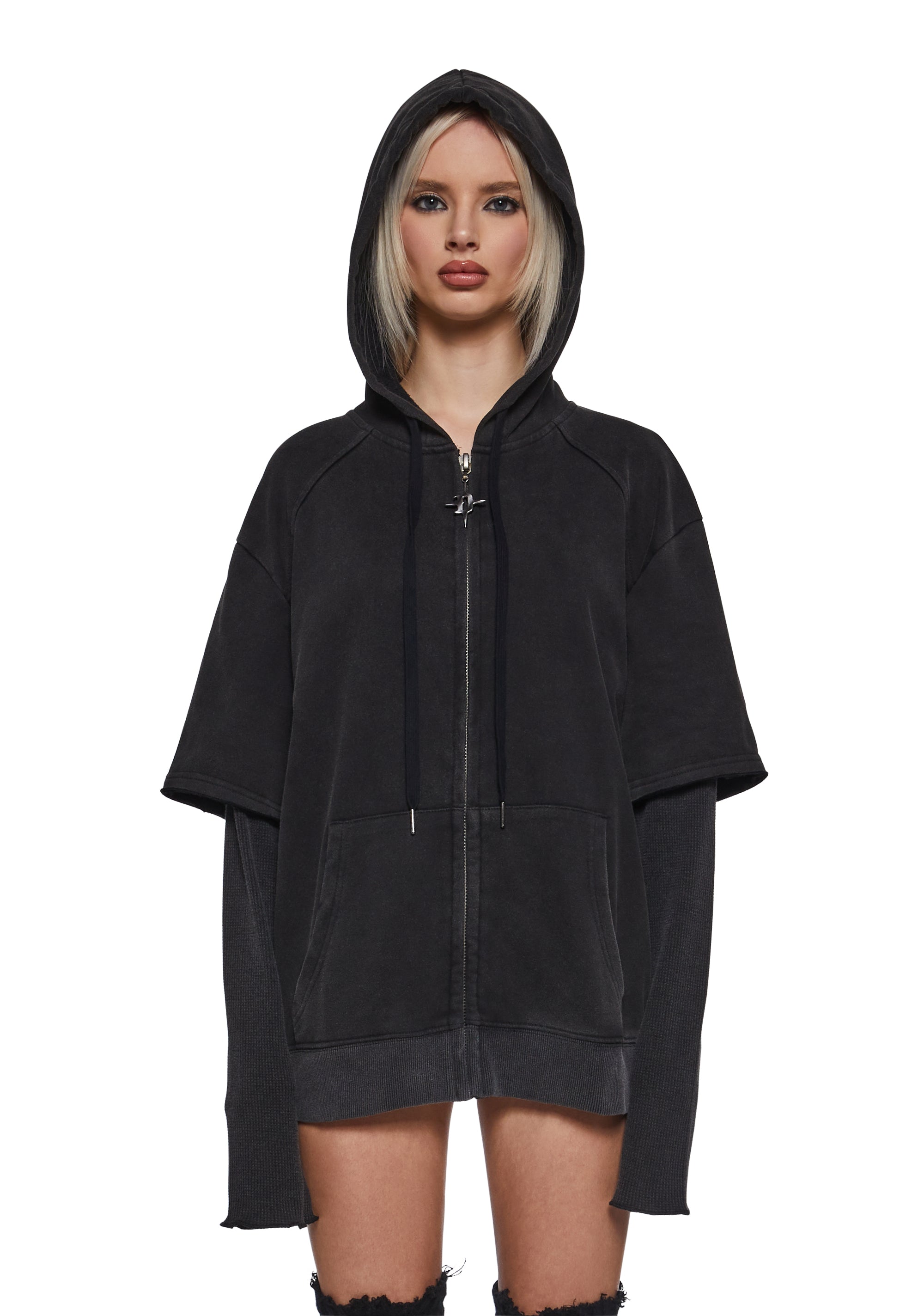 in a stretchy cotton and waffle knit construction with an oversized fit. Drawstring ties, long sleeves, kangaroo pockets, raw edges, Darker Wavs logo on the back, and front zip closure with “D” logo charm.