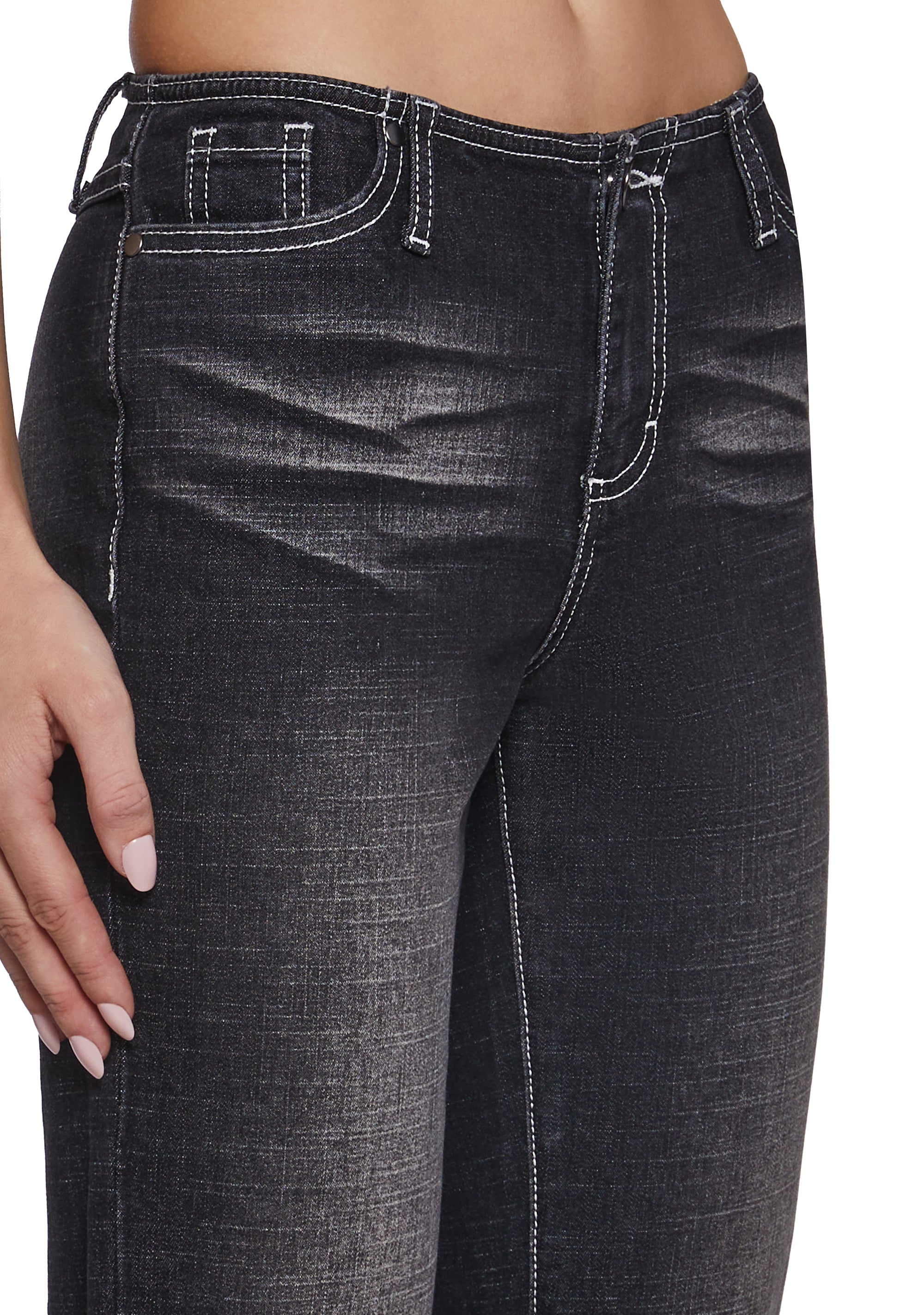 Elevate your everyday denim with these sleek flared jeans, designed to sculpt through the waist and hips before falling into a flattering wide-leg silhouette. Crafted from classic denim with subtle fading, they deliver a timeless yet statement-worthy look that transitions effortlessly from day to night. The mid-rise fit elongates the legs while the structured finish keeps the style polished and versatile.