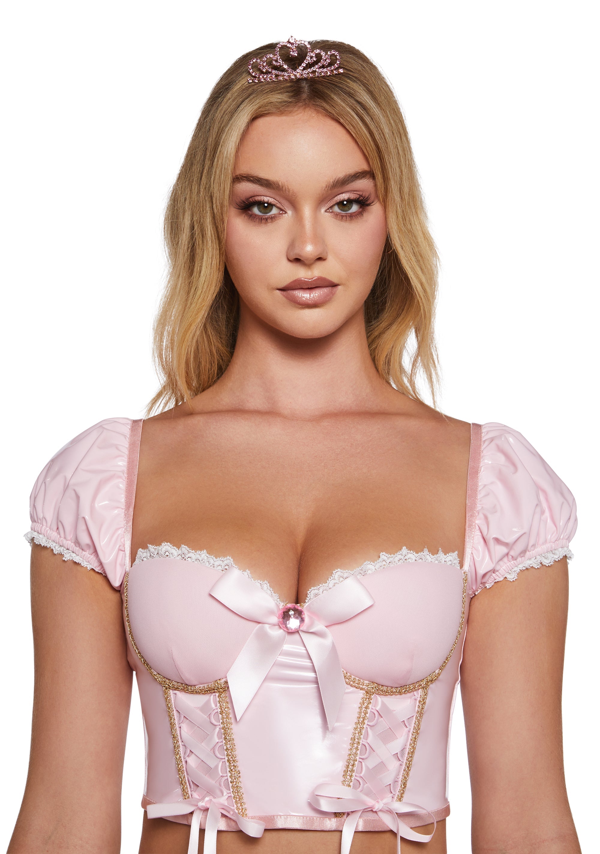 This set is a sweet and sexy fairytale-inspired costume, perfect for Halloween, cosplay, or special nights. It features a shiny pink corset-style top with puff sleeves, lace-up ribbon details, and a satin bow in the center for a charming touch. The matching mini skirt includes lace trim and attached garter straps for a flirty, feminine look. Finished with a sparkling tiara, this pink lingerie set is designed to make you feel like a glamorous princess with a playful twist.