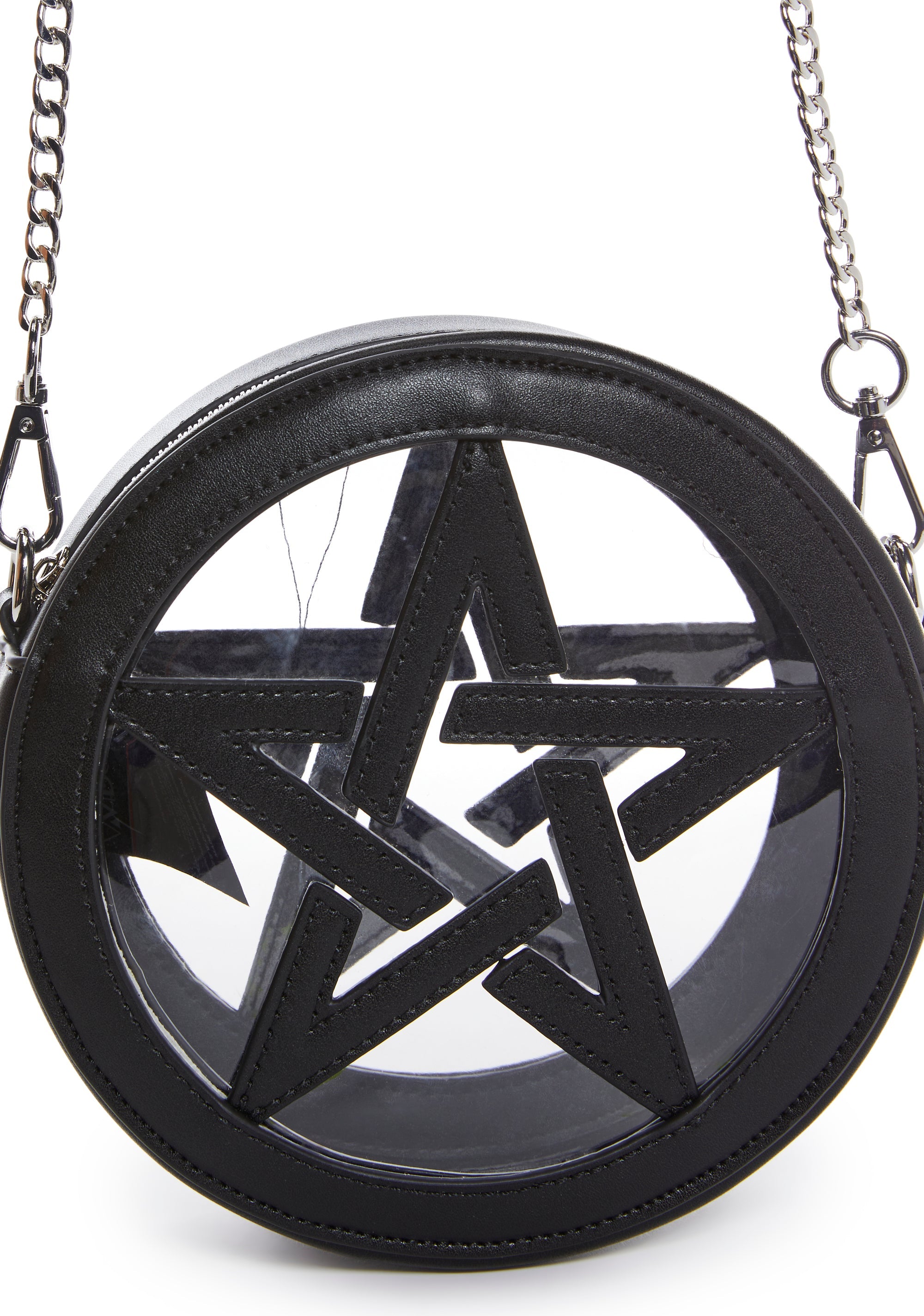 cuz you’re ready for the night. This crossbody has a clear vinyl and vegan leather construction with a pentagram design, a removable shoulder strap, and a top zipper closure.