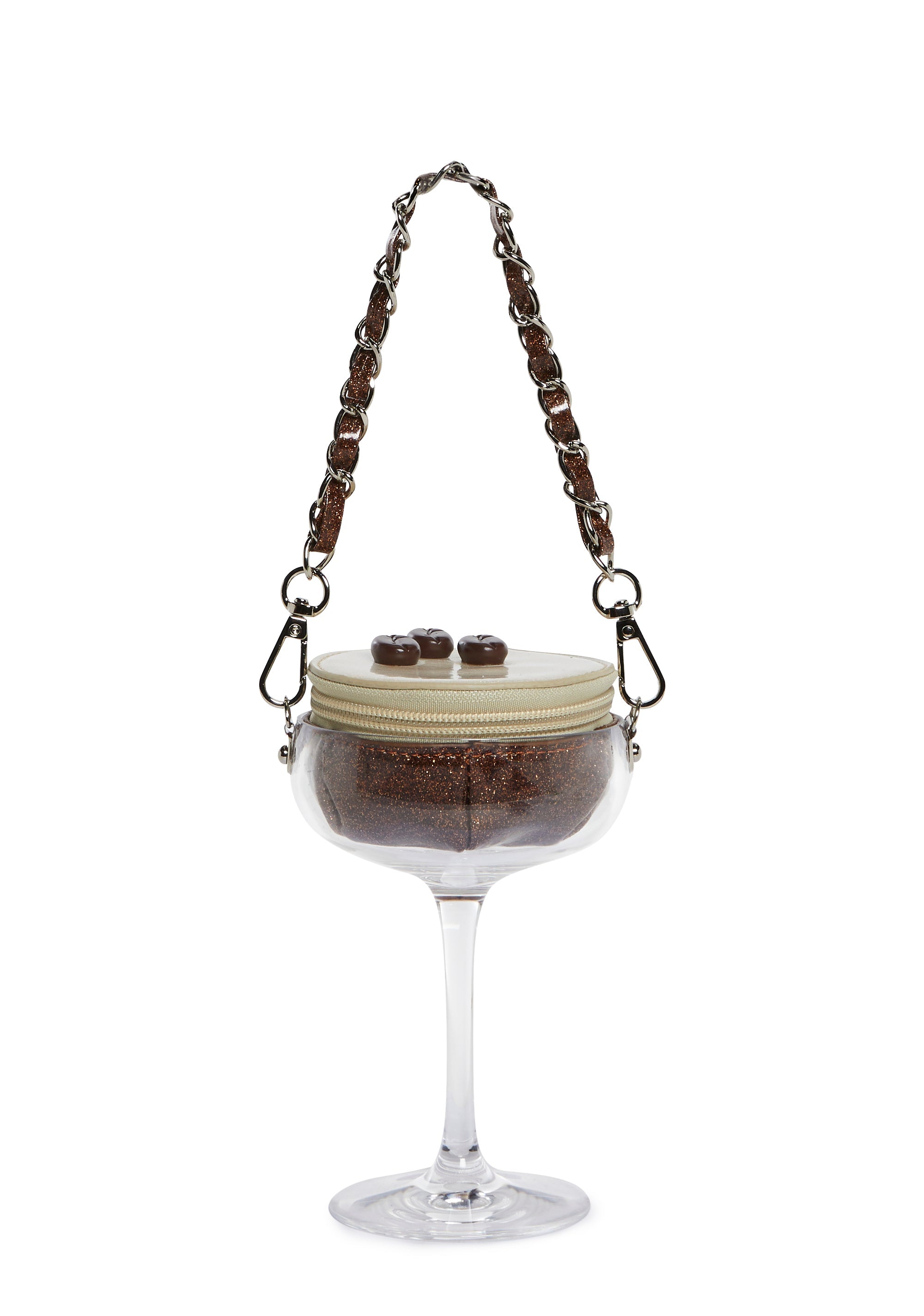 You just know you’re that girl with this espresso martini-shaped handbag, featuring a plastic glass base, a patent leather top, espresso bean appliqués, a detachable vegan leather and metal chain wrist strap, and a top zip-around closure.