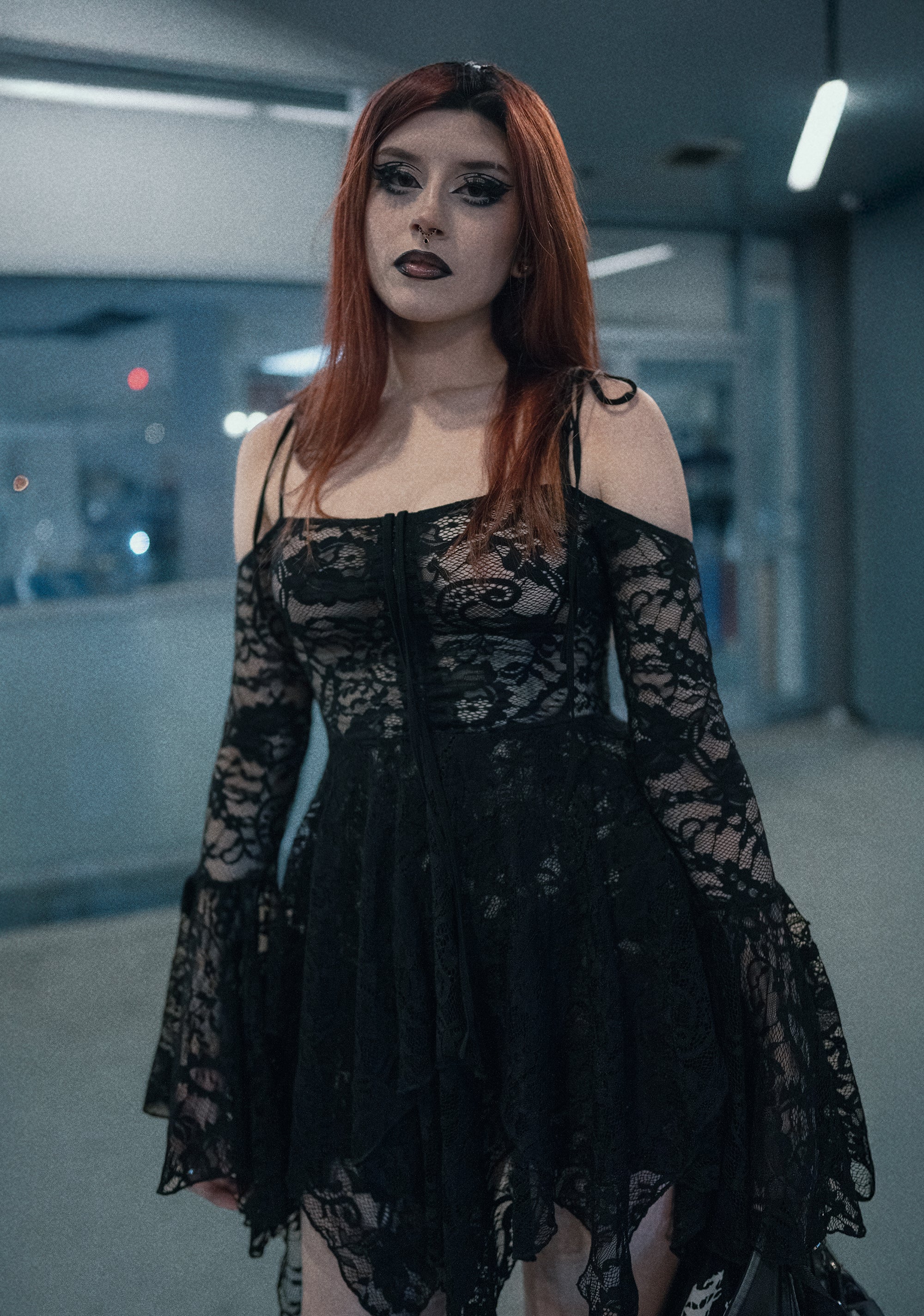 cuz you make this world magical. This mini dress comes with off the shoulder sleeves, spaghetti straps with tie closures, ruching at the chest with a tie closure, a lace construction, and a handkerchief detail, hem, and cuffs.