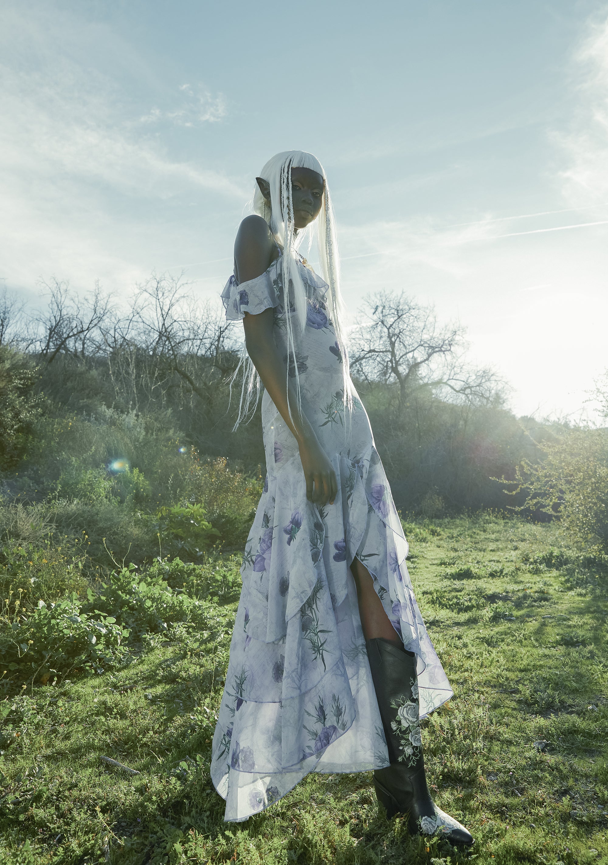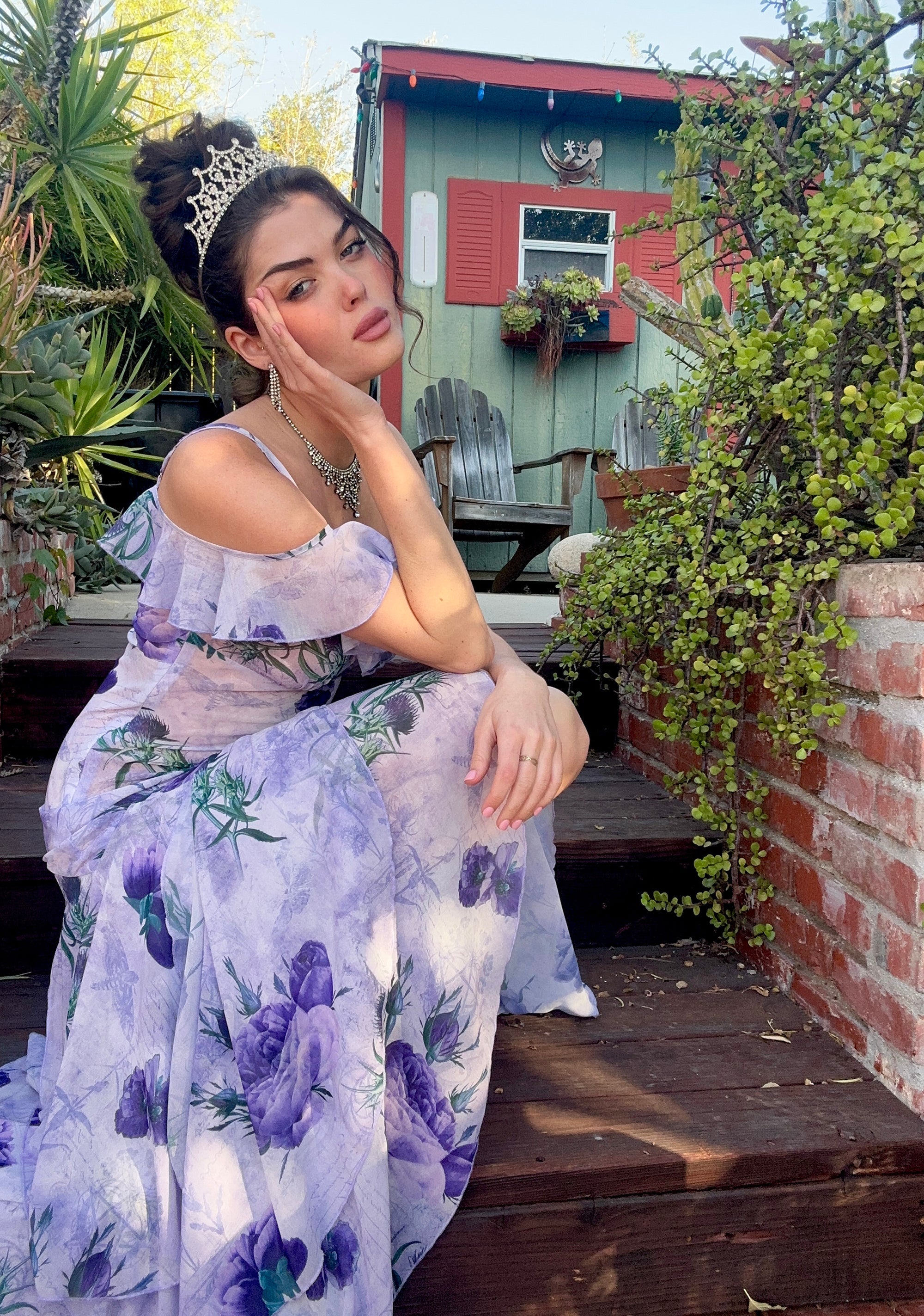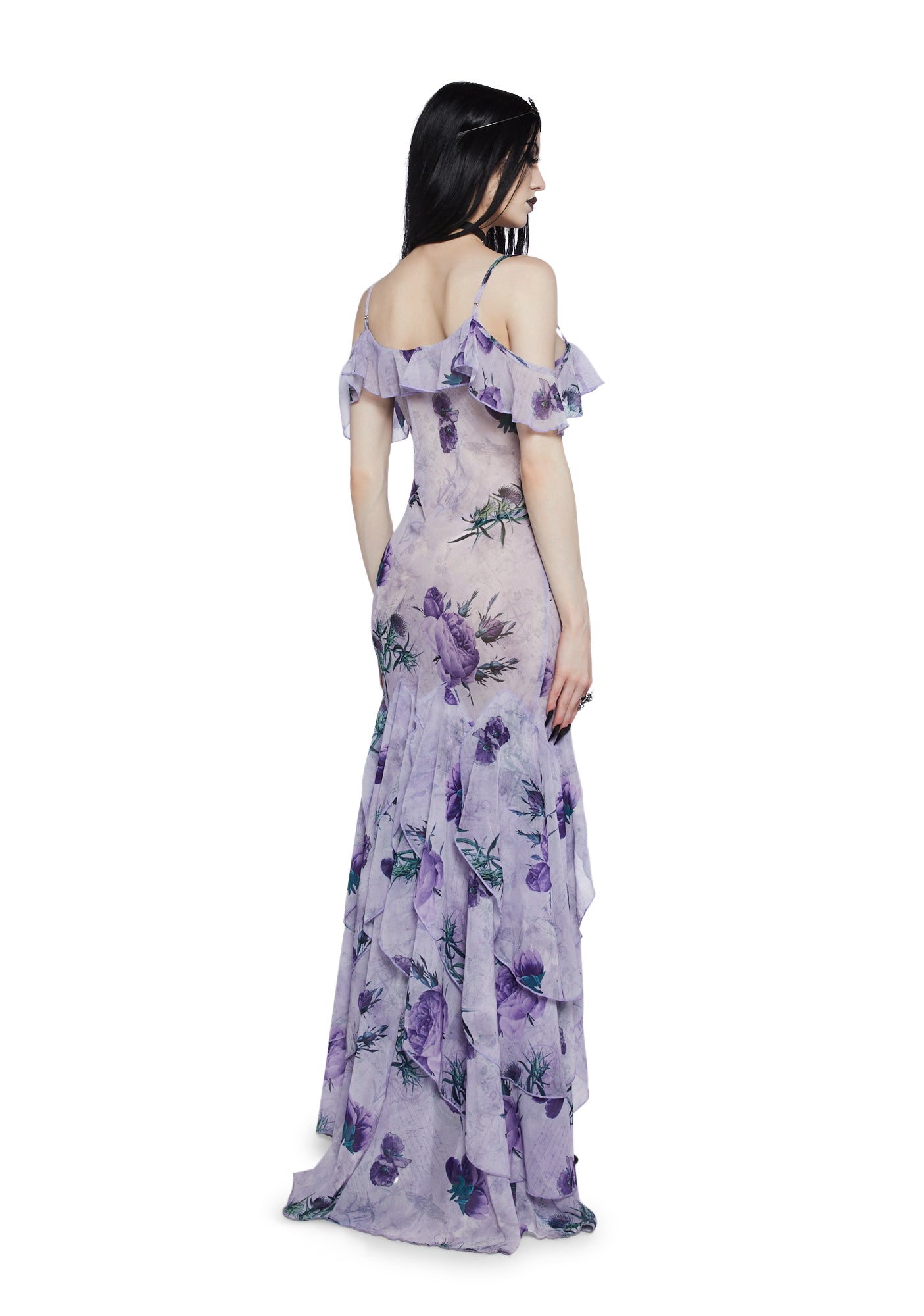cuz make it last. This maxi dress has an all over floral print, a semi sheer chiffon construction, an off the shoulder design, adjustable shoulder straps, a ruffled tiered maxi skirt, a front slit, and a side zipper closure.
