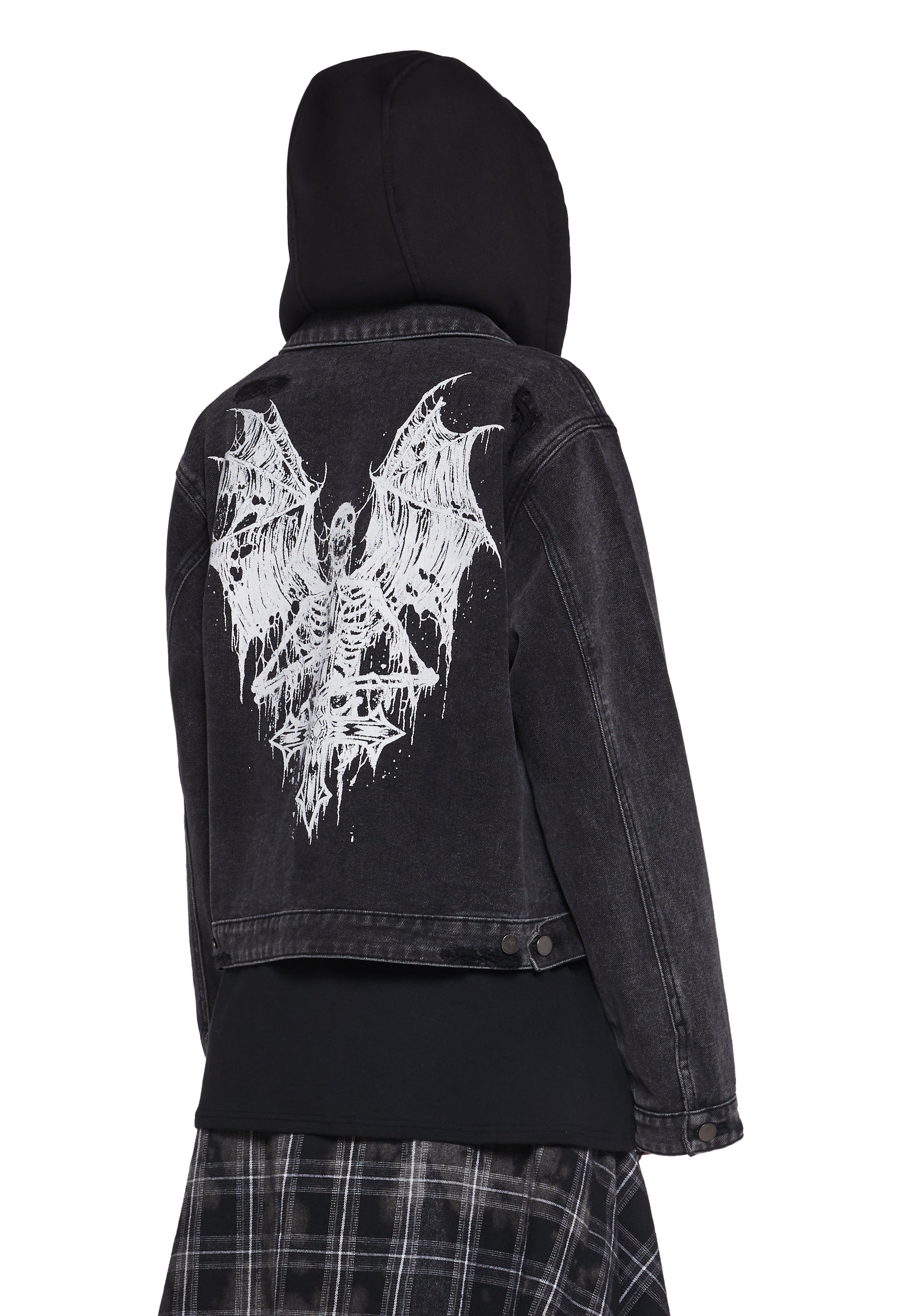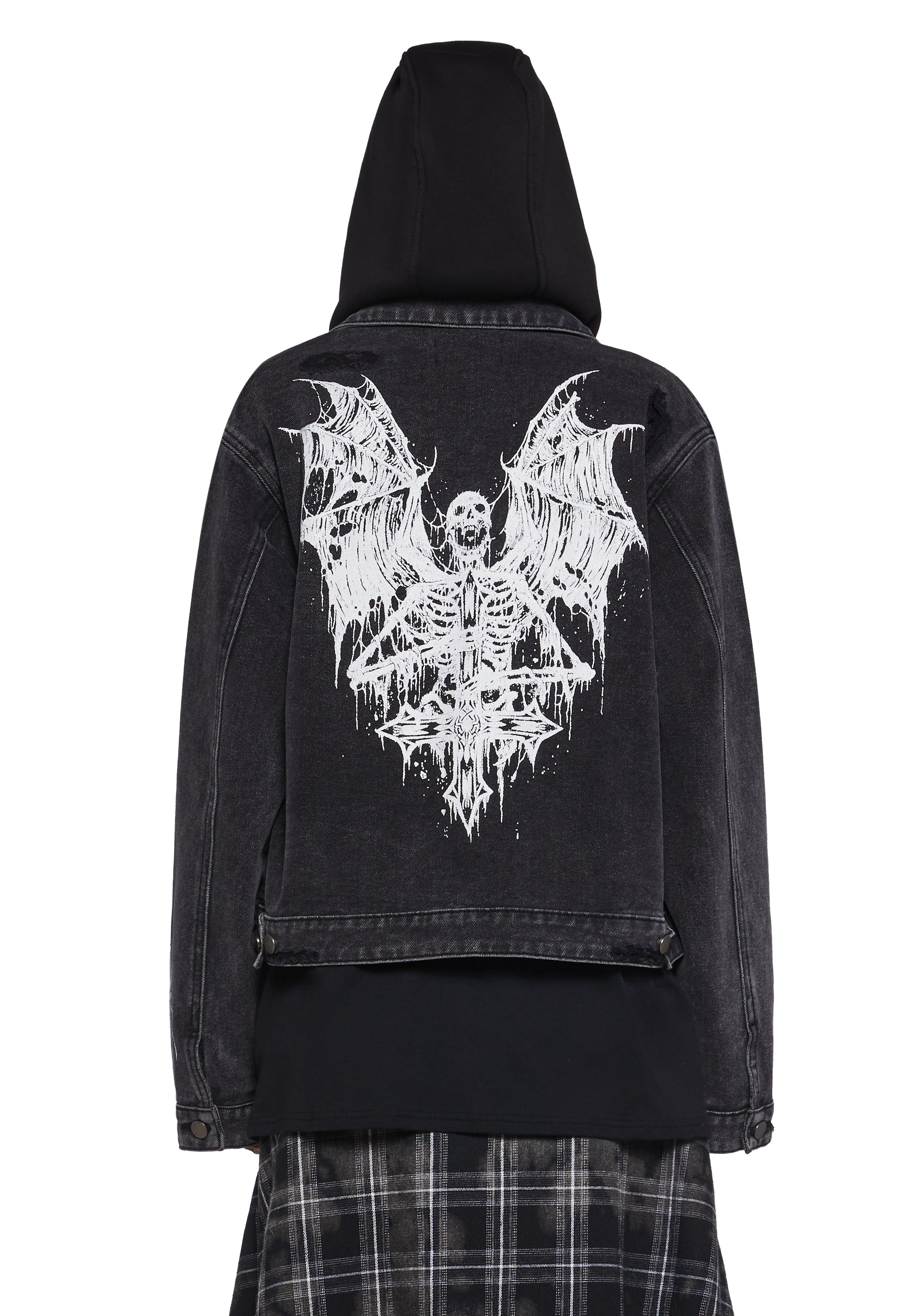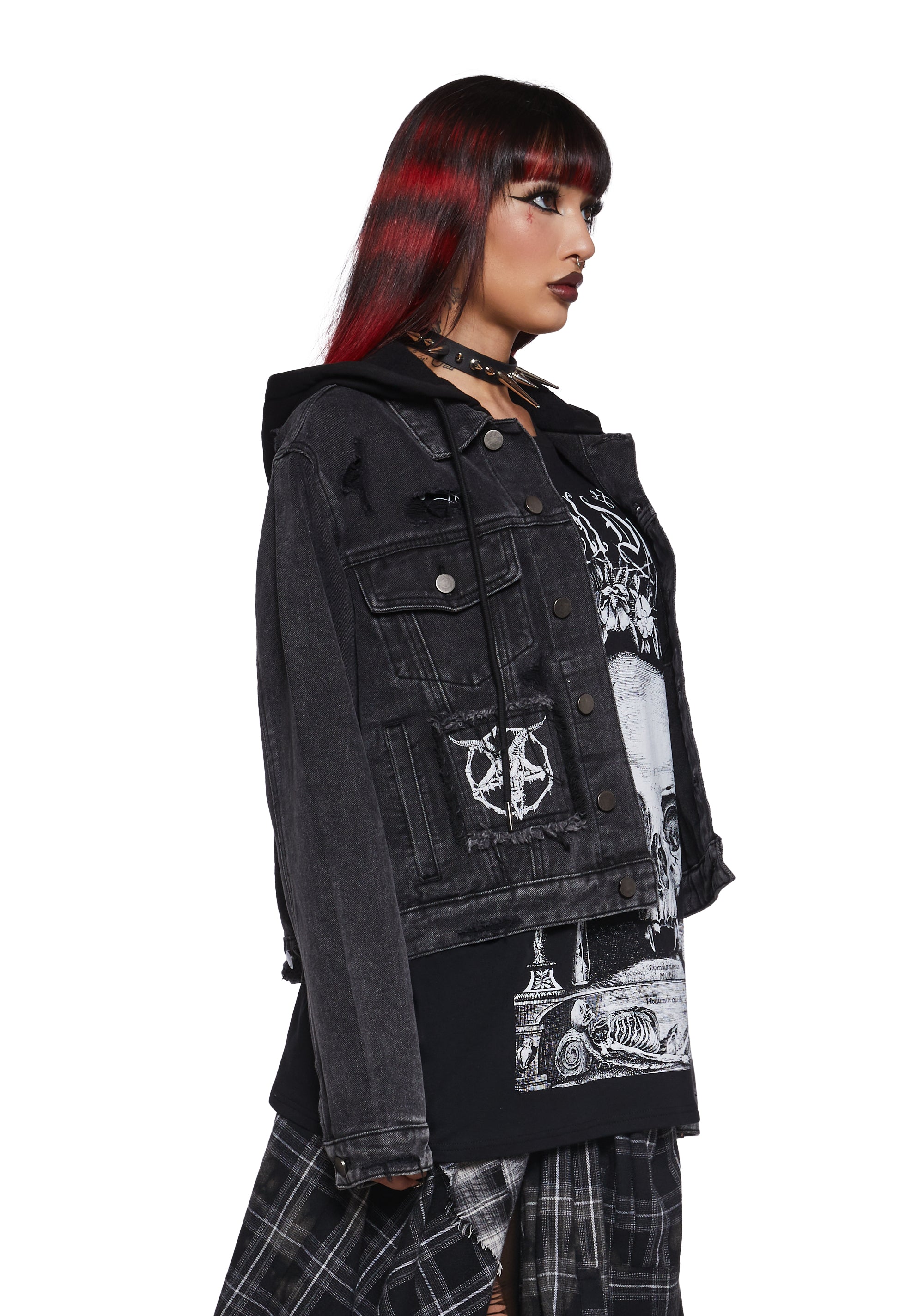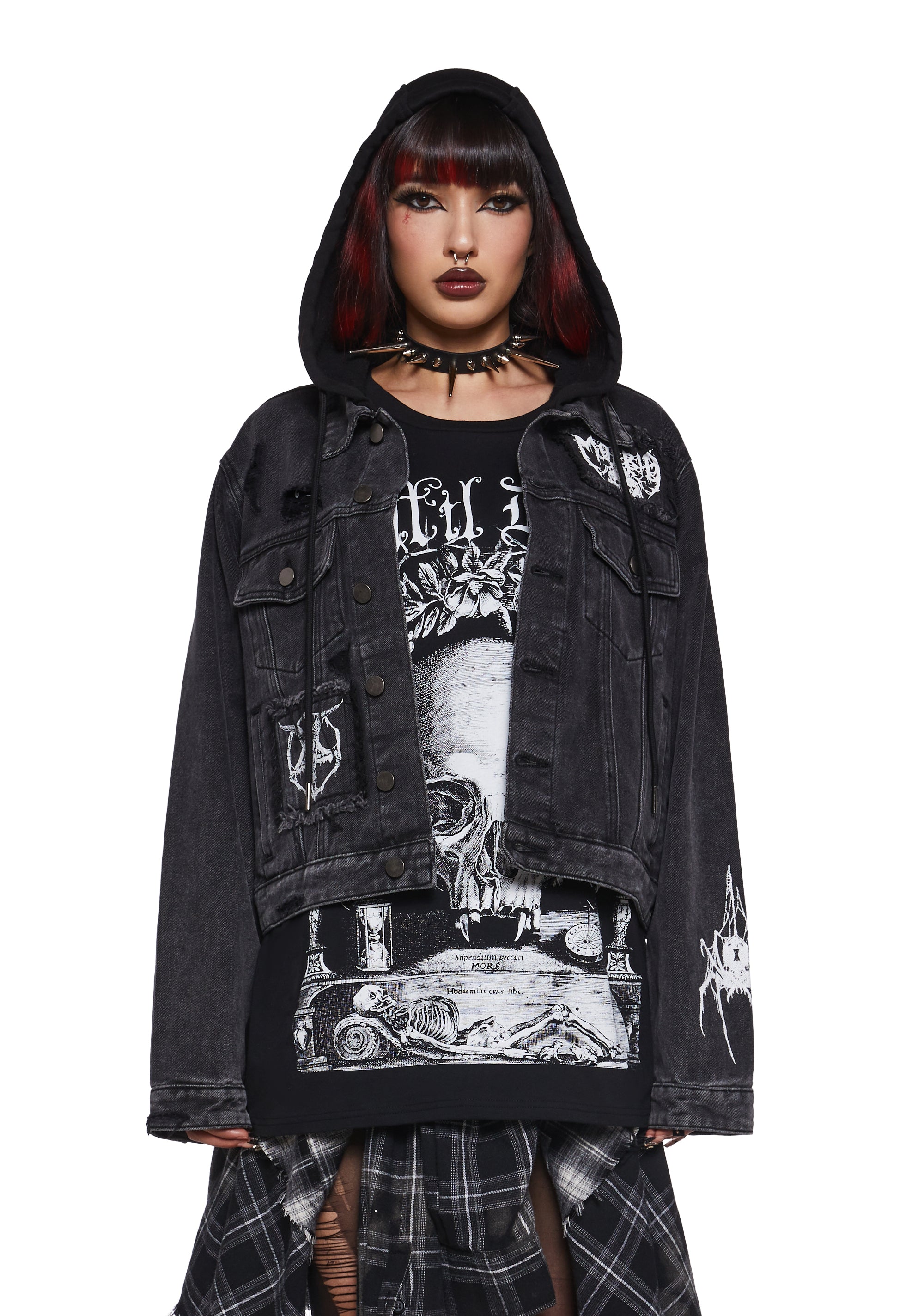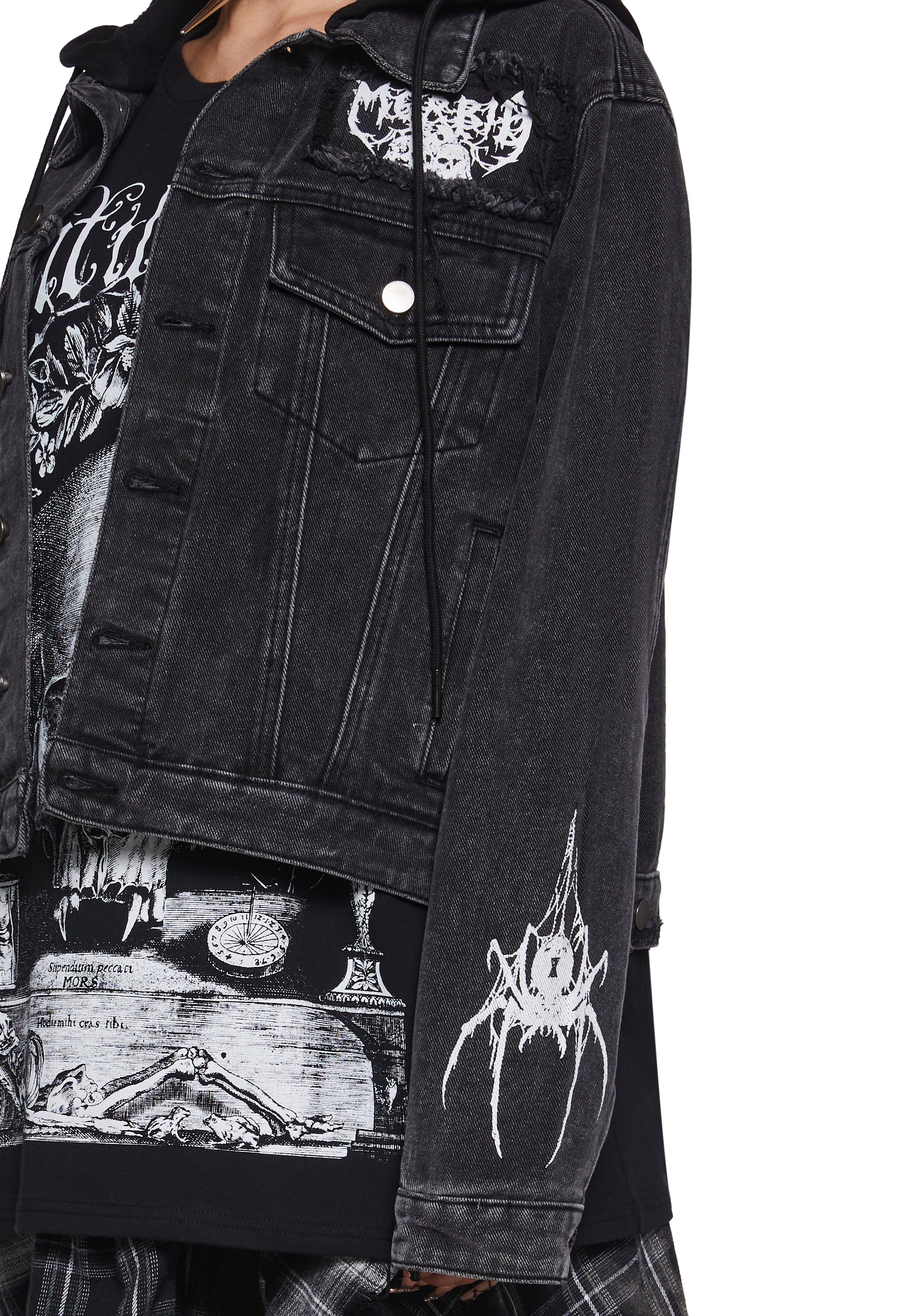 This jacket has a washed denim construction with an attached knit drawstring hood, a distressed design, front pockets with button closures, side pockets, a front patch of Baphomet, a skull patch with the word 'Morbid,' a black widow graphic on one sleeve, a back graphic of a skeleton demon with an upside-down cross, and front button closures.