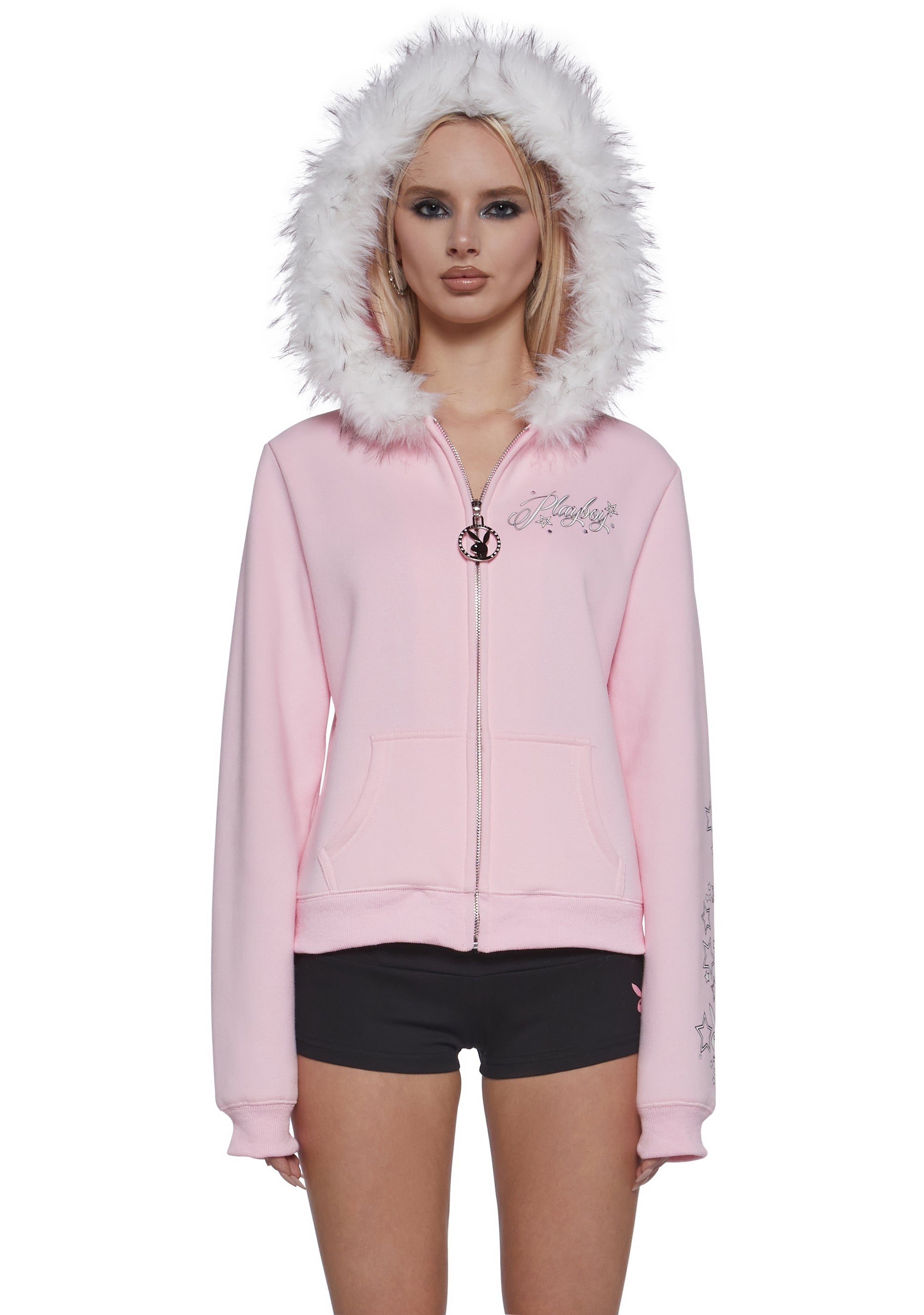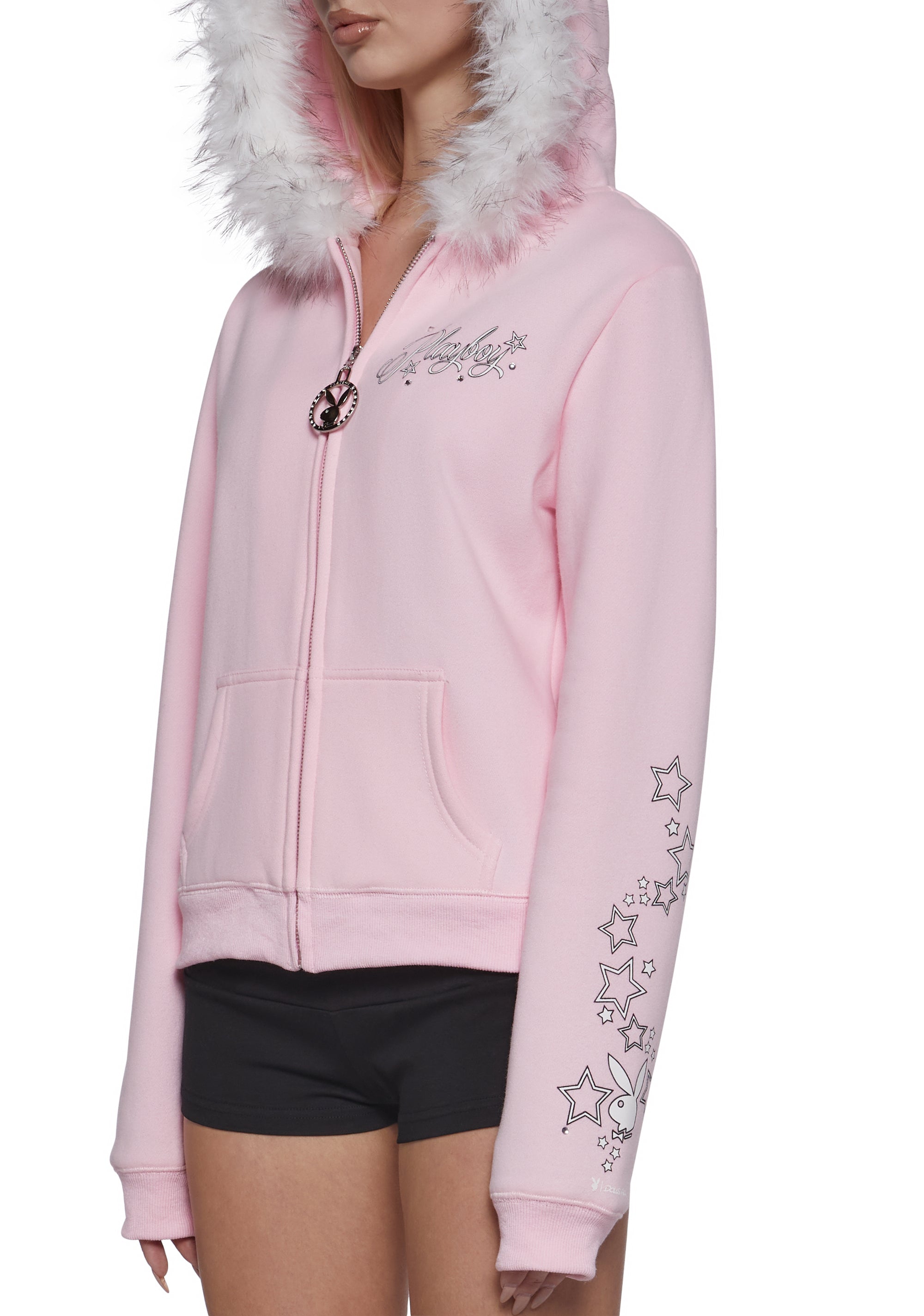 This hoodie has a super soft cotton construction, Playboy logo printed on chest and back, kangaroo pockets, Playboy bunny and star graphics on one sleeve, an attached hoodie with a faux fur trim, and a top zipper closure with Playboy bunny logo charm.