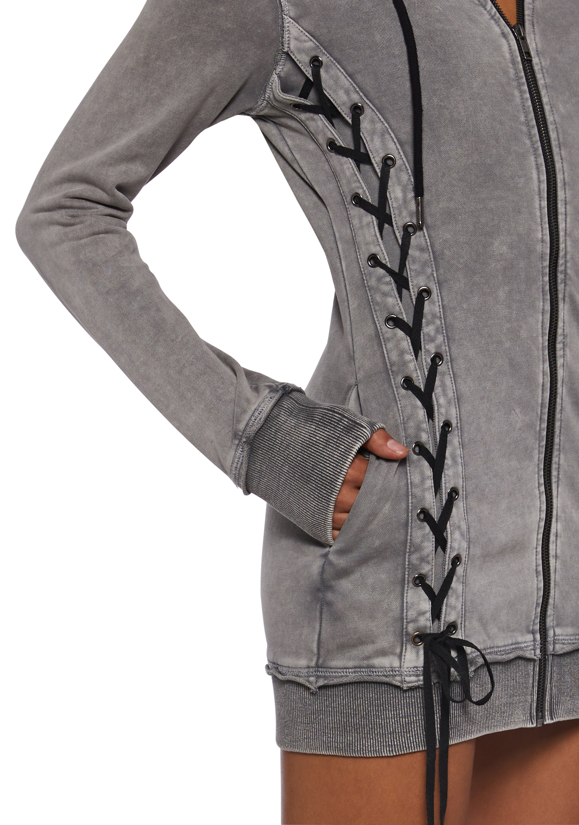This mini dress has a washed cotton construction, a ribbed trim, contrast colored lace up details on the front, long sleeves, an attached hoodie with adjustable drawstring closures, and a front zipper closure.
