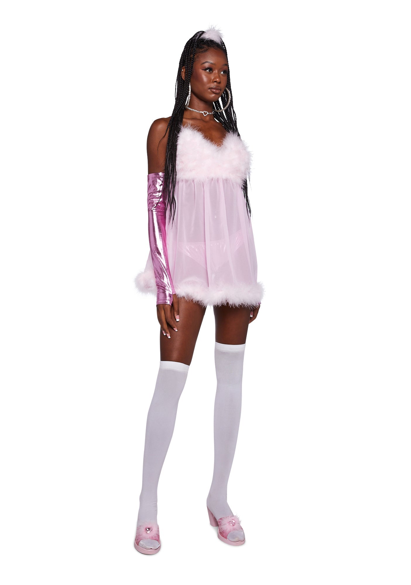 This three-piece set includes a sheer nightie dress adorned with feather trim, metallic fingerless gloves, and matching cheeky panties. It's perfect for themed parties, cosplay, or a bold Halloween statement.